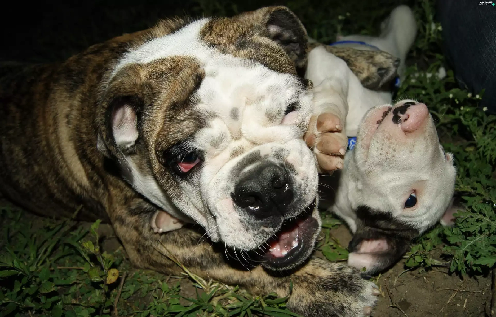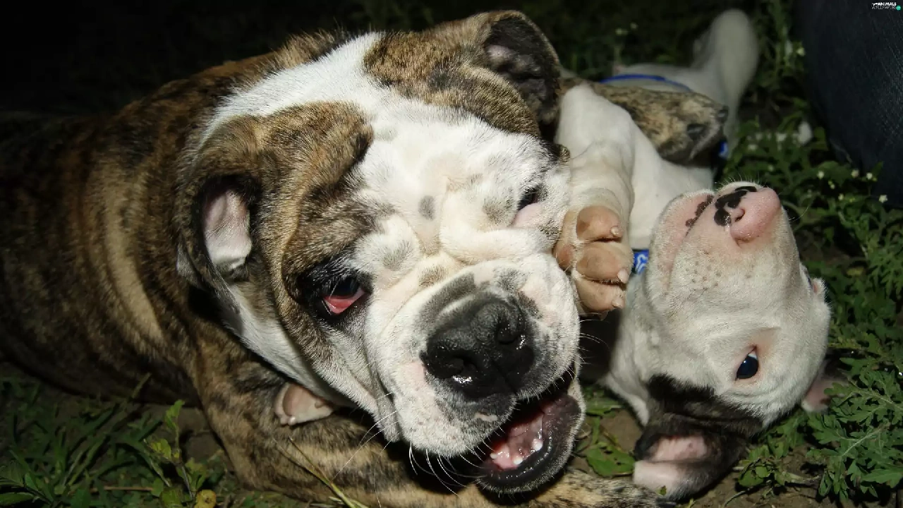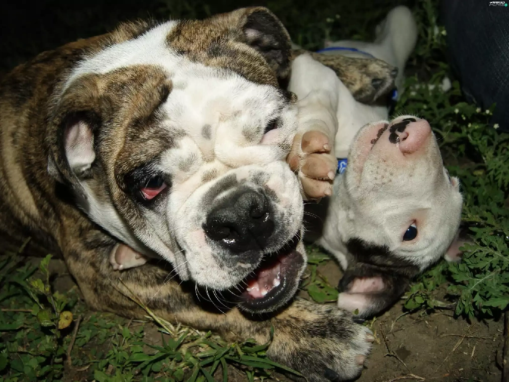 play, English Bulldog, grass