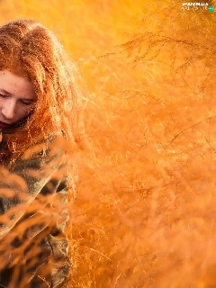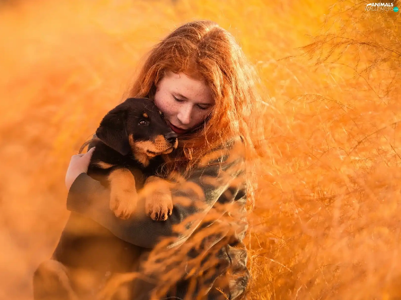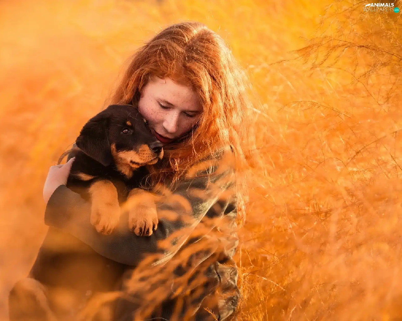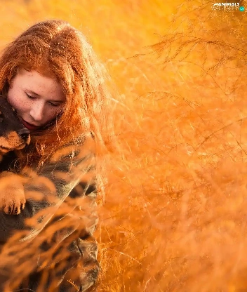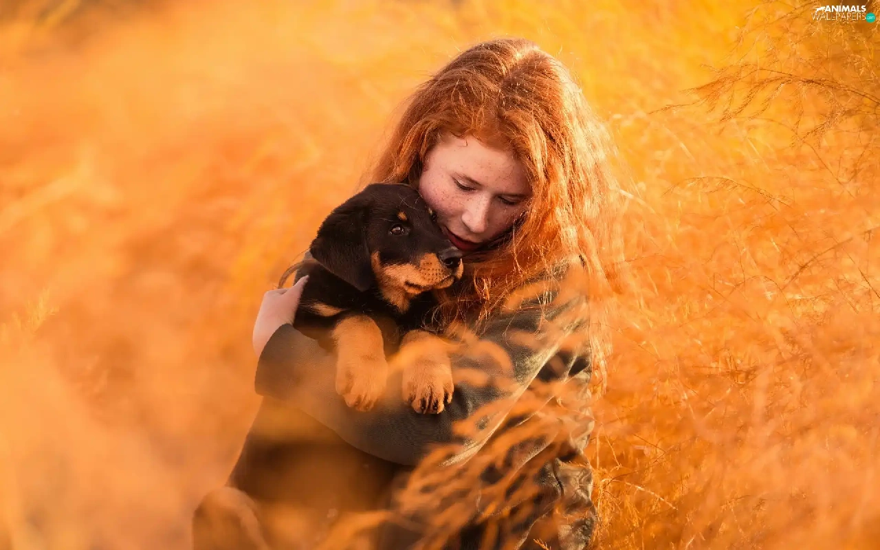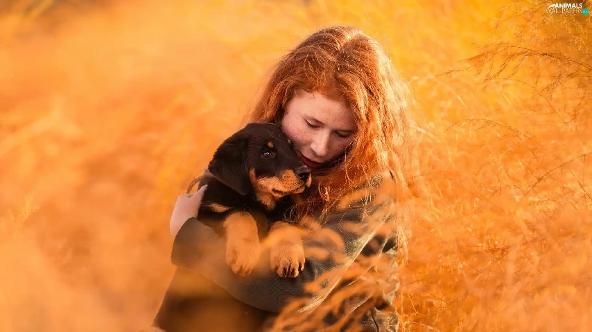 Rottweiler, grass, redhead, Puppy, Women