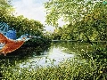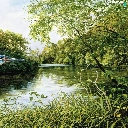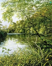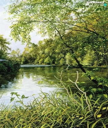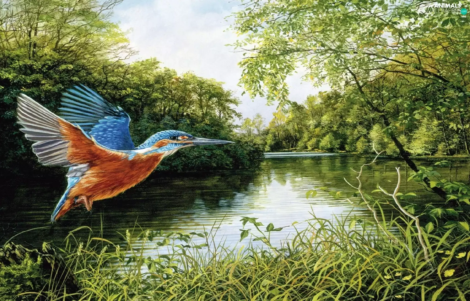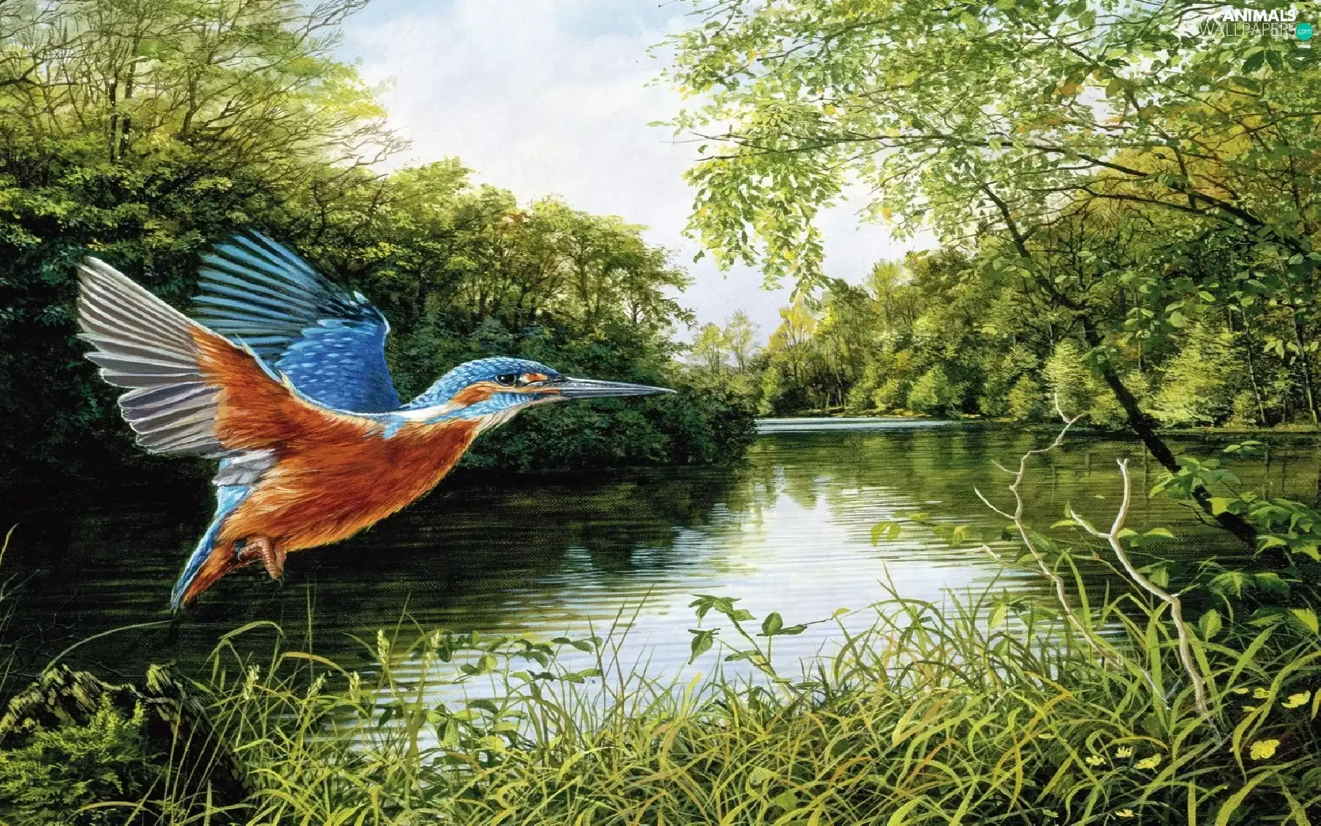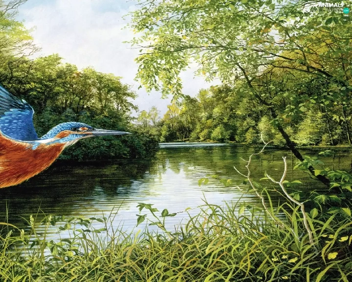 trees, kingfisher, River, grass, Bird, viewes, graphics