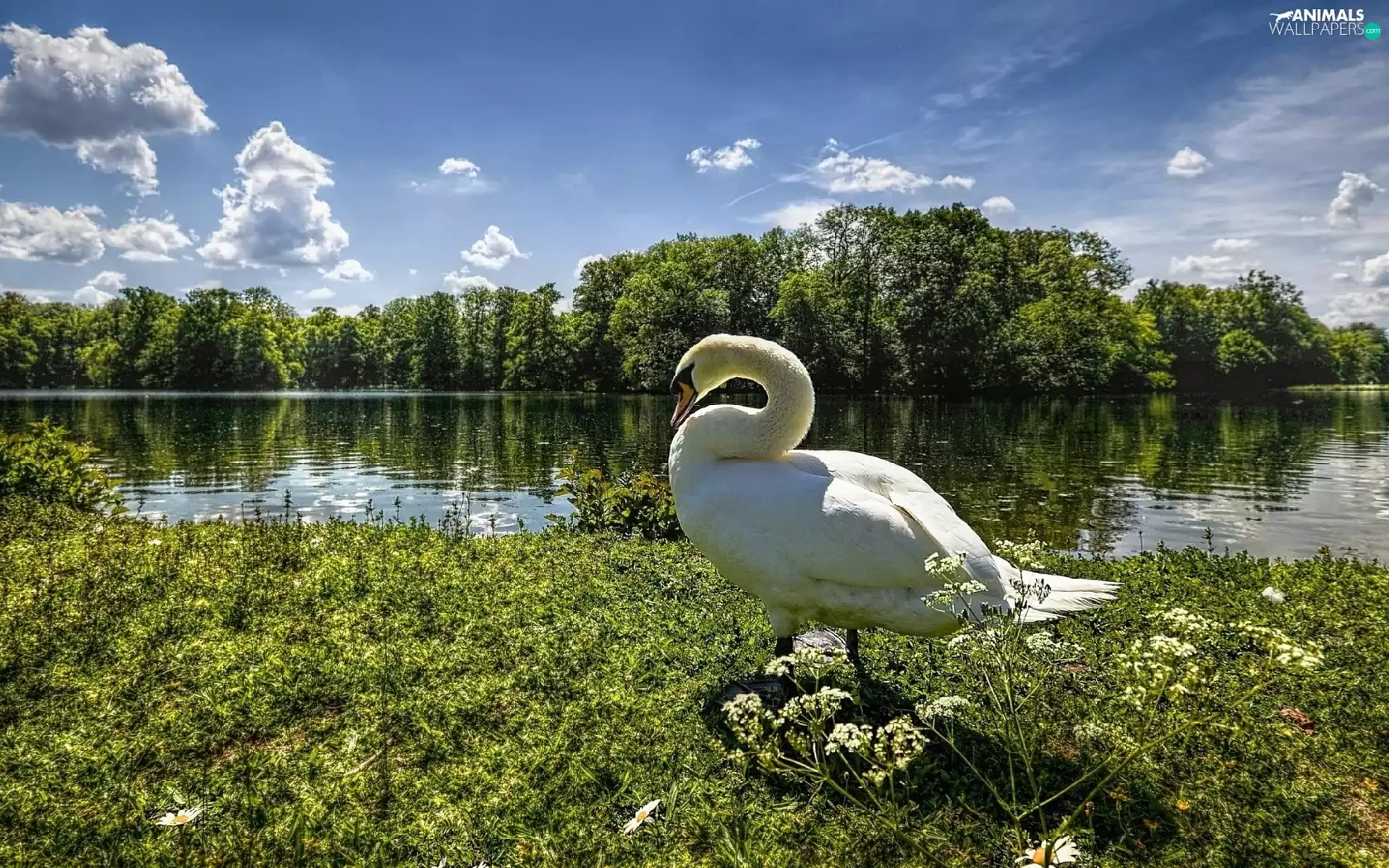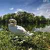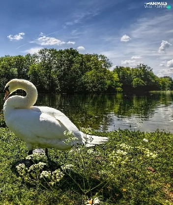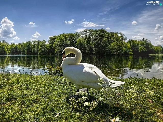 Meadow, Swans, viewes, grass, trees, River