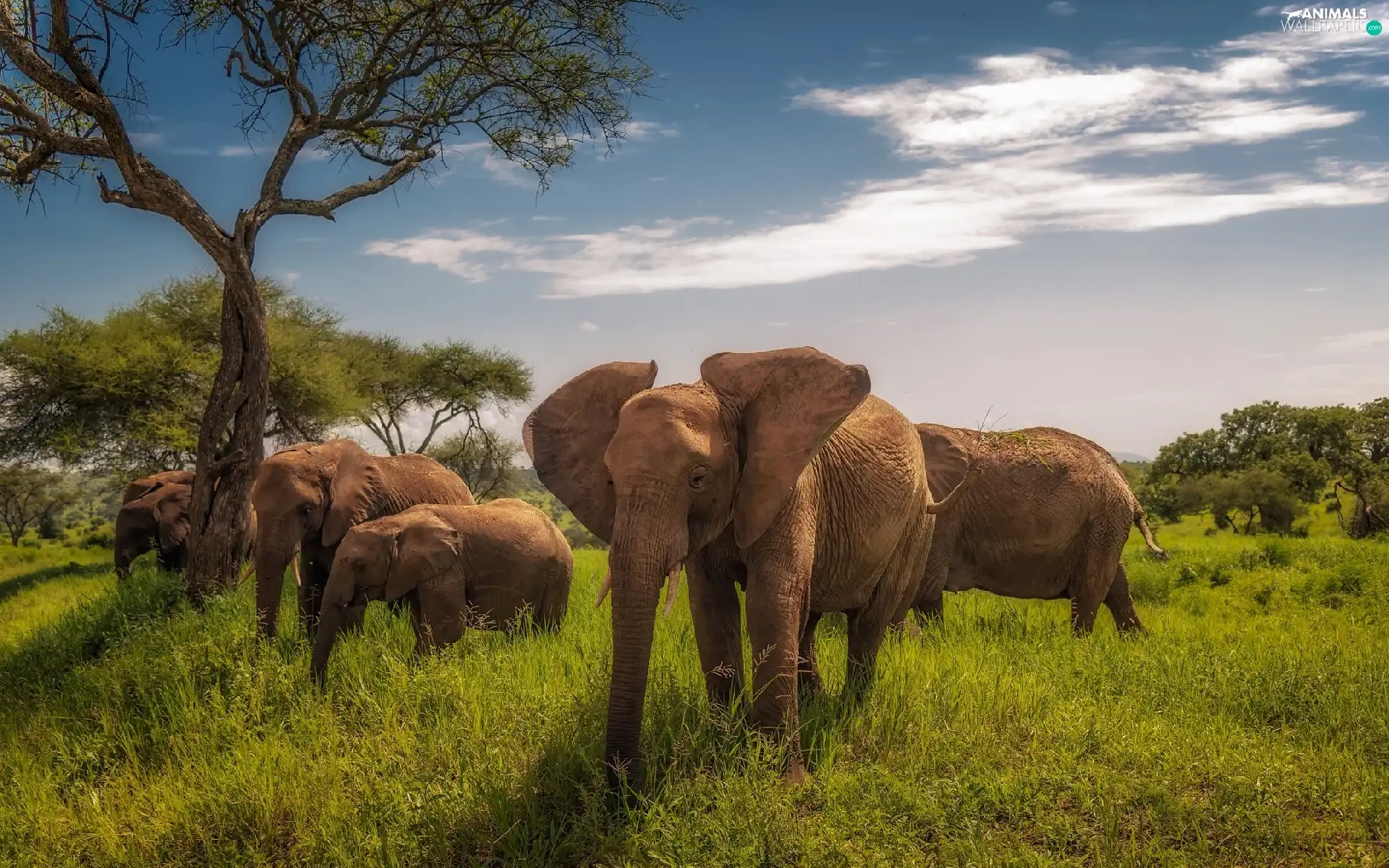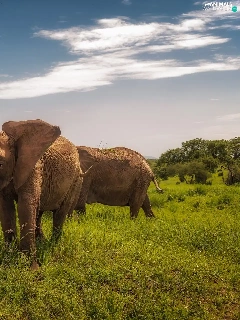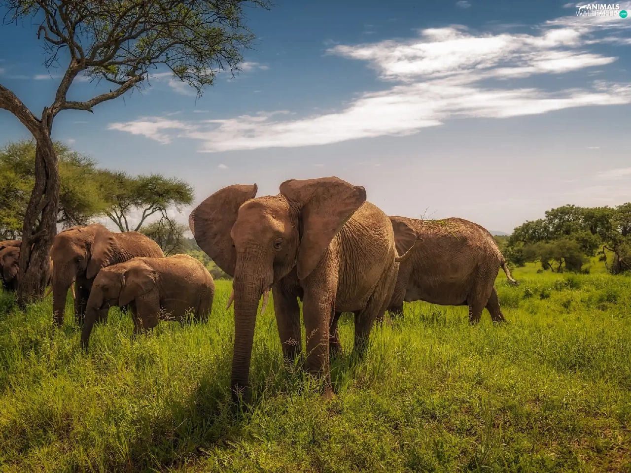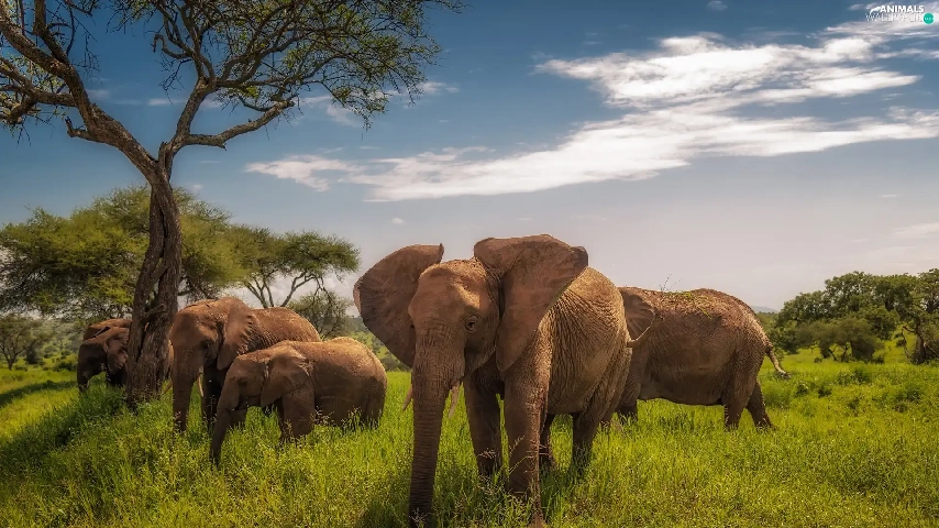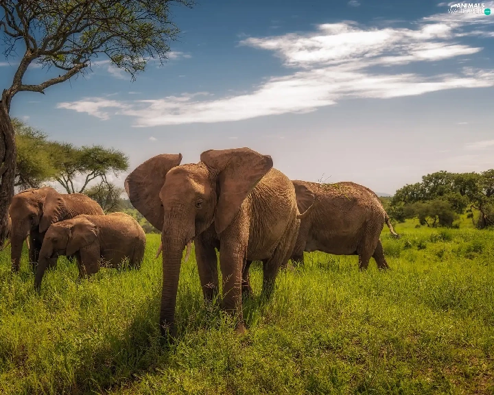 viewes, grass, savanna, trees, Elephants