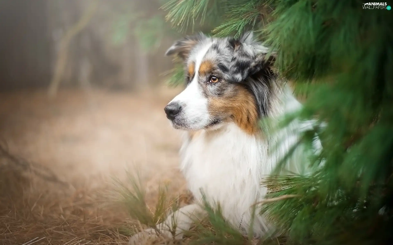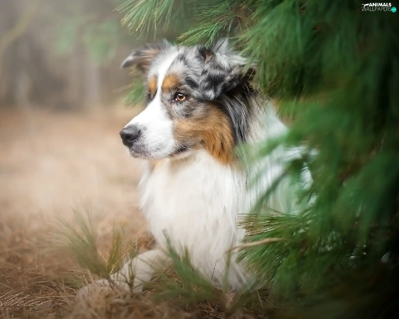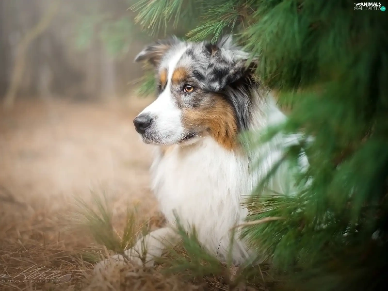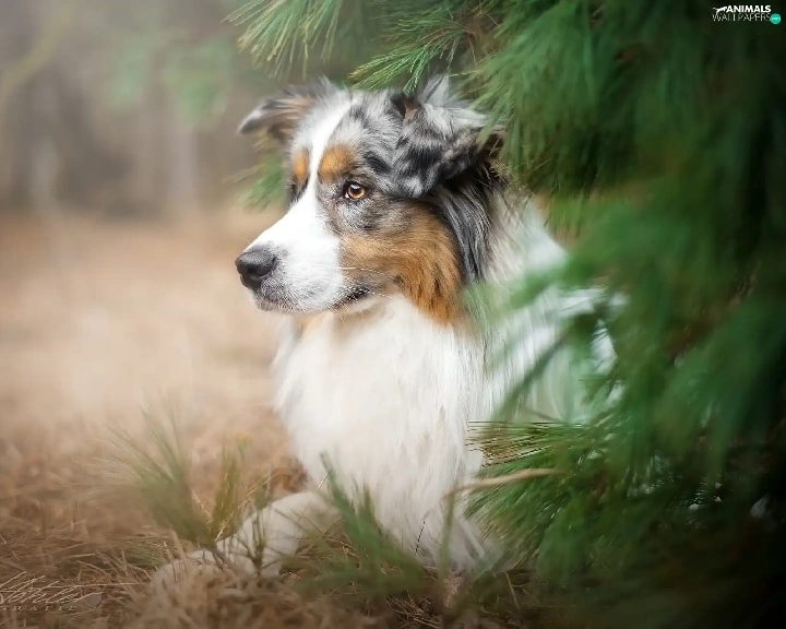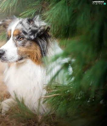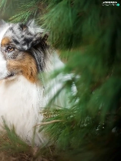 Australian Shepherd, conifer, grass, trees