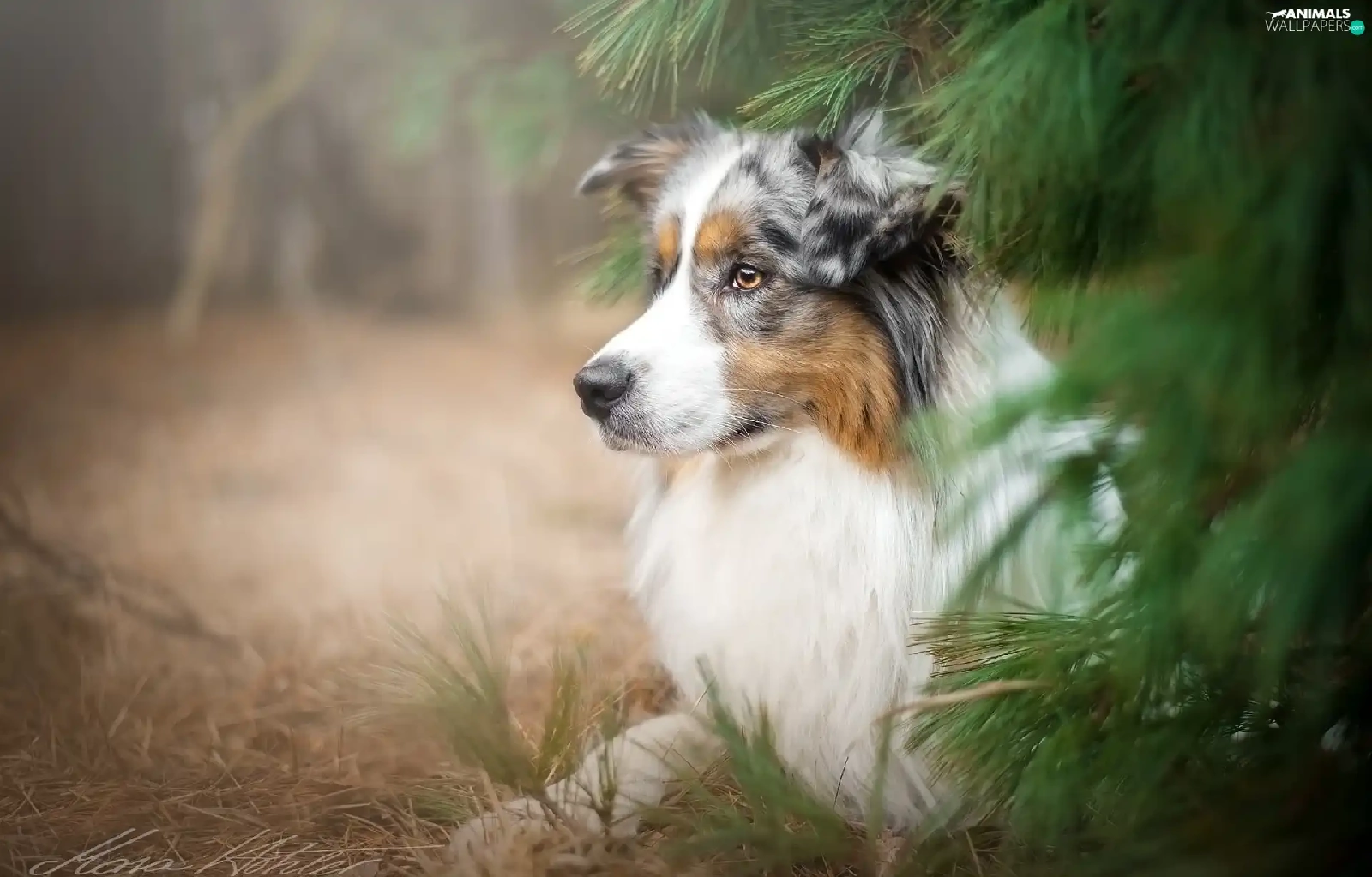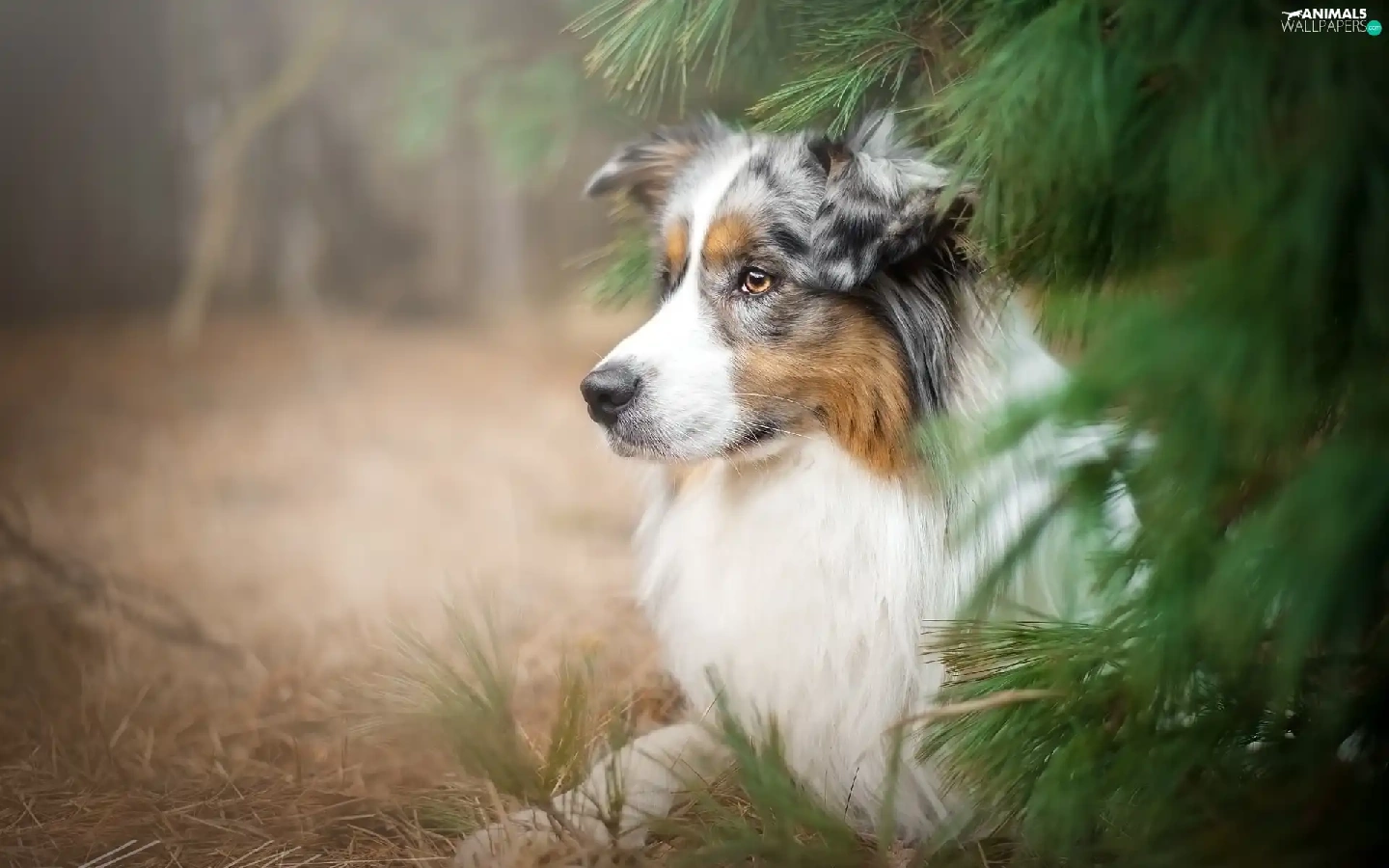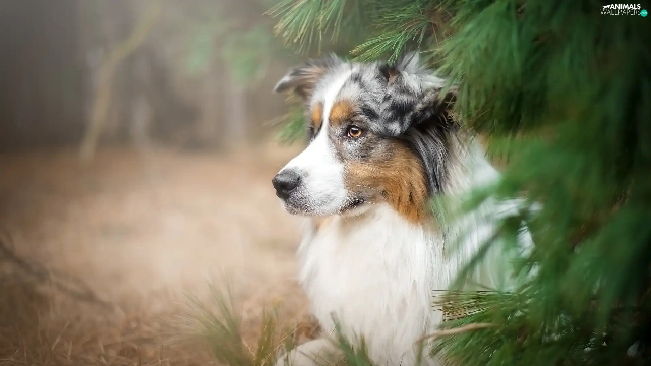 Australian Shepherd, conifer, grass, trees