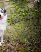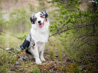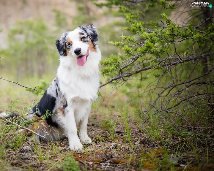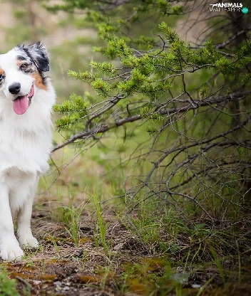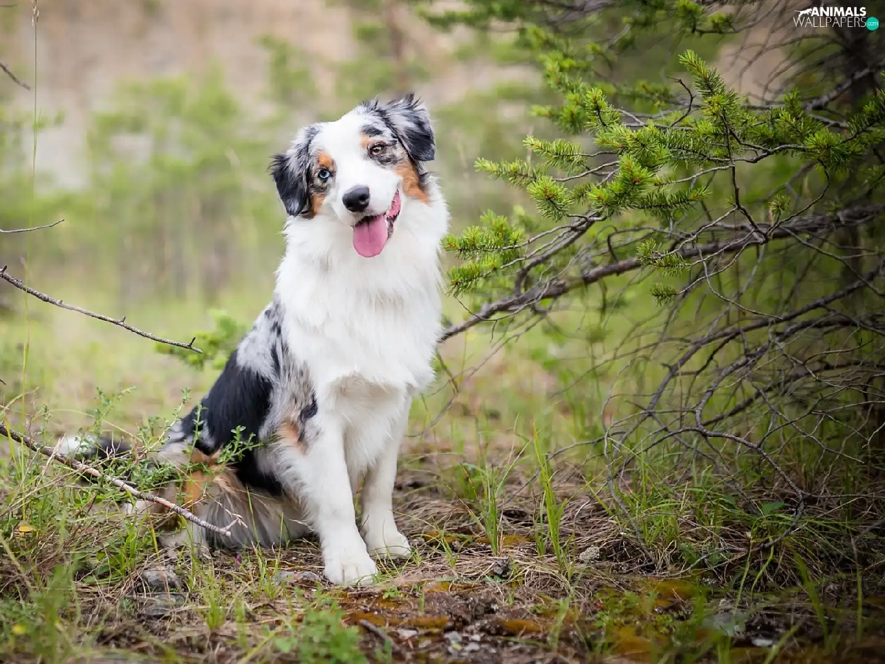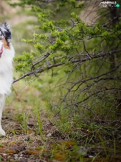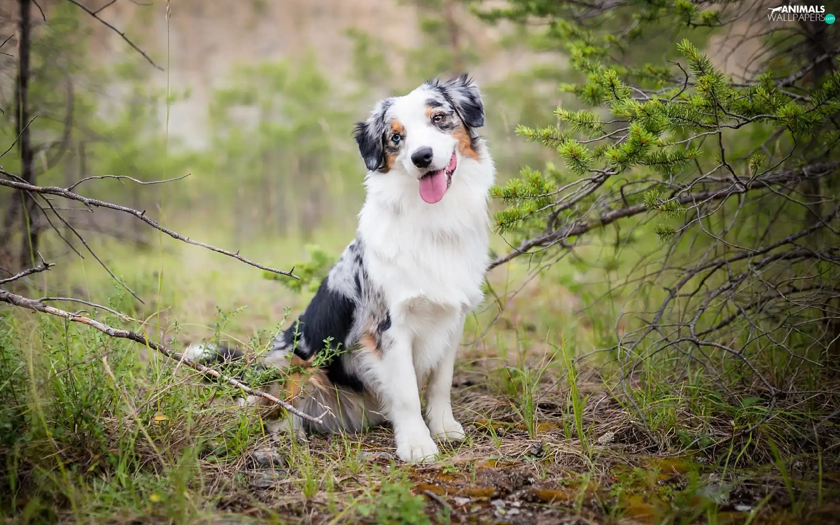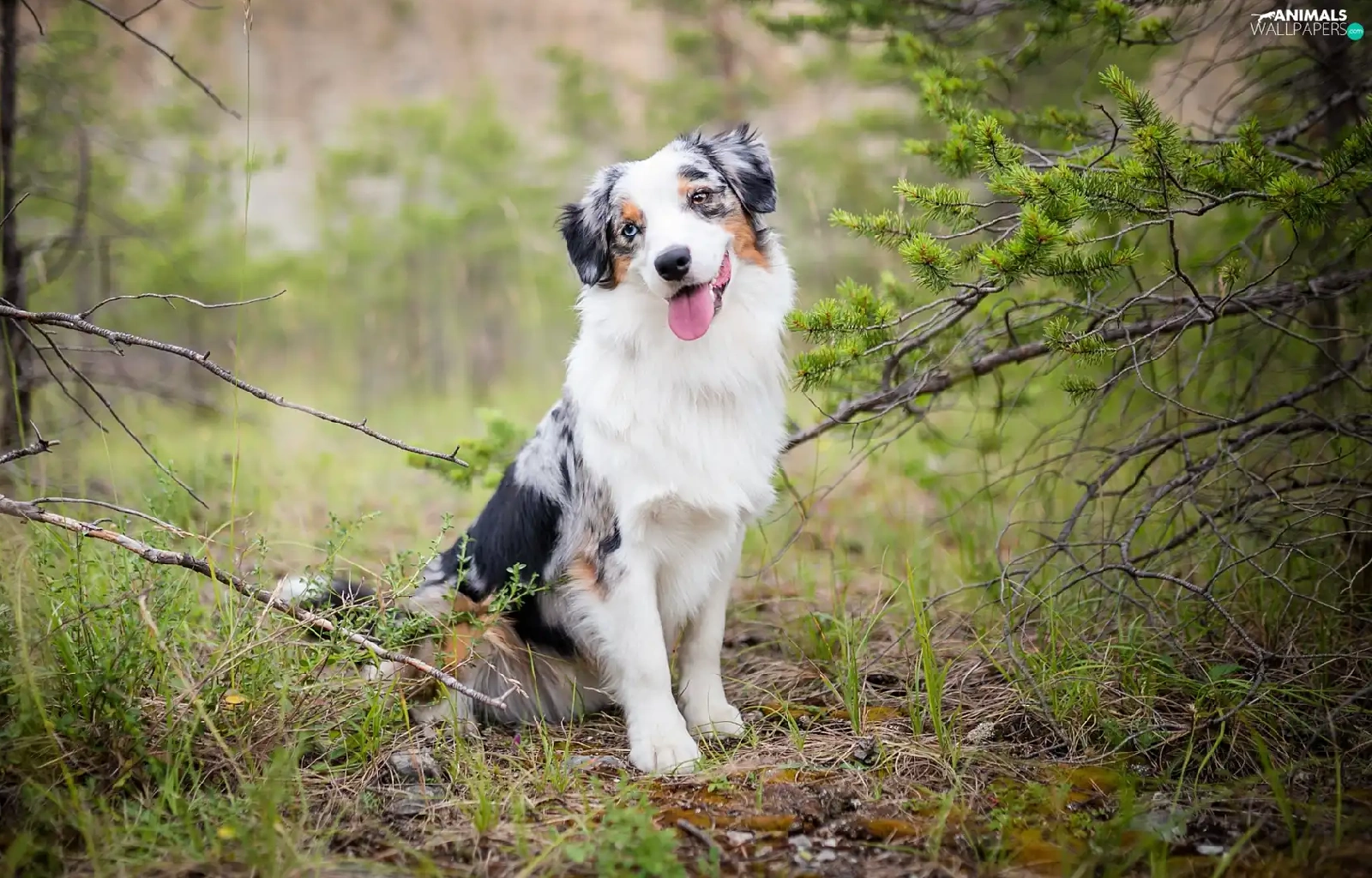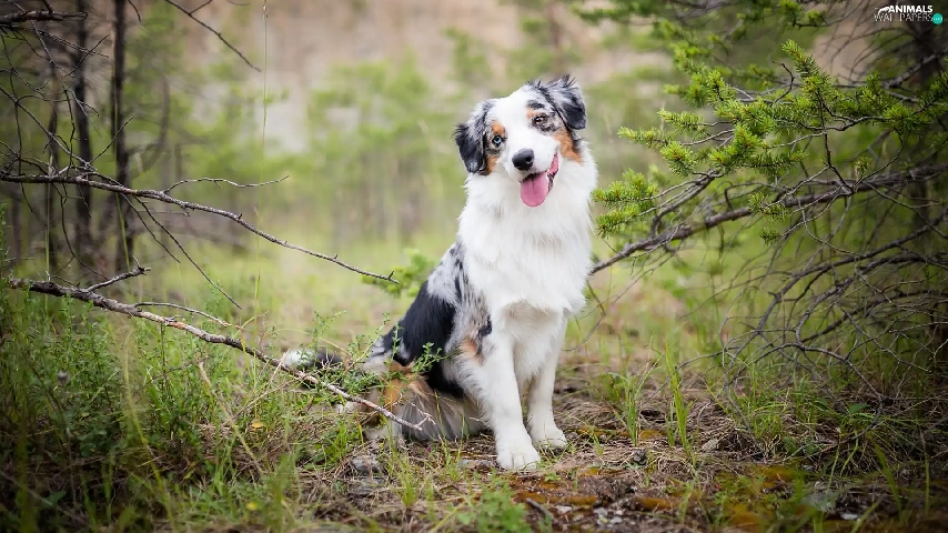 trees, Australian Shepherd, Twigs, forest, dog, viewes, grass