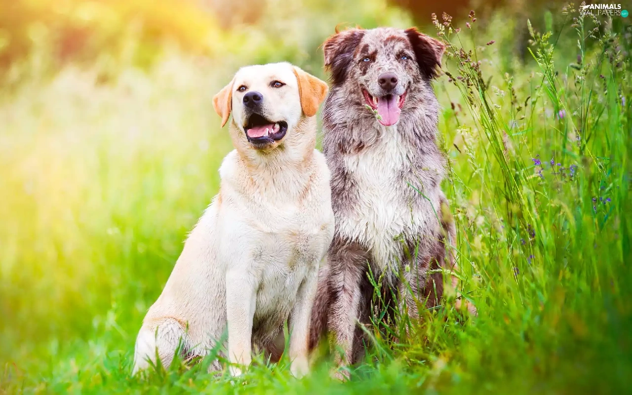 Labrador Retriever, Meadow, grass, Australian Shepherd