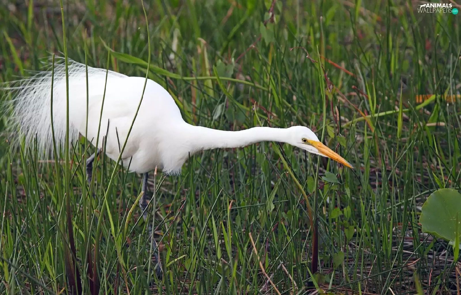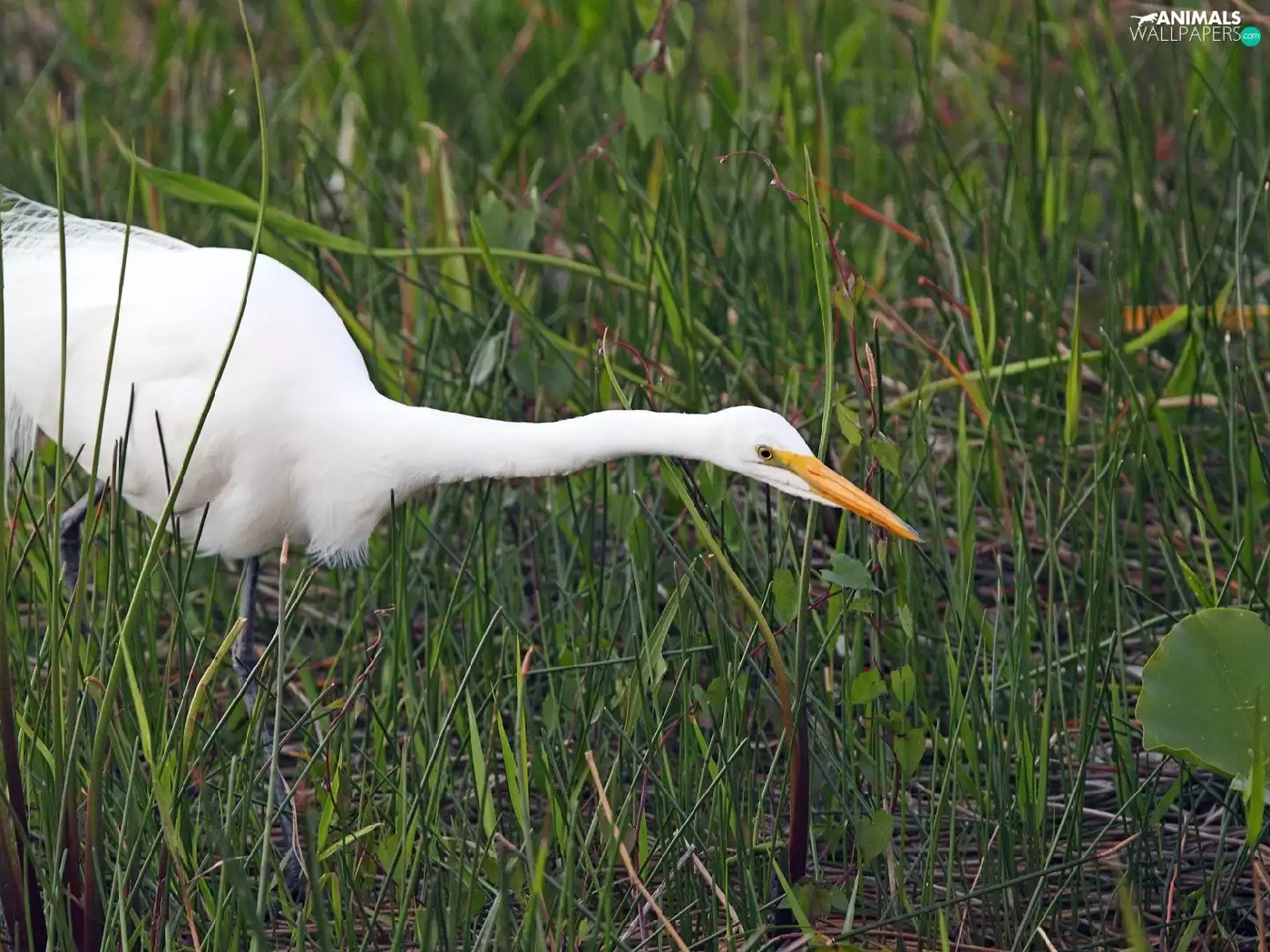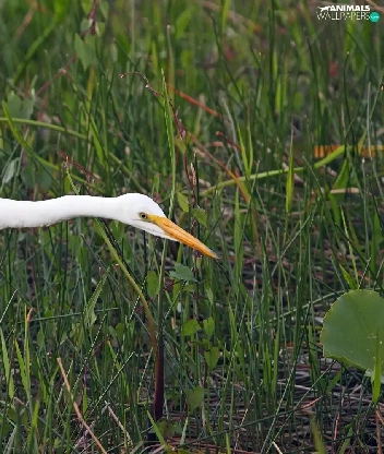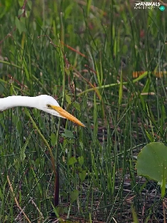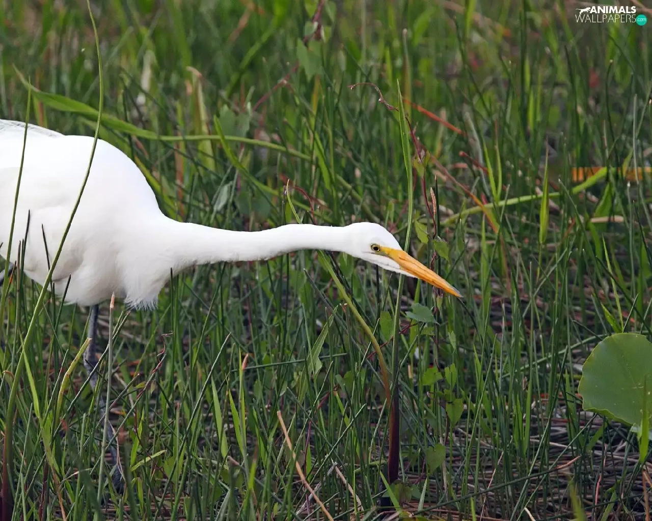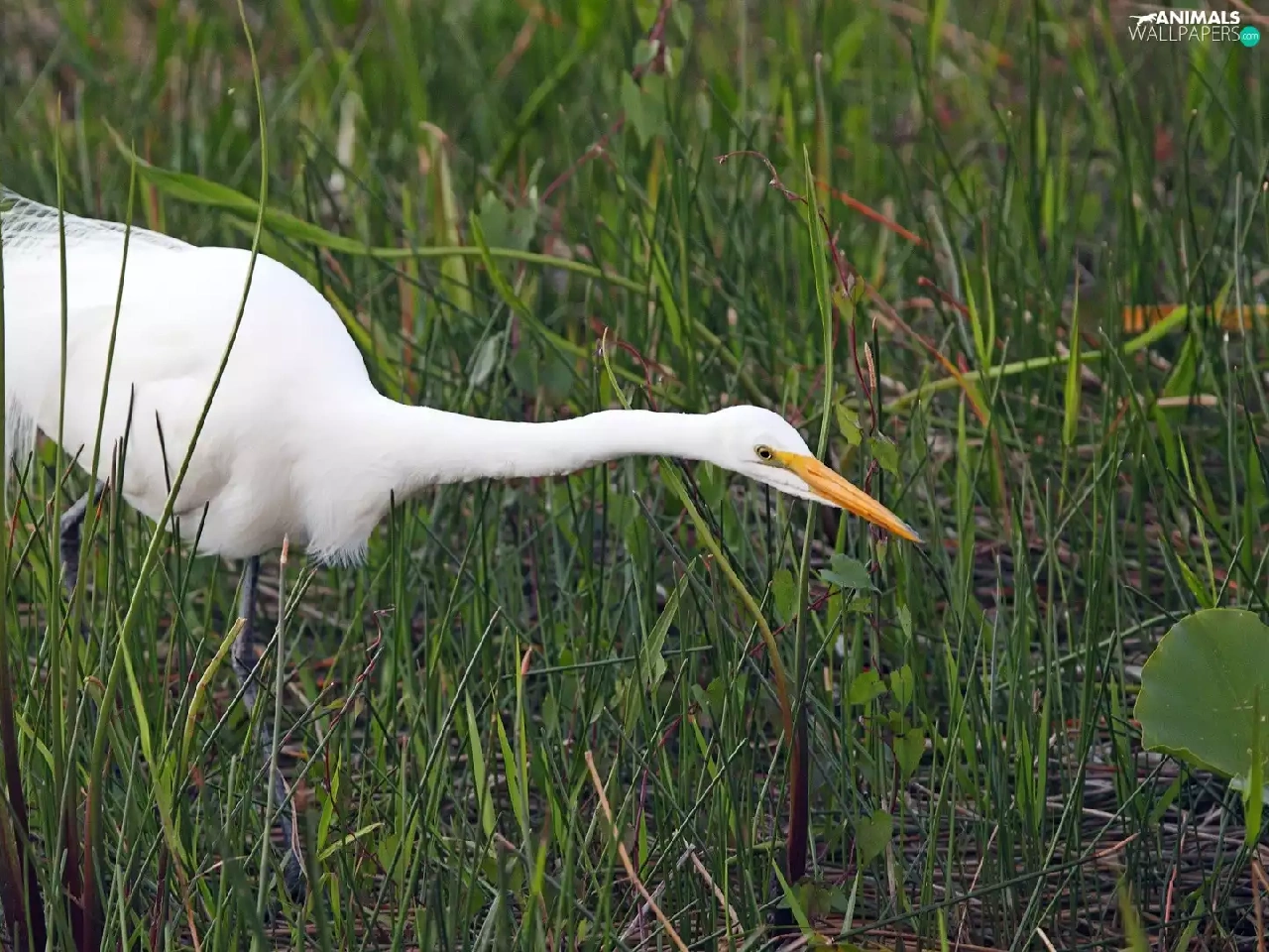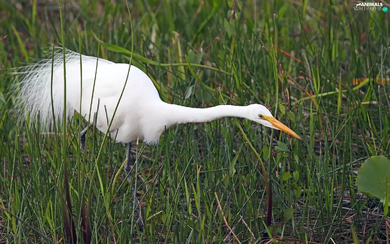 grass, heron, White