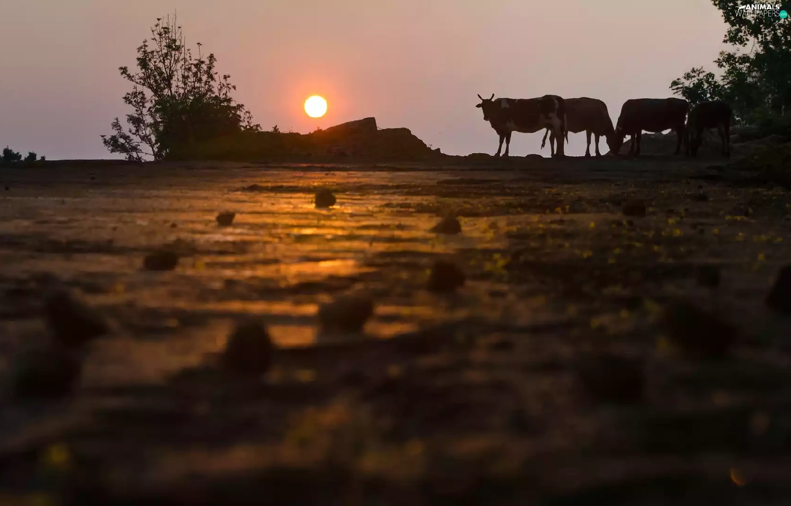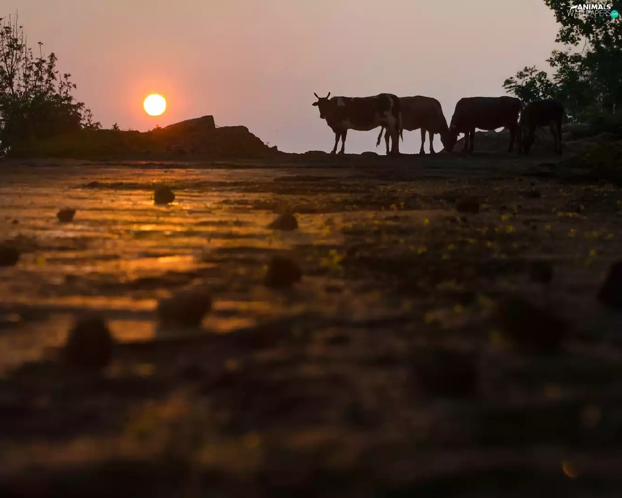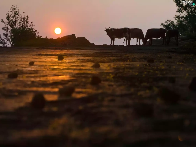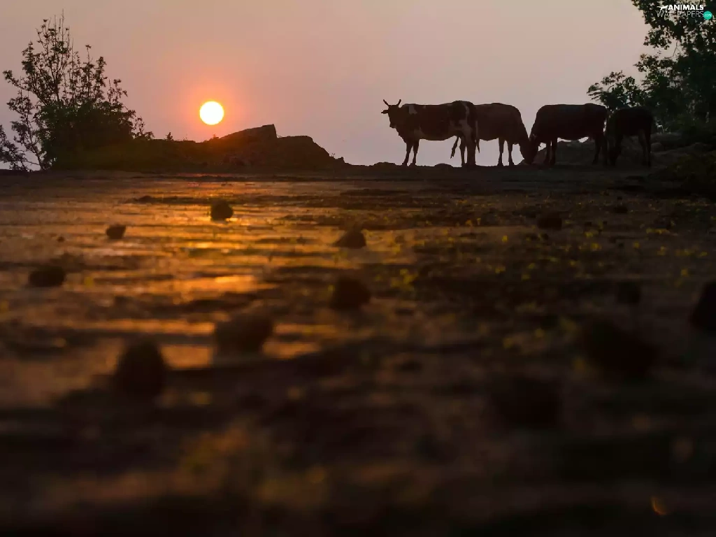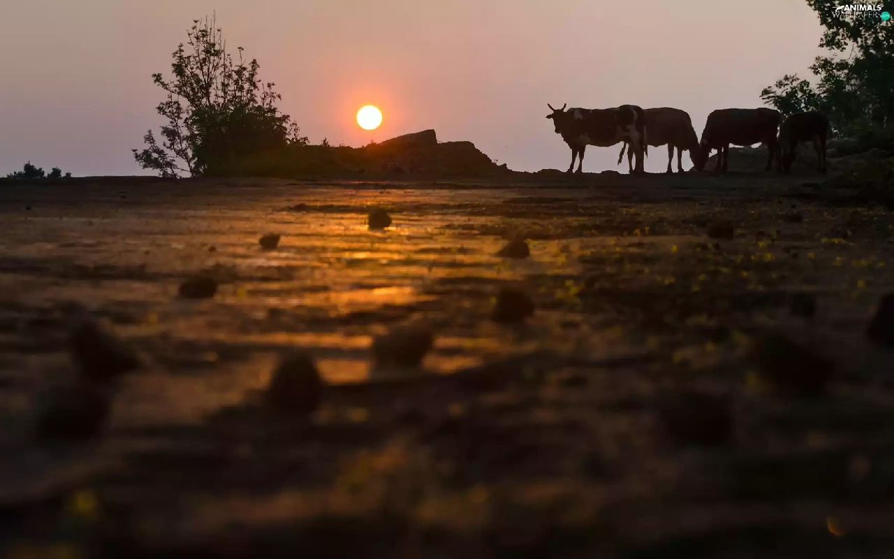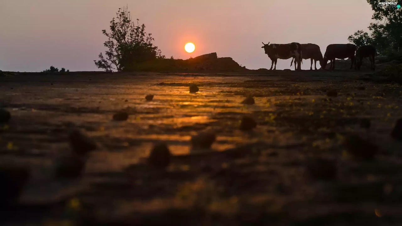 trees, viewes, Cows, Great Sunsets, Field