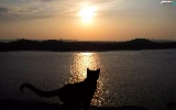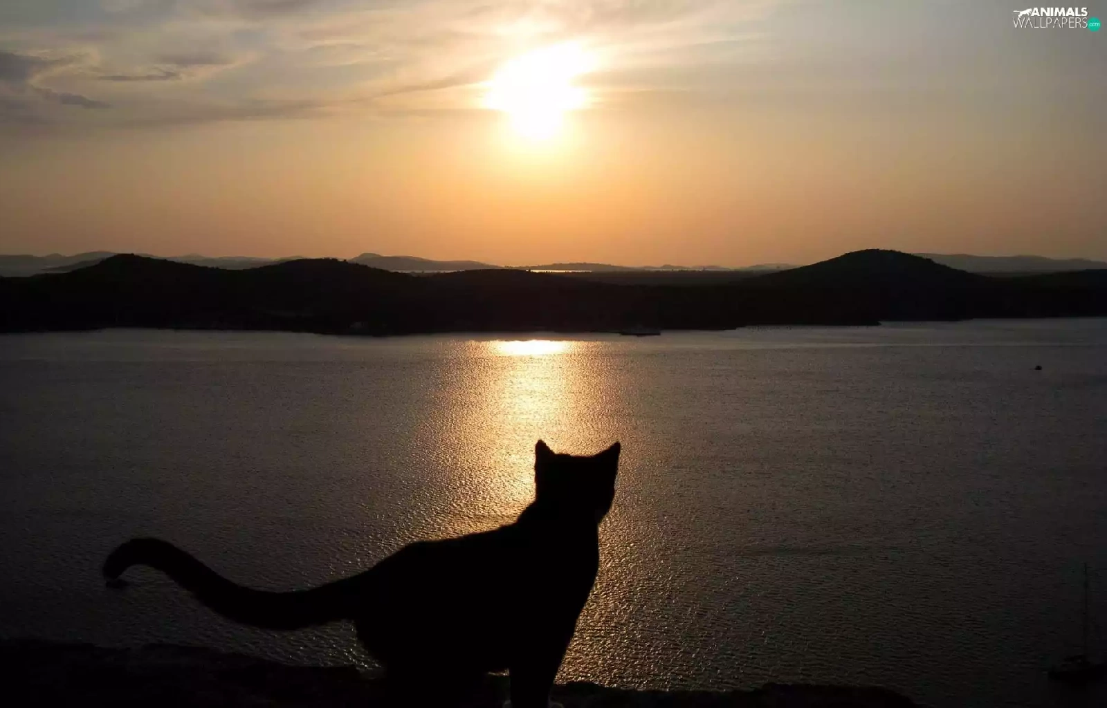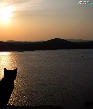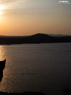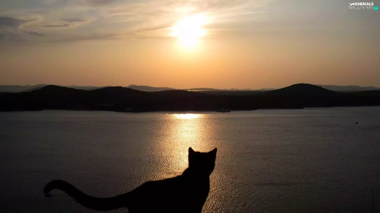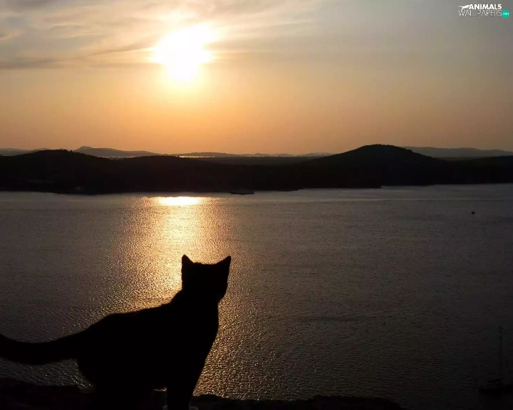 cat, Great Sunsets, Mountains, lake