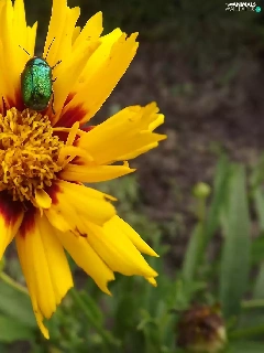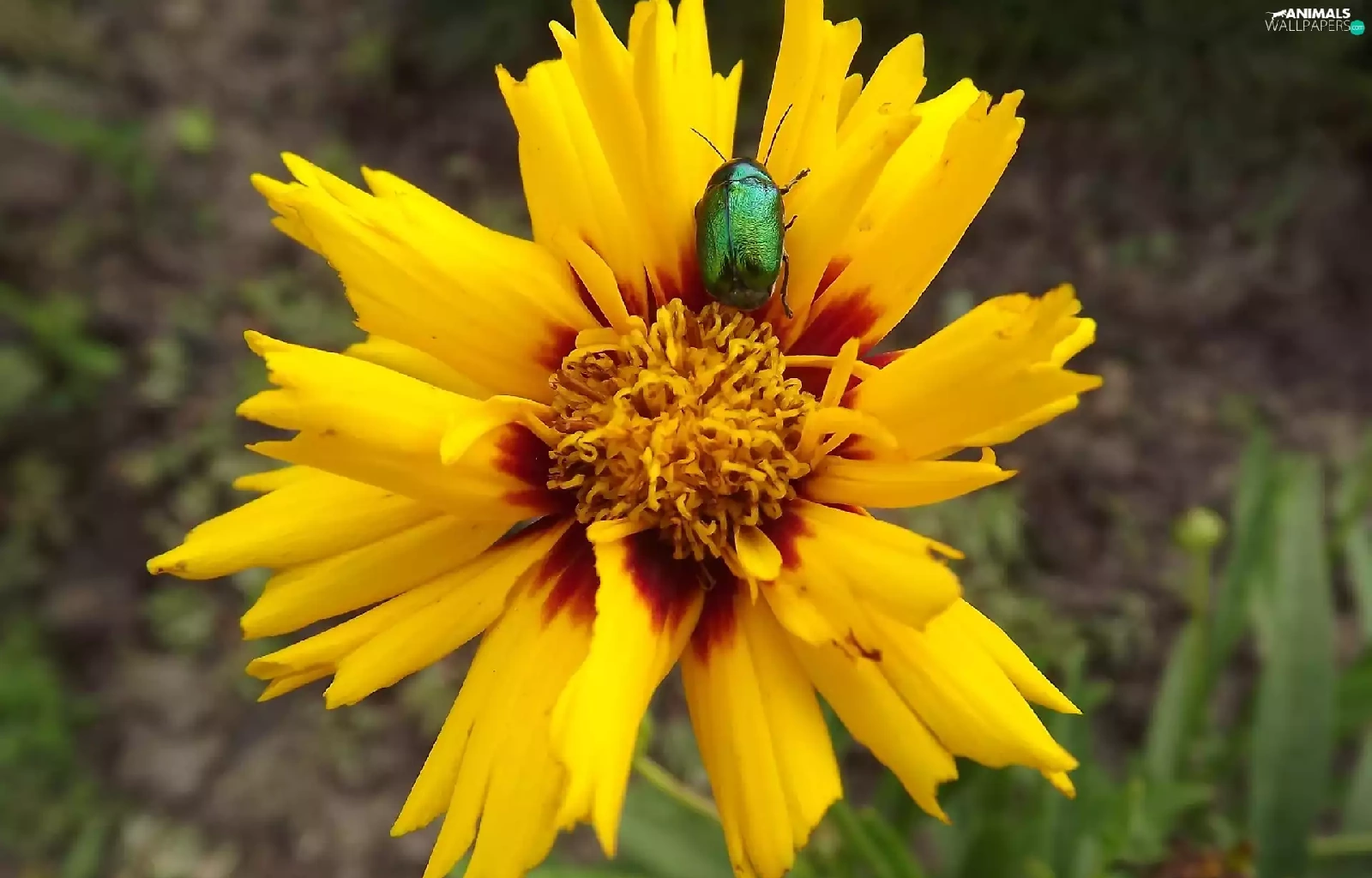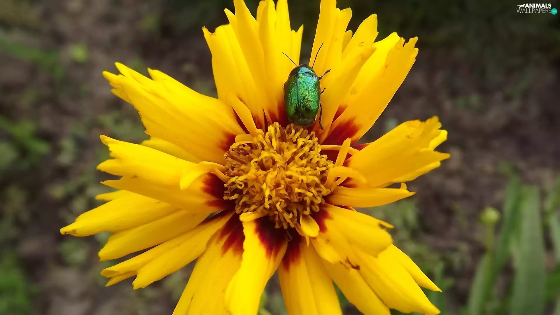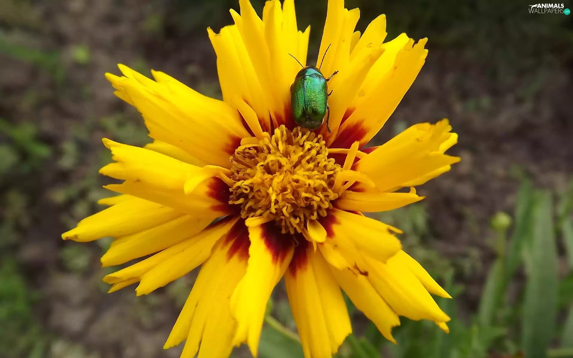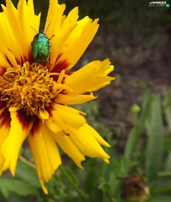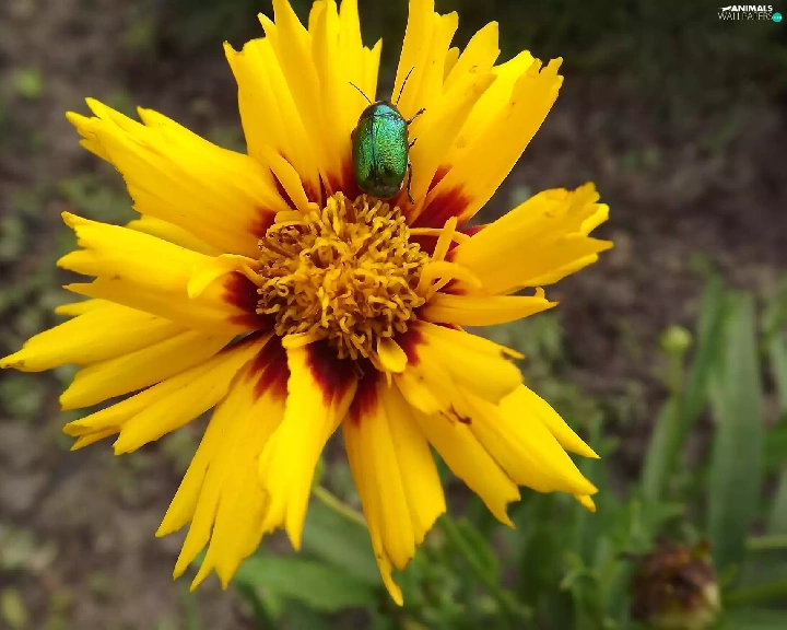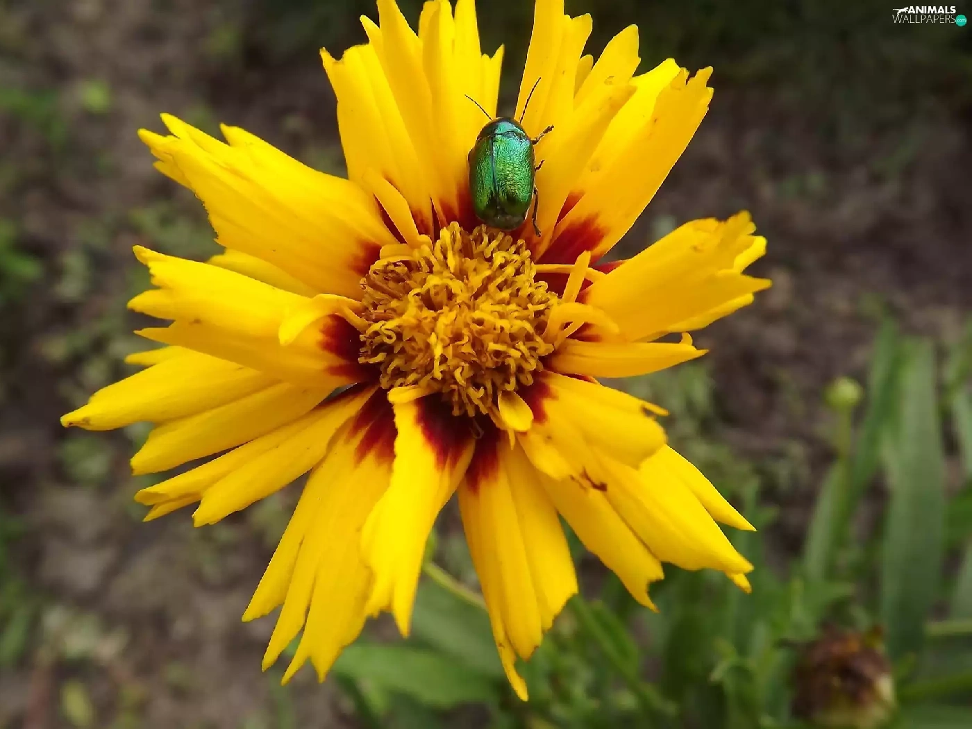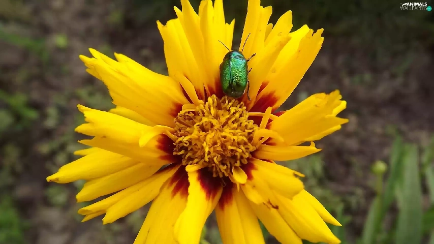Brown, Colourfull Flowers, Green, beetle, Coreopsis, yellow