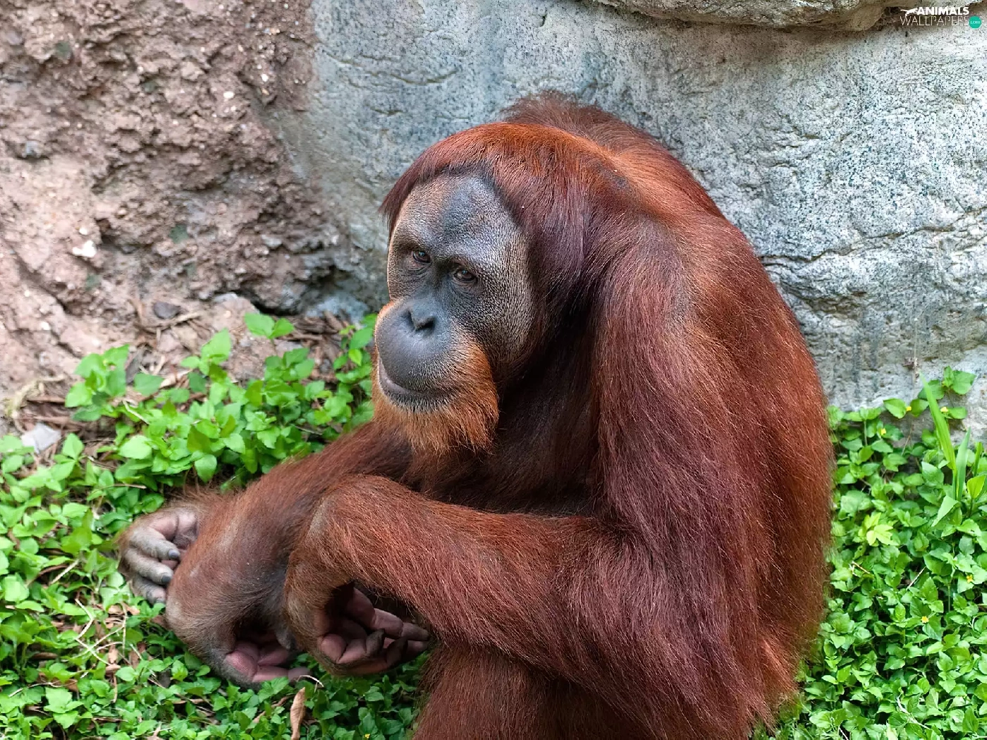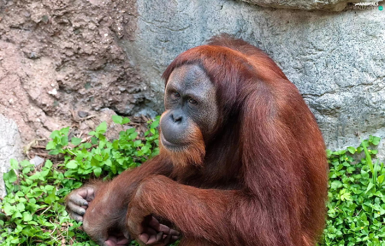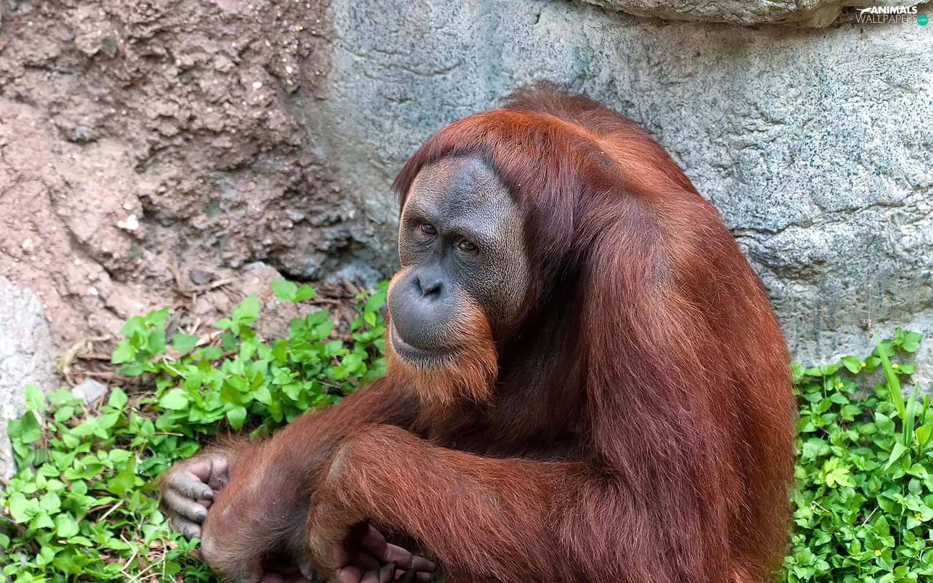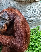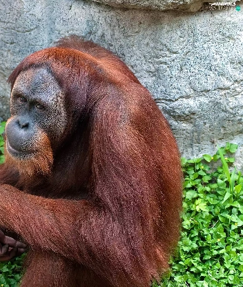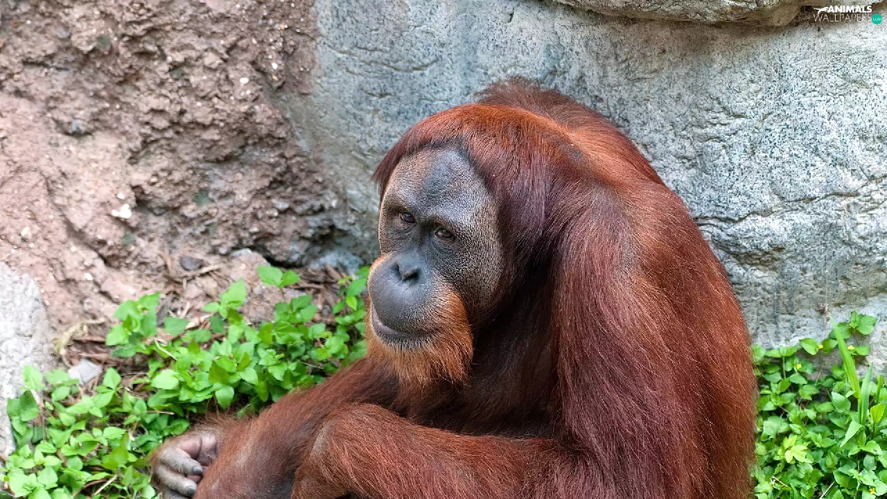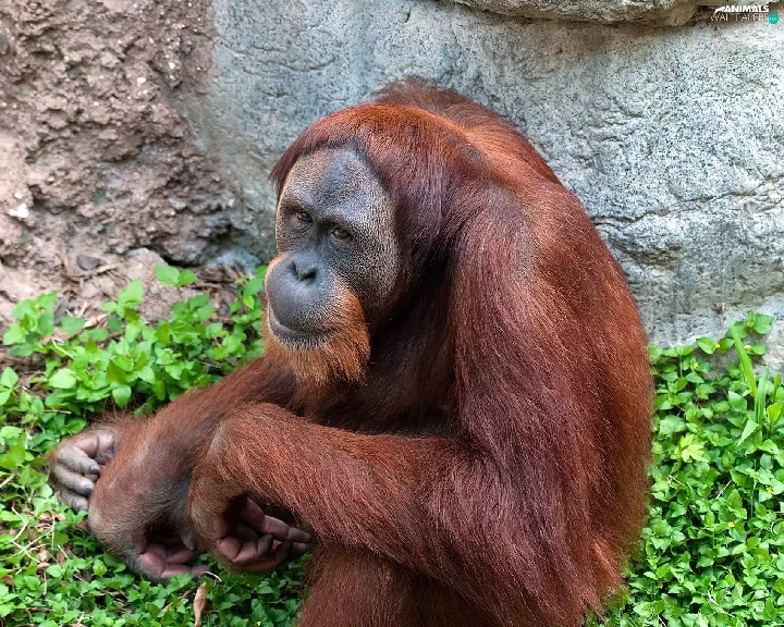 green, orangutan, Rocks