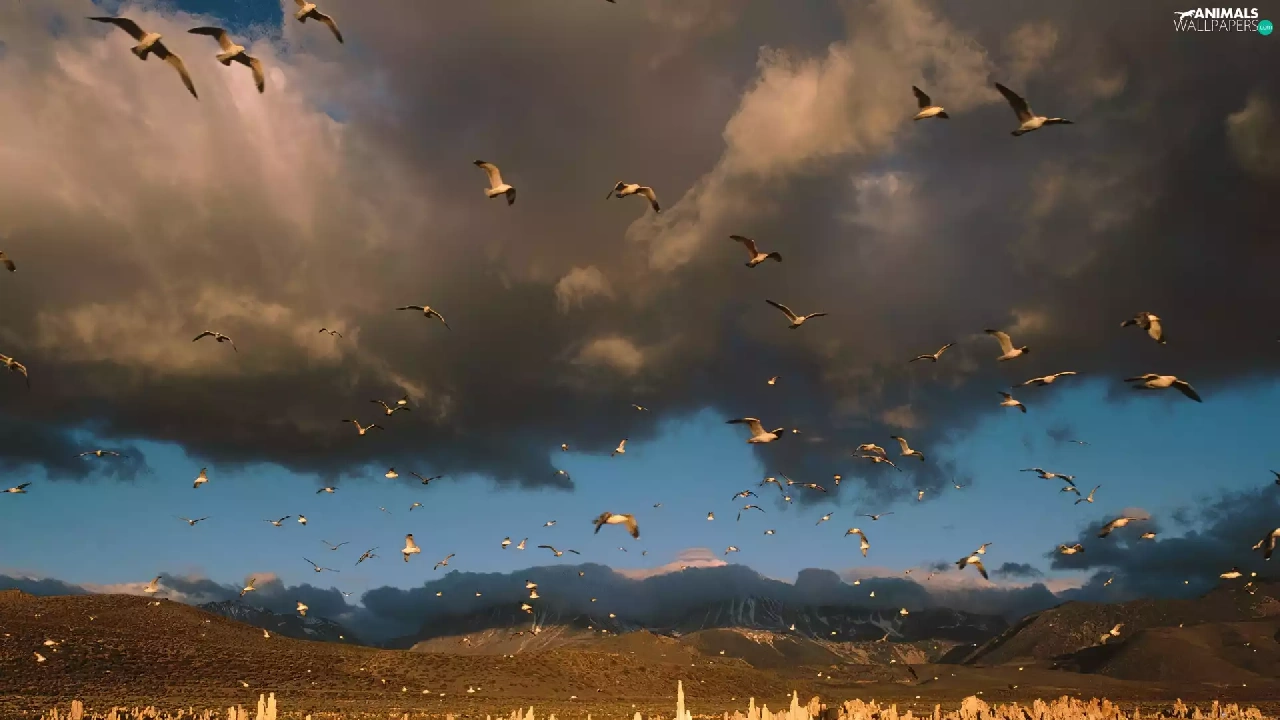 gulls, sea, clouds