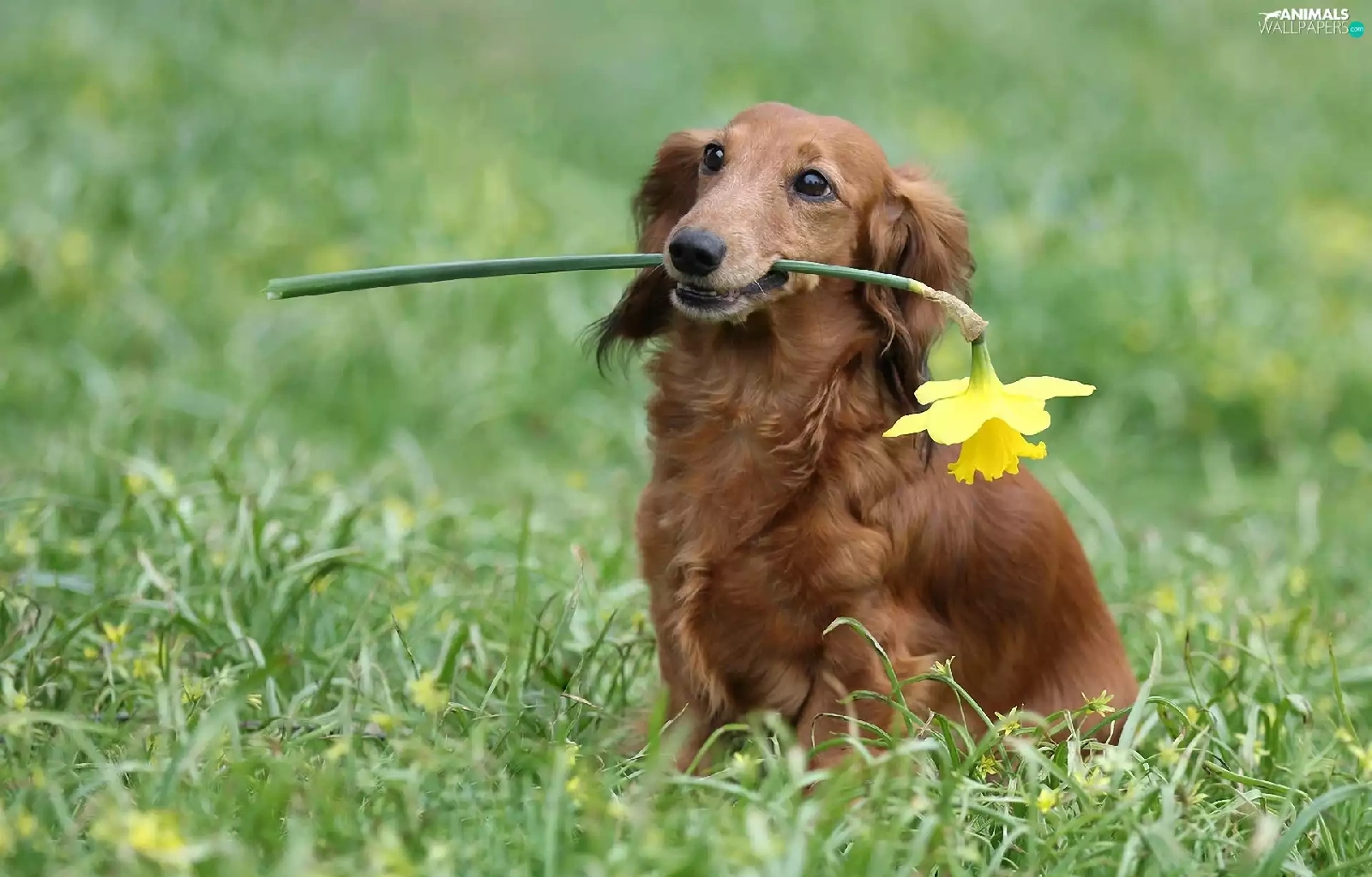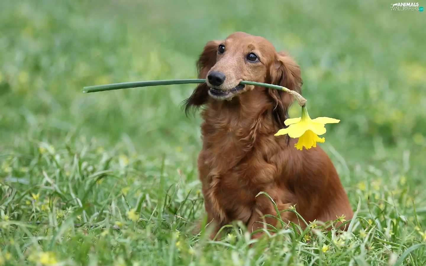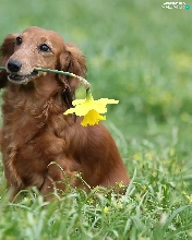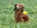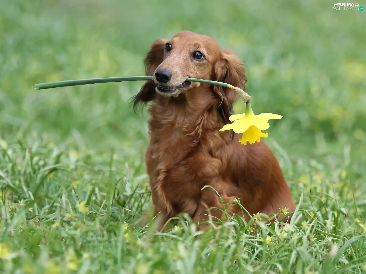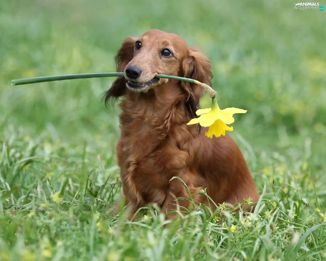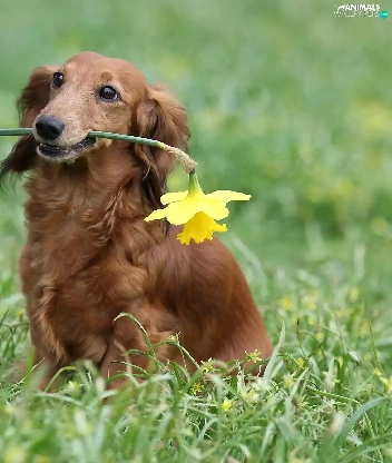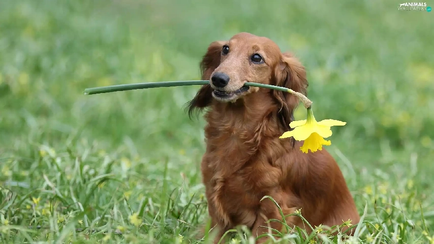 dog, jonquil, long-haired Dachshund, Laka