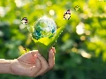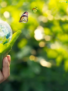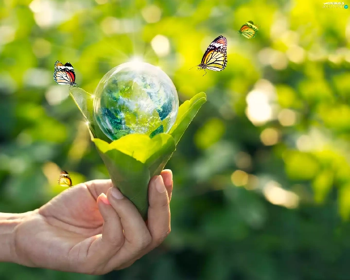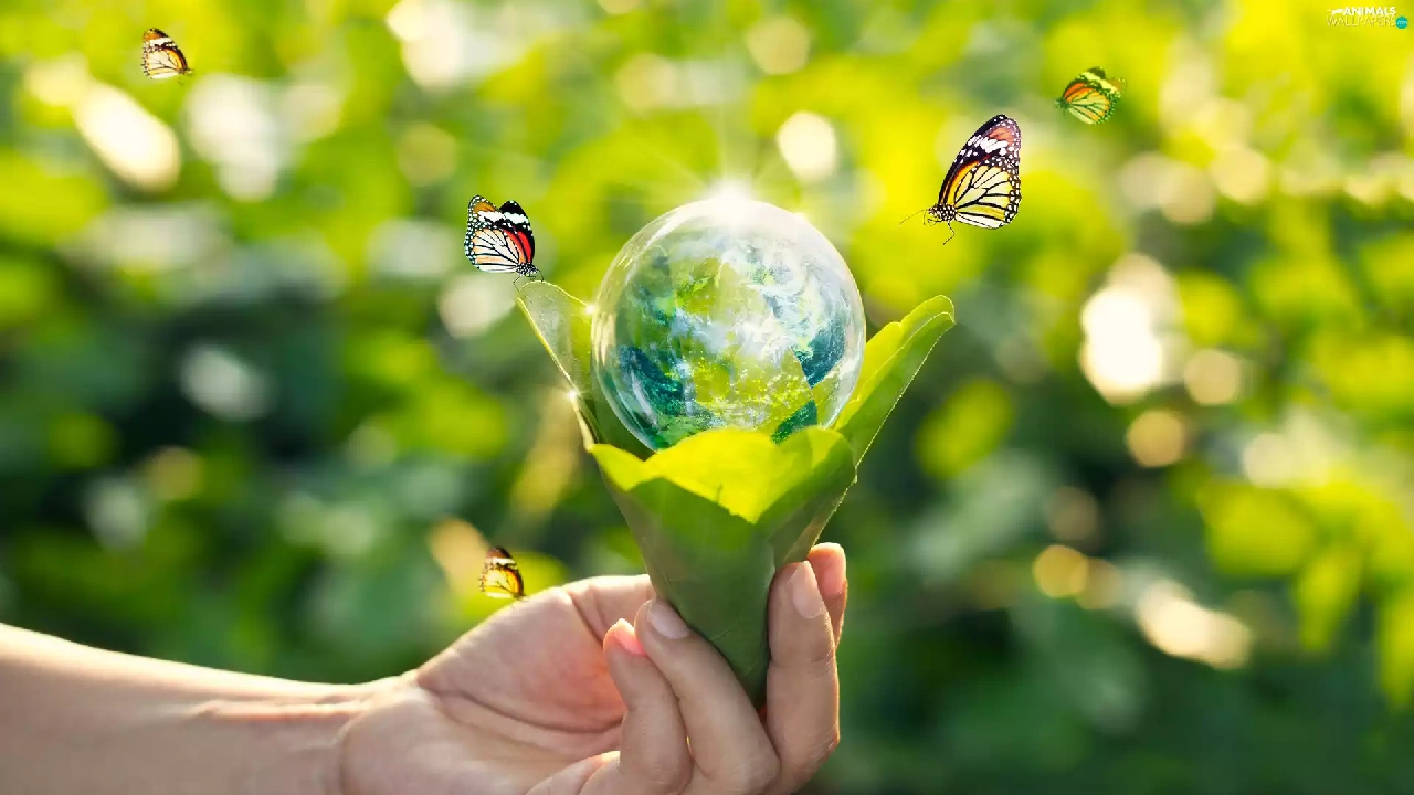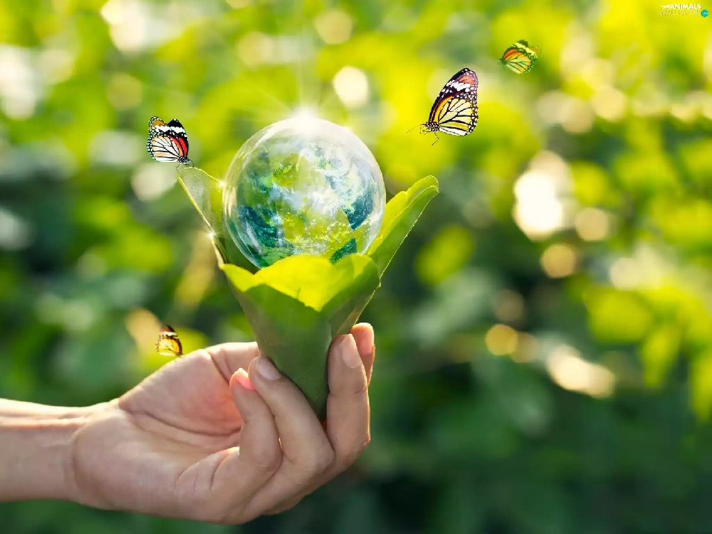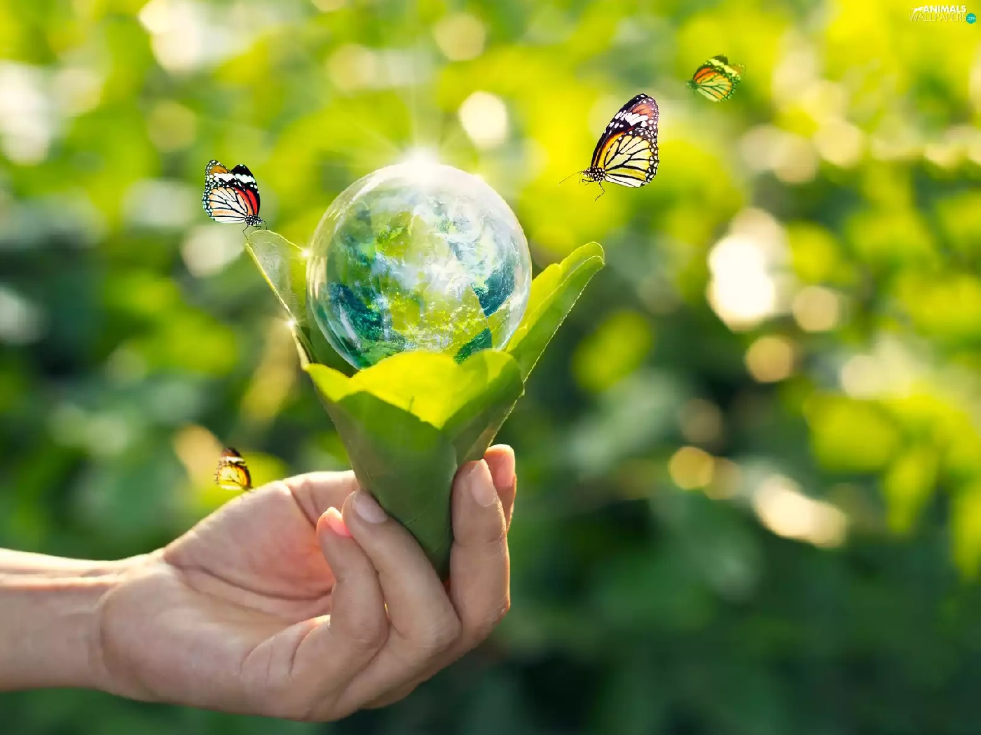 hand, ecology, green ones, Leaf, butterflies, 2D, Planet, land, Orb