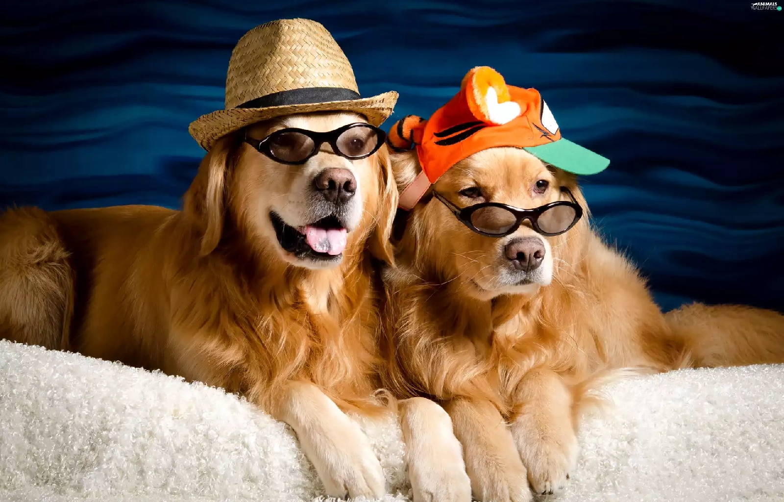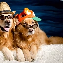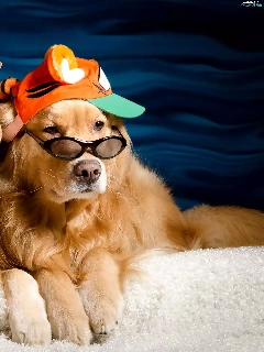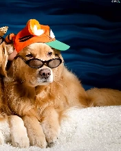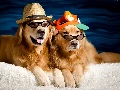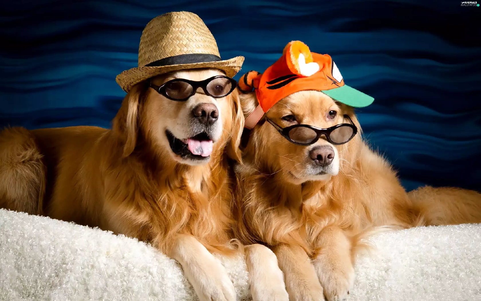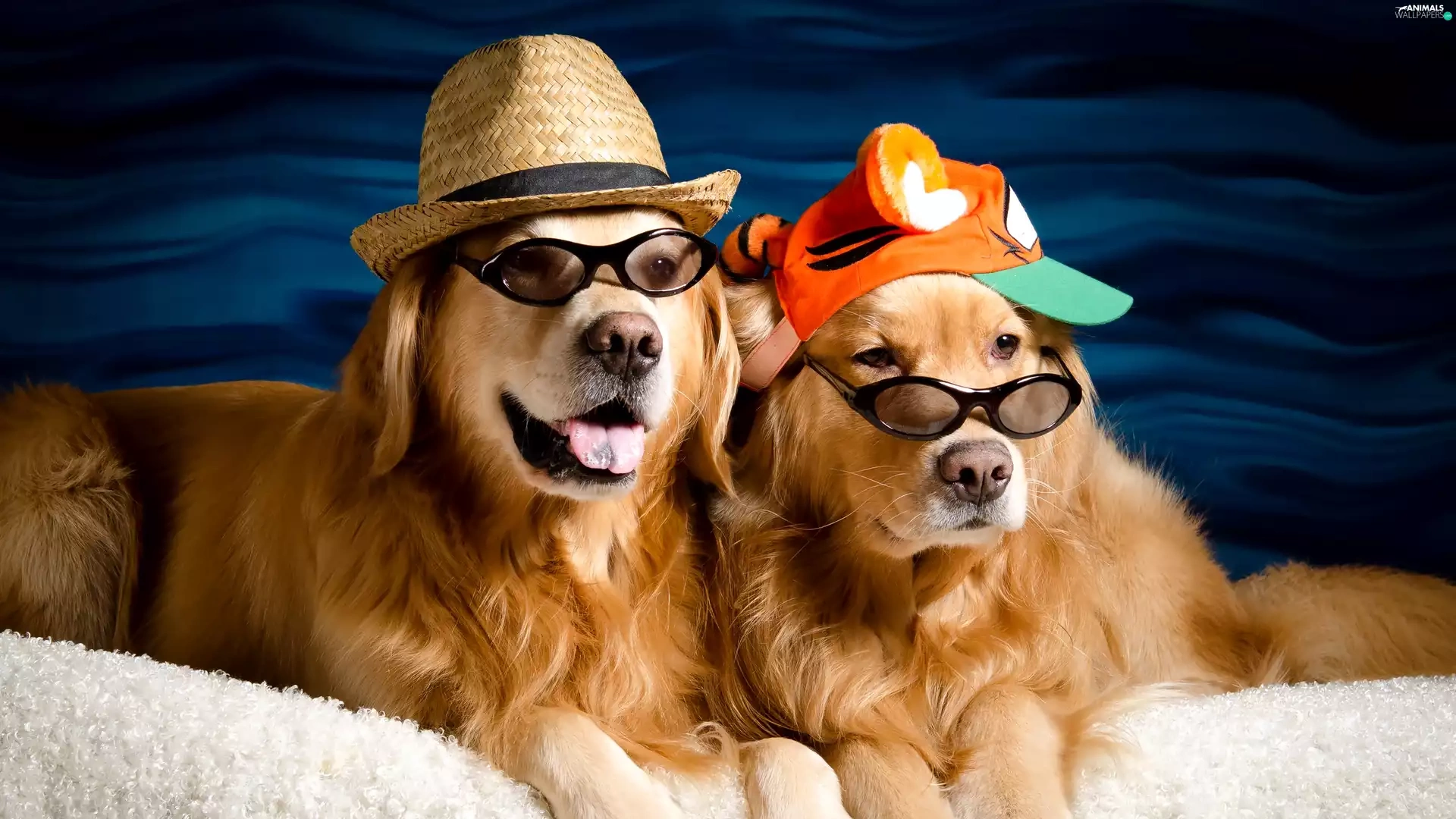 golden, Two cars, Hat, Glasses, Hat, Dogs