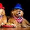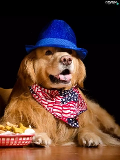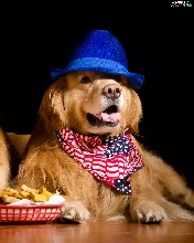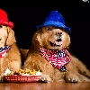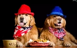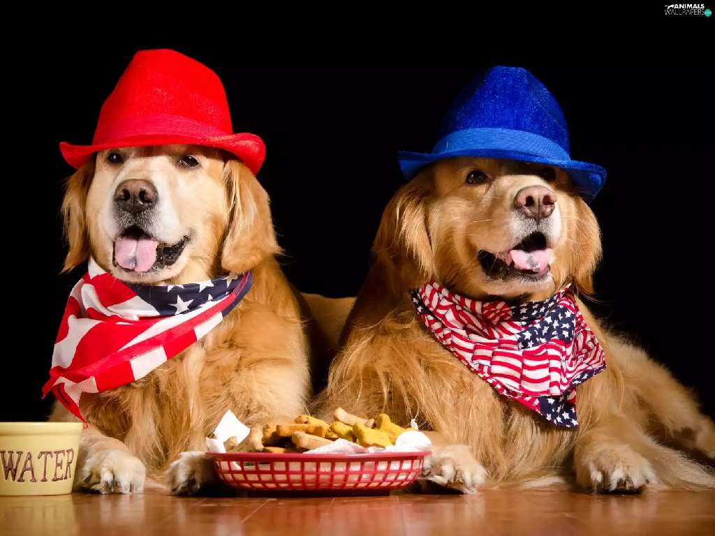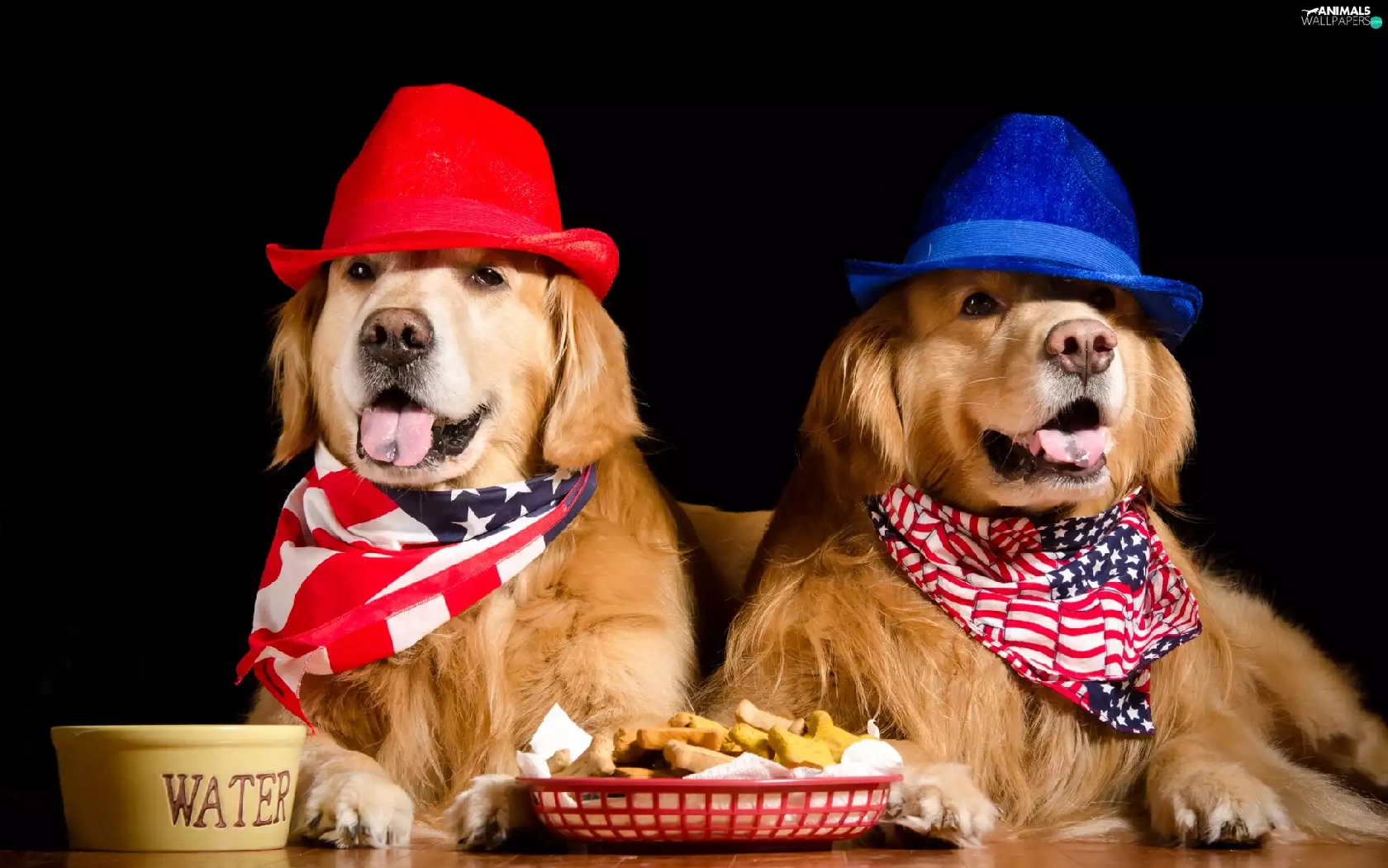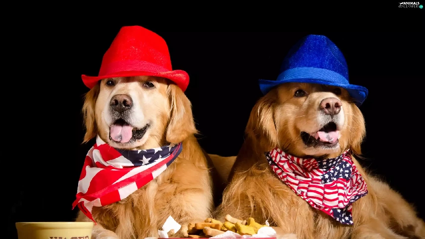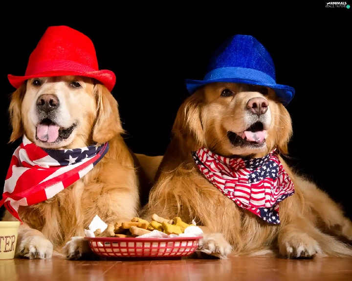 hats, Dogs, food, Golden Retrievery, Two cars, scarves, bowl