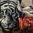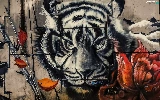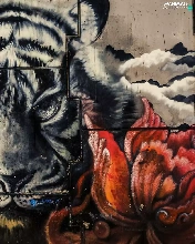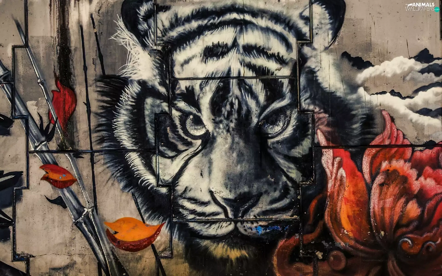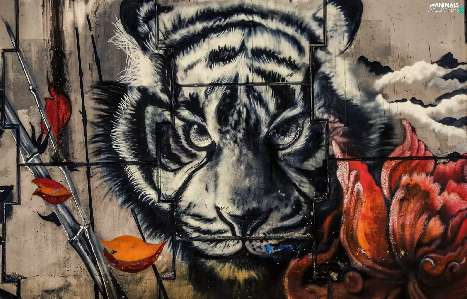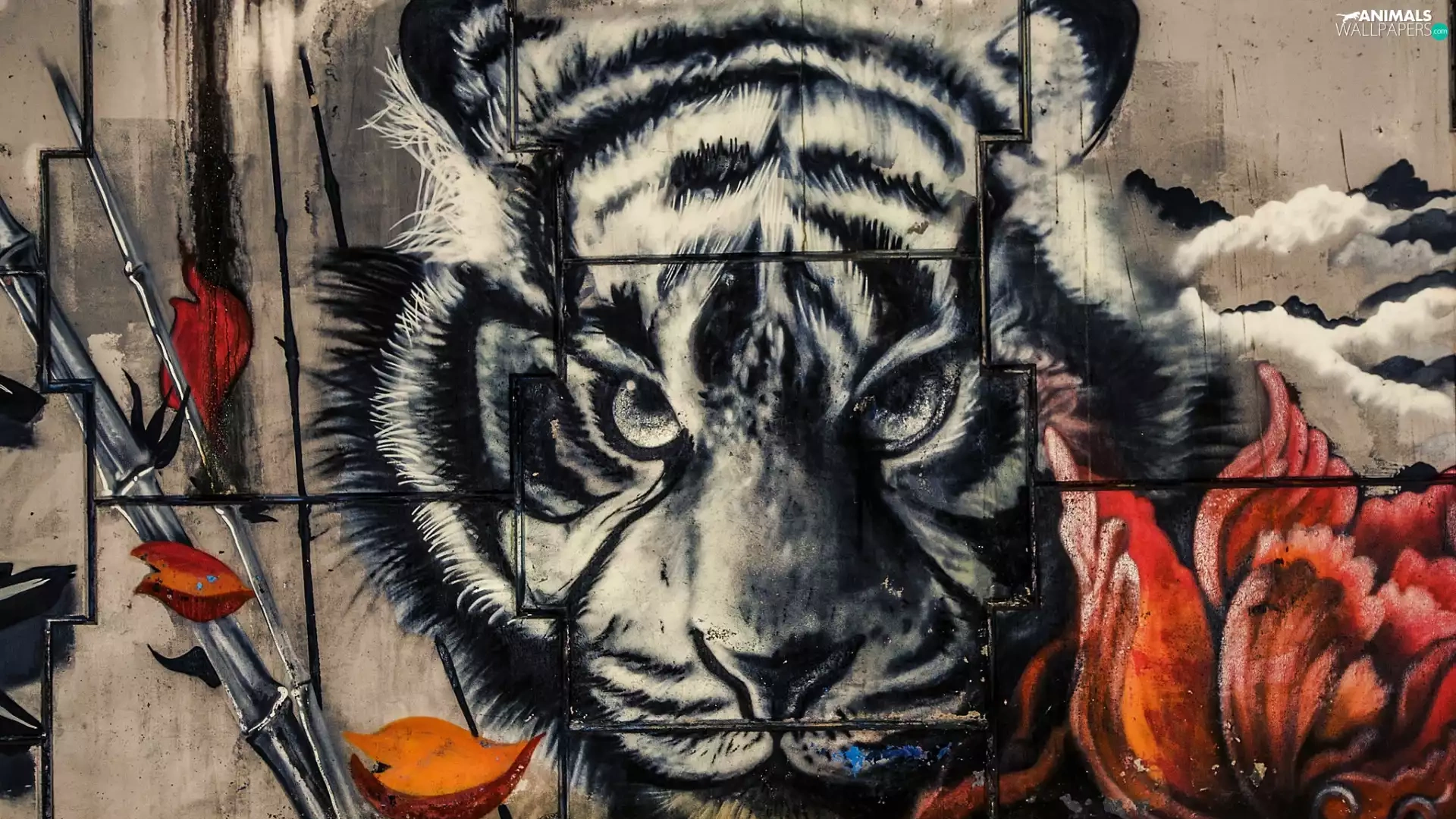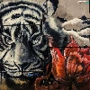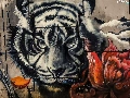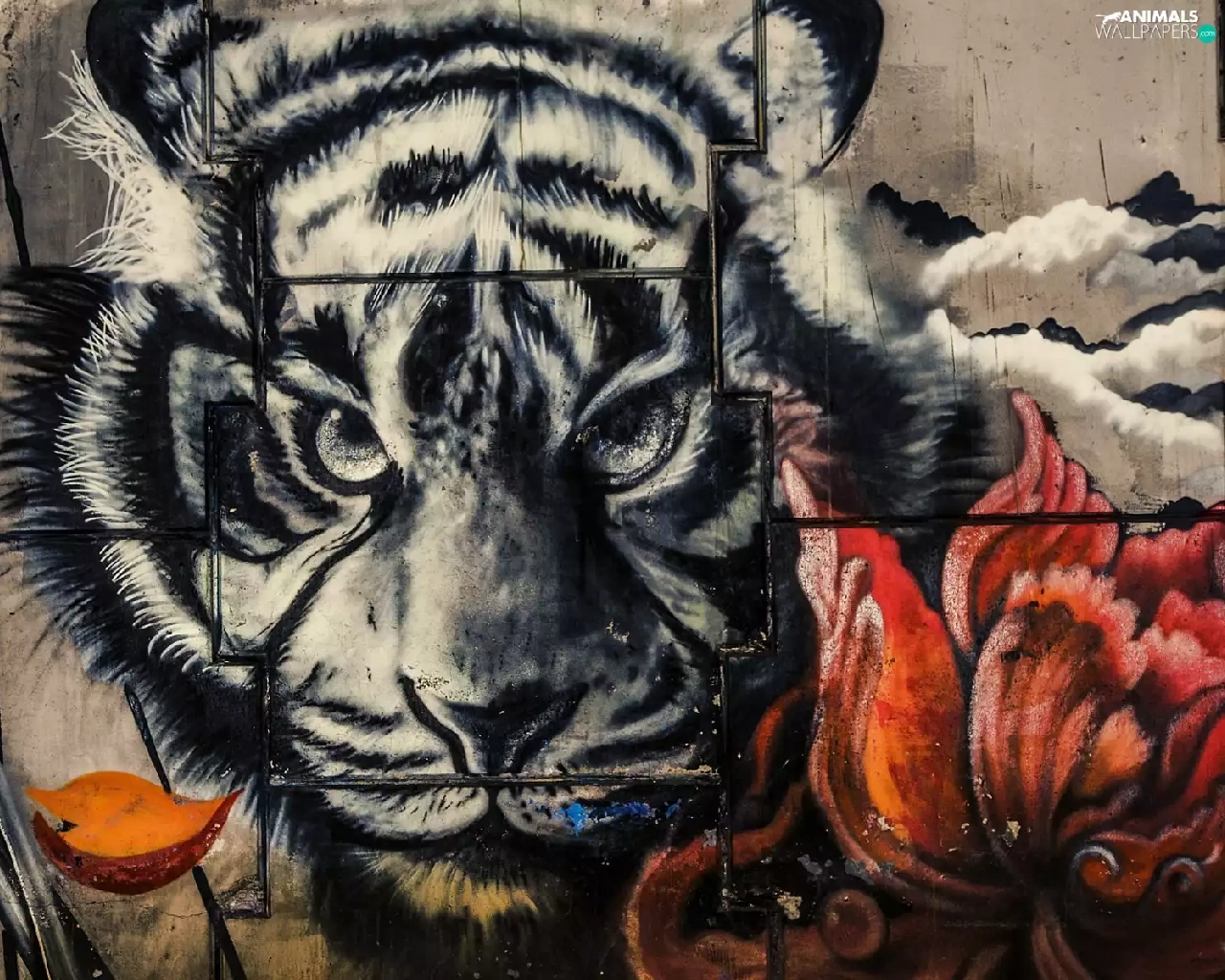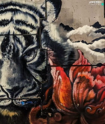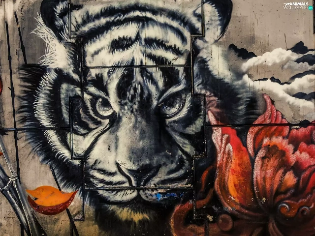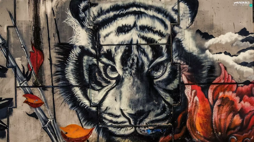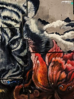 wall, Colourfull Flowers, Head, tiger, Mural