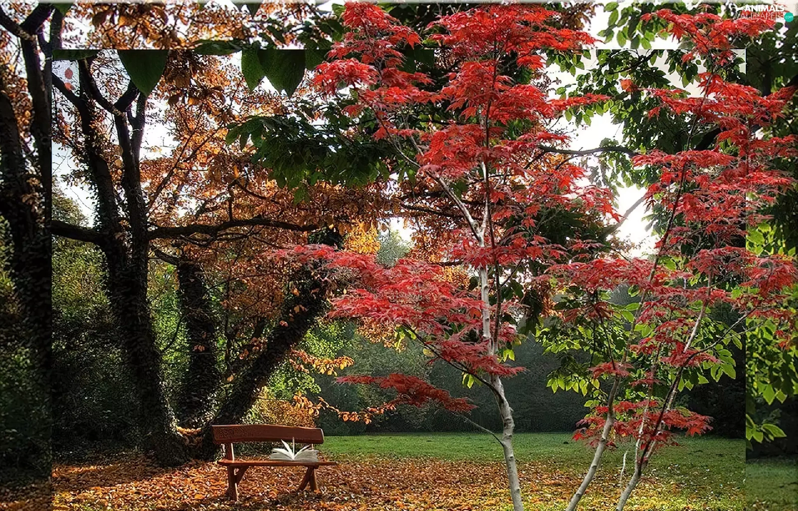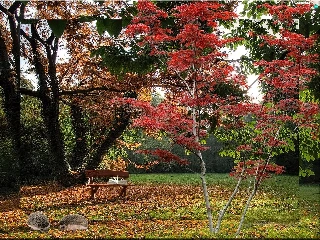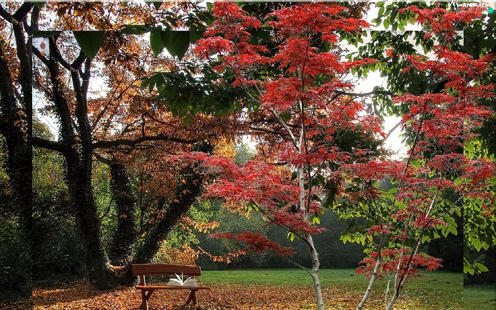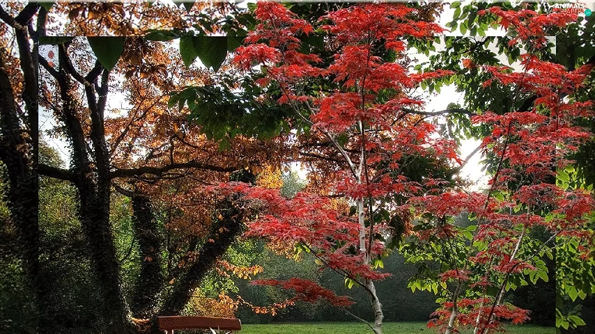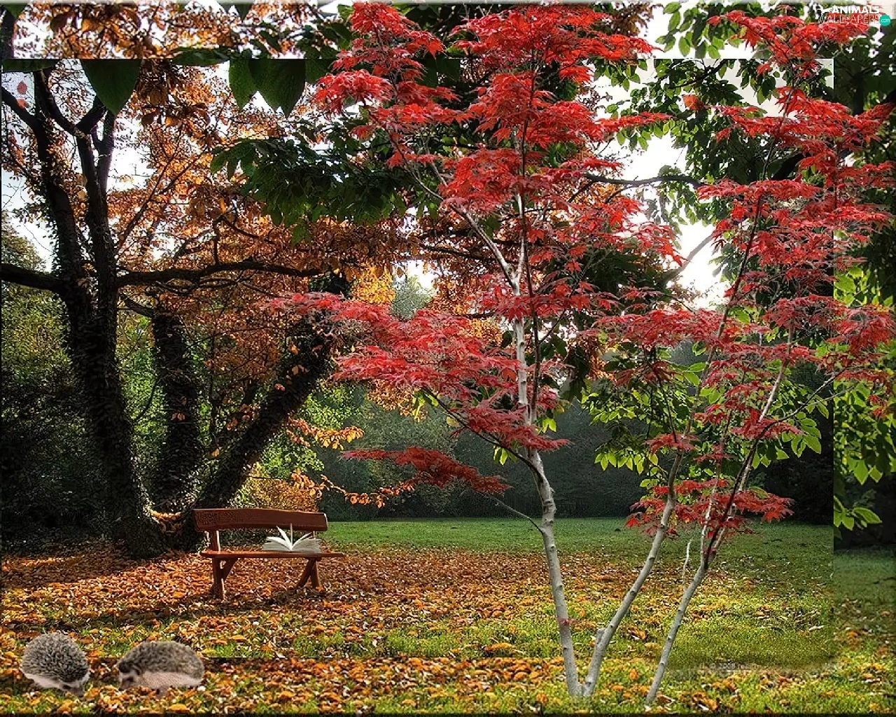 viewes, autumn, Leaf, hedgehogs, Bench, trees