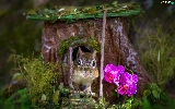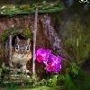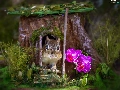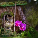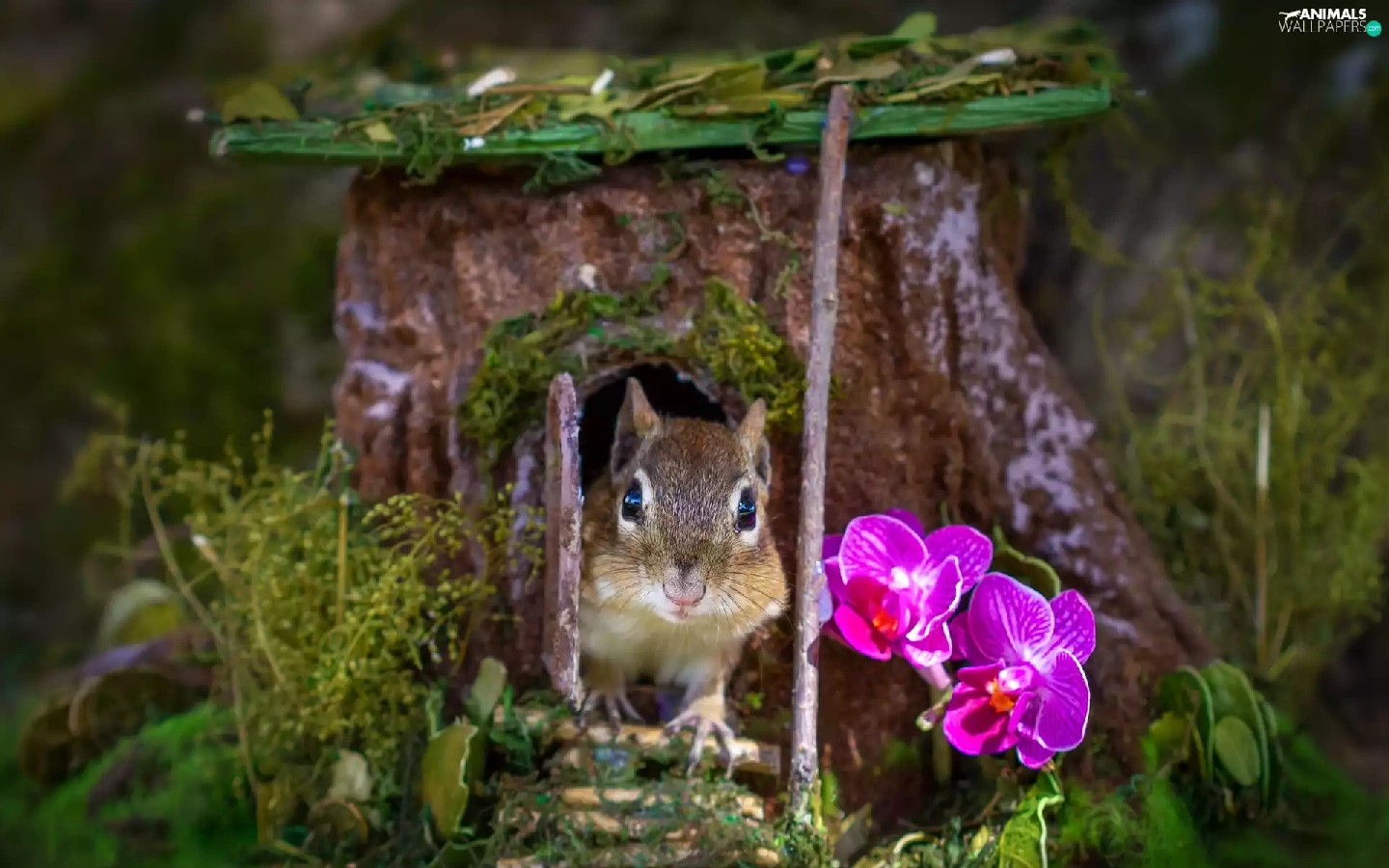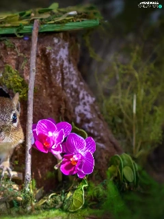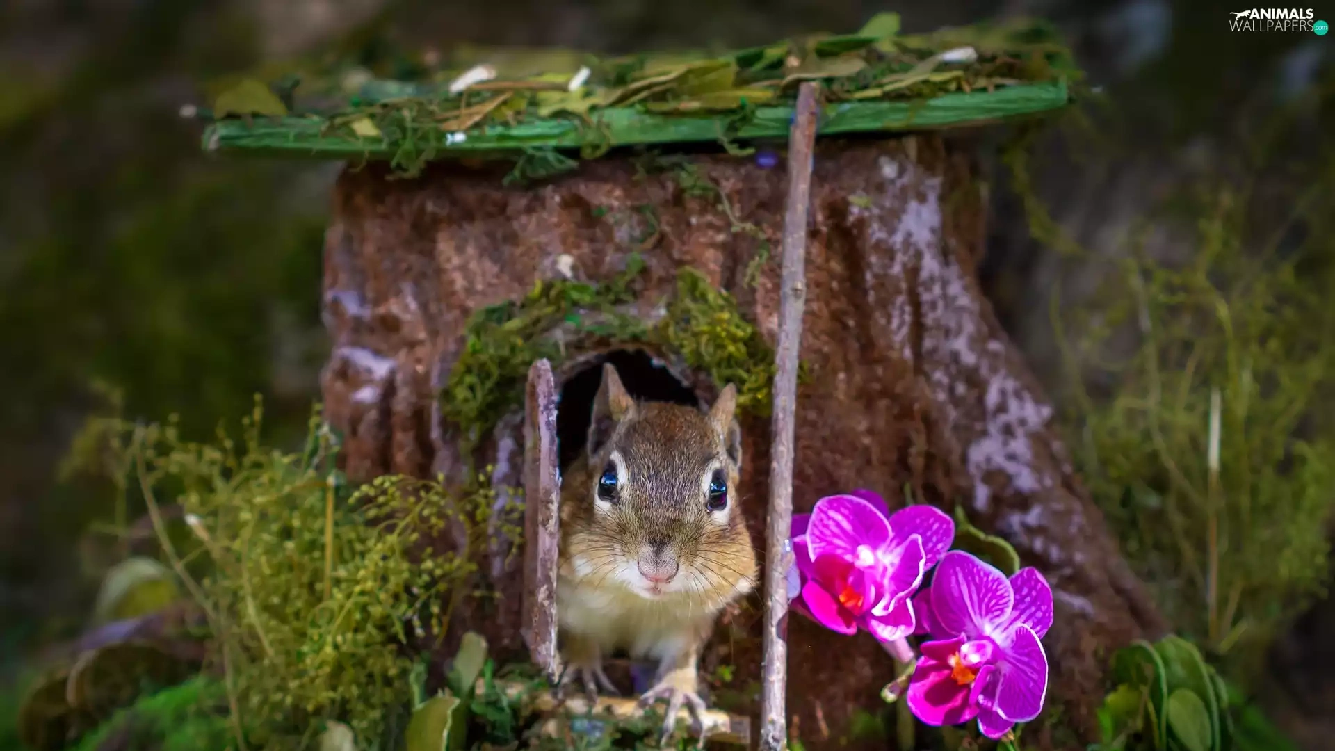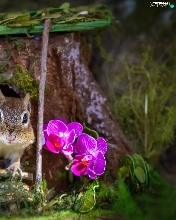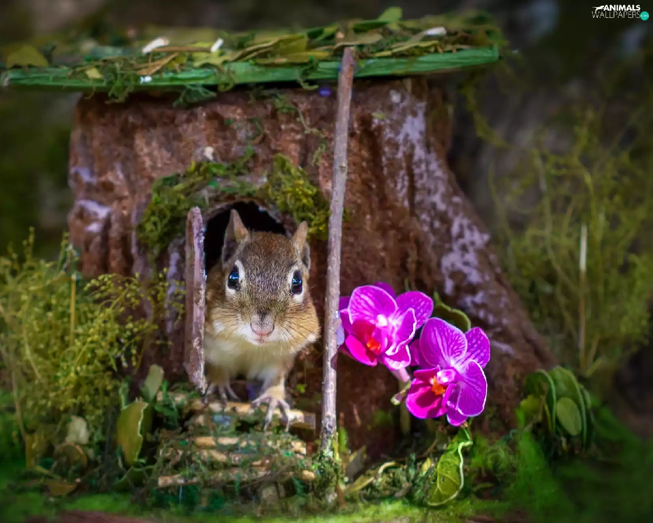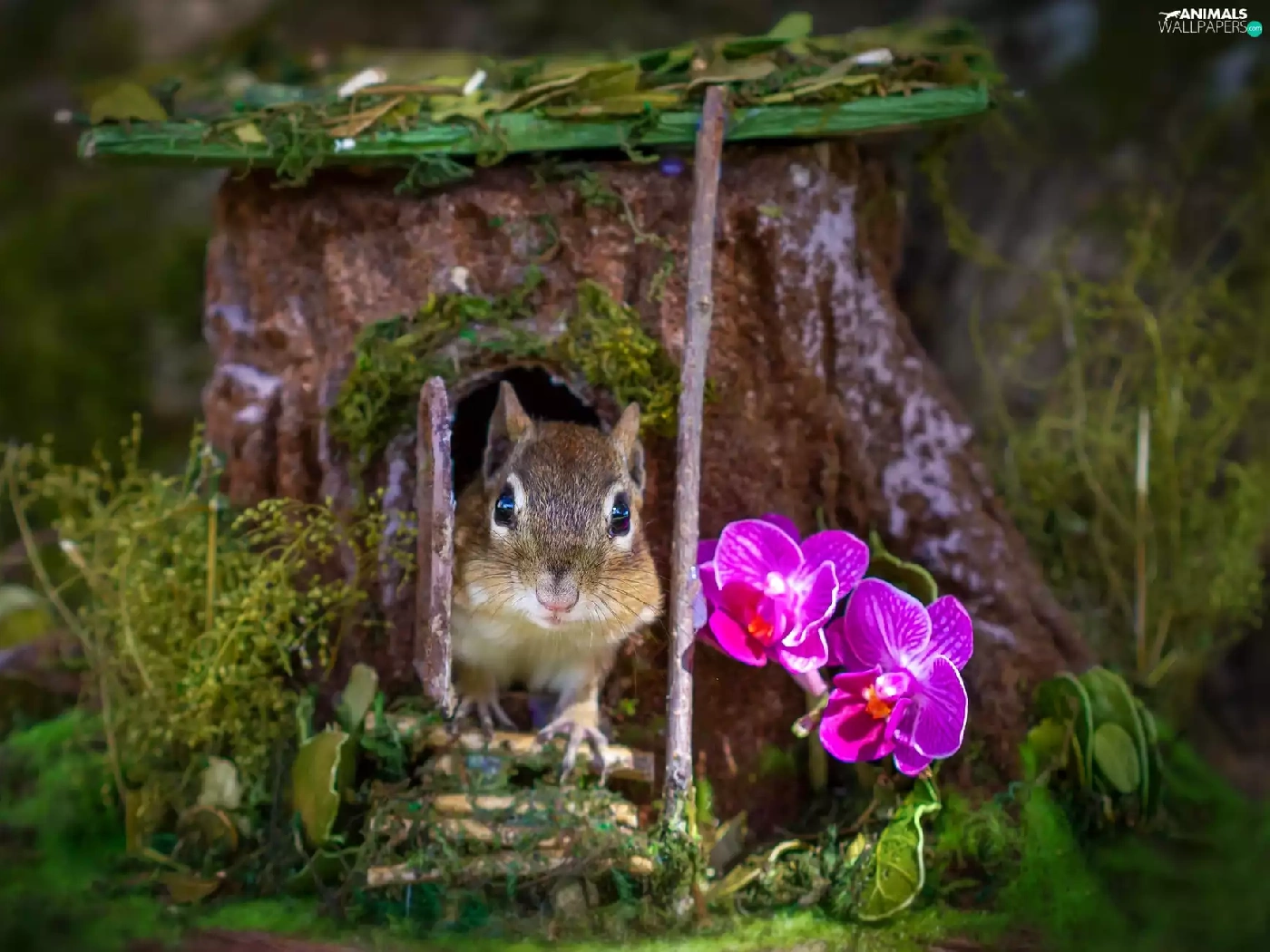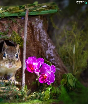 squirrel, trees, orchids, hollow, trunk, Flowers, grass