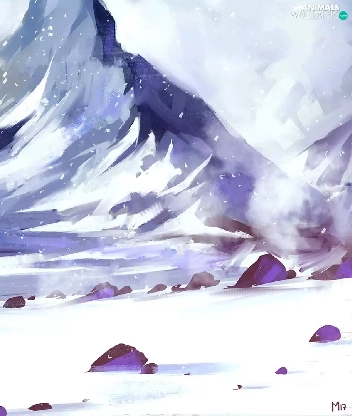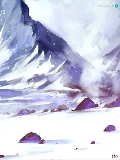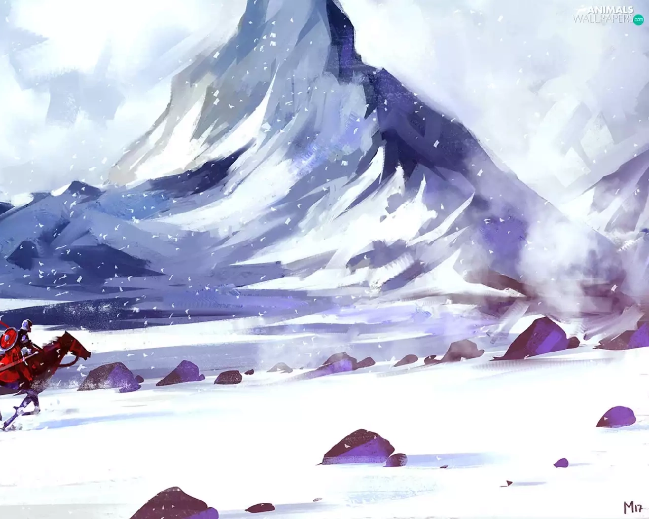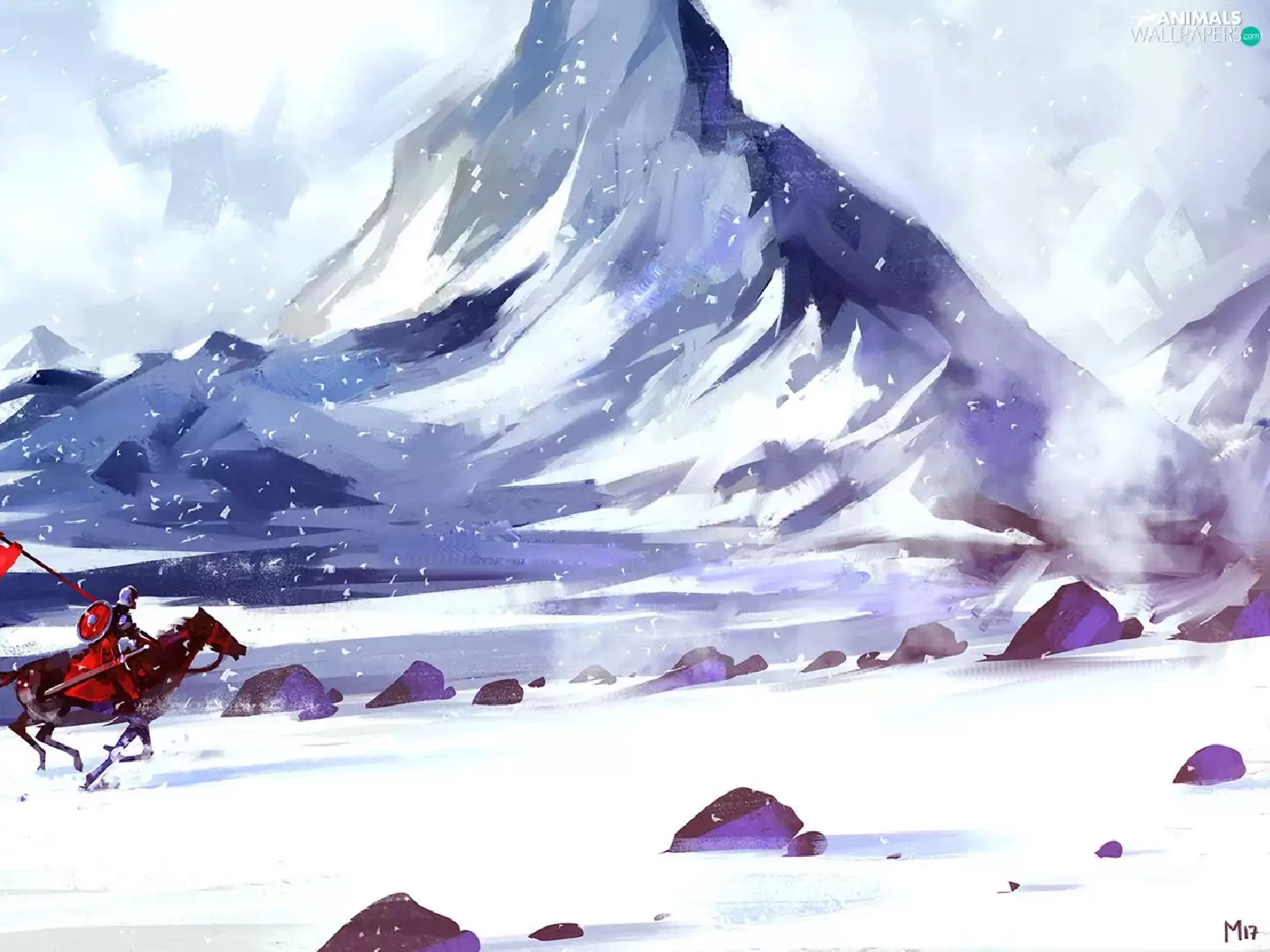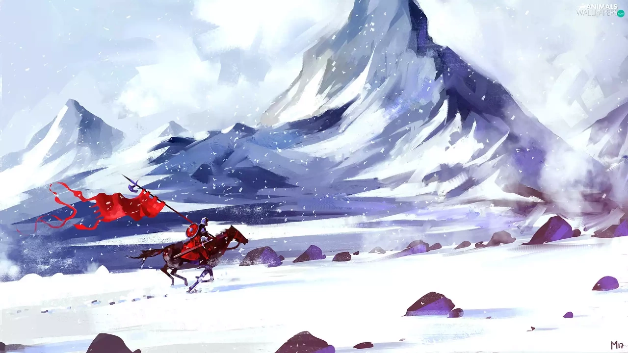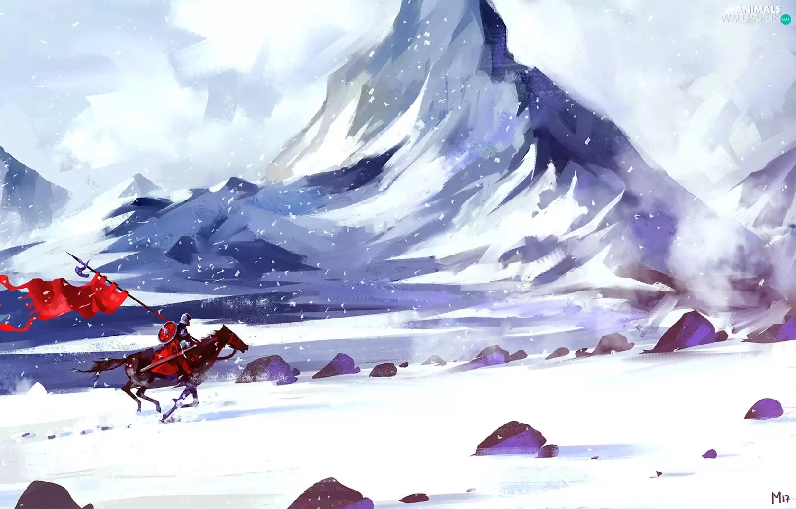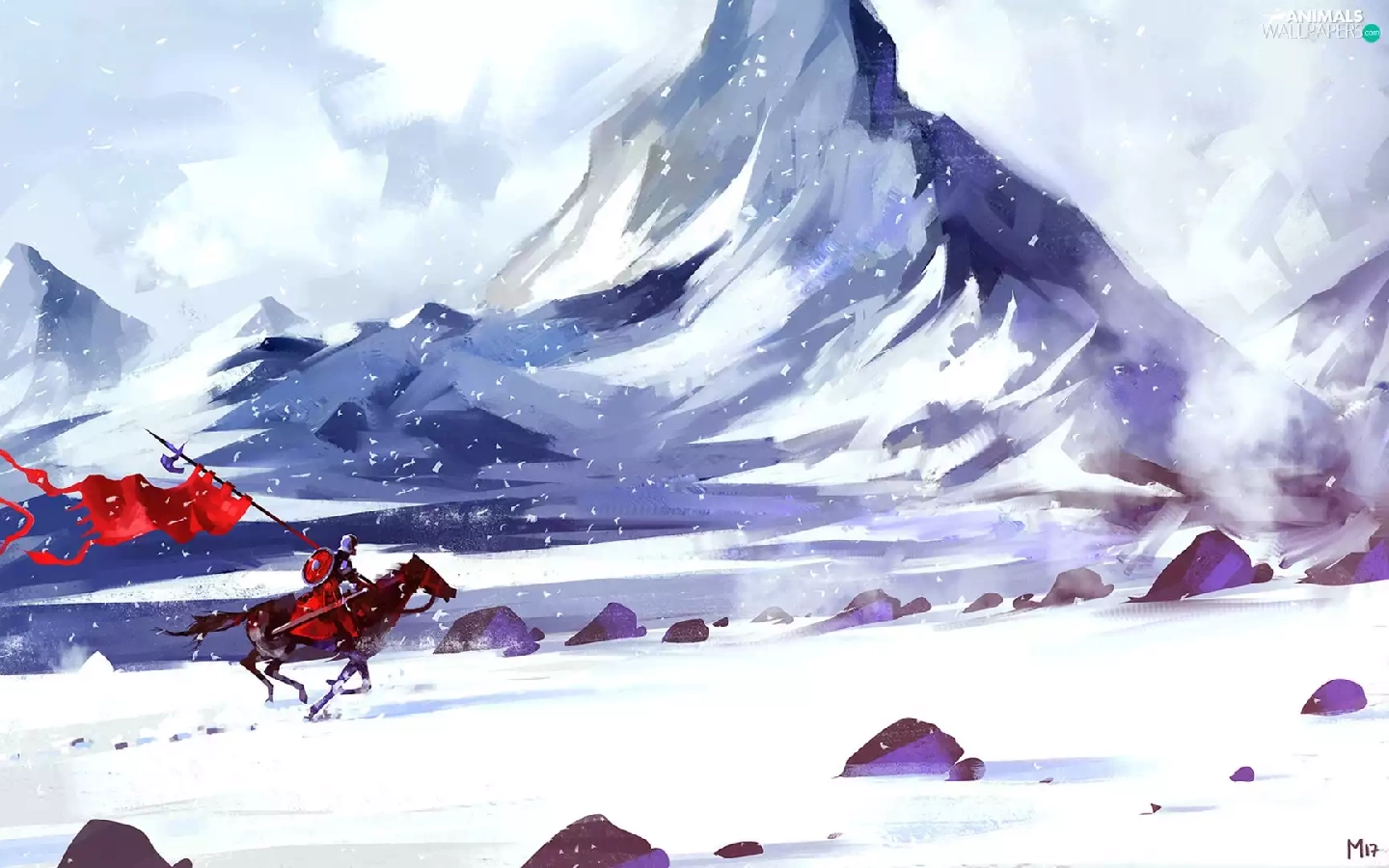 winter, Digital Art, Horse, Banner, Knight, Mountains