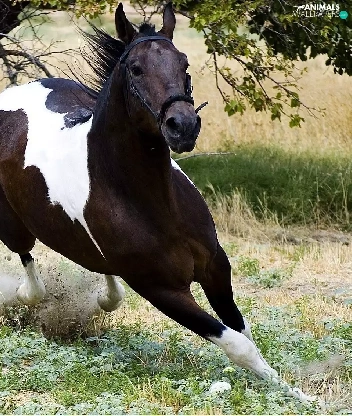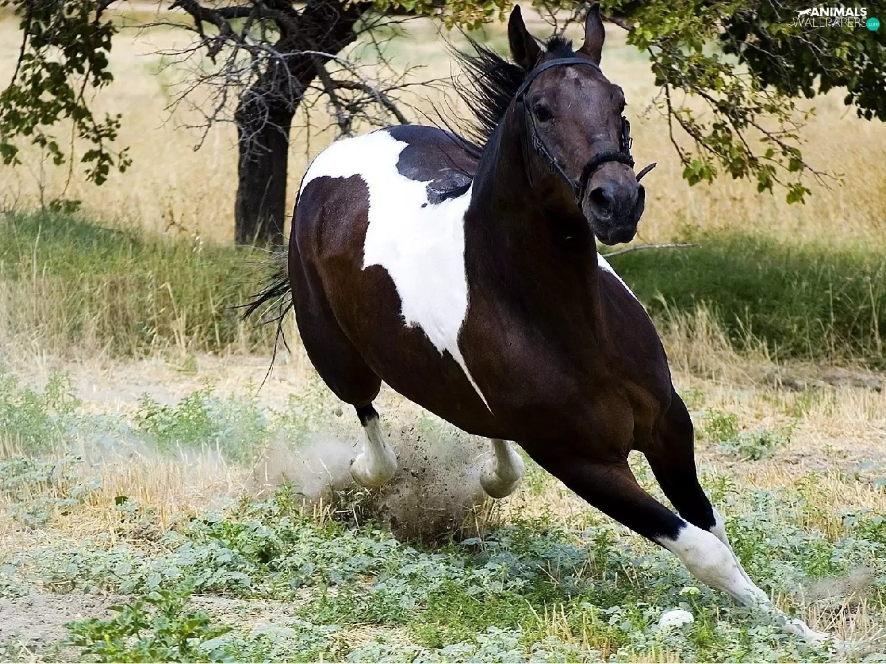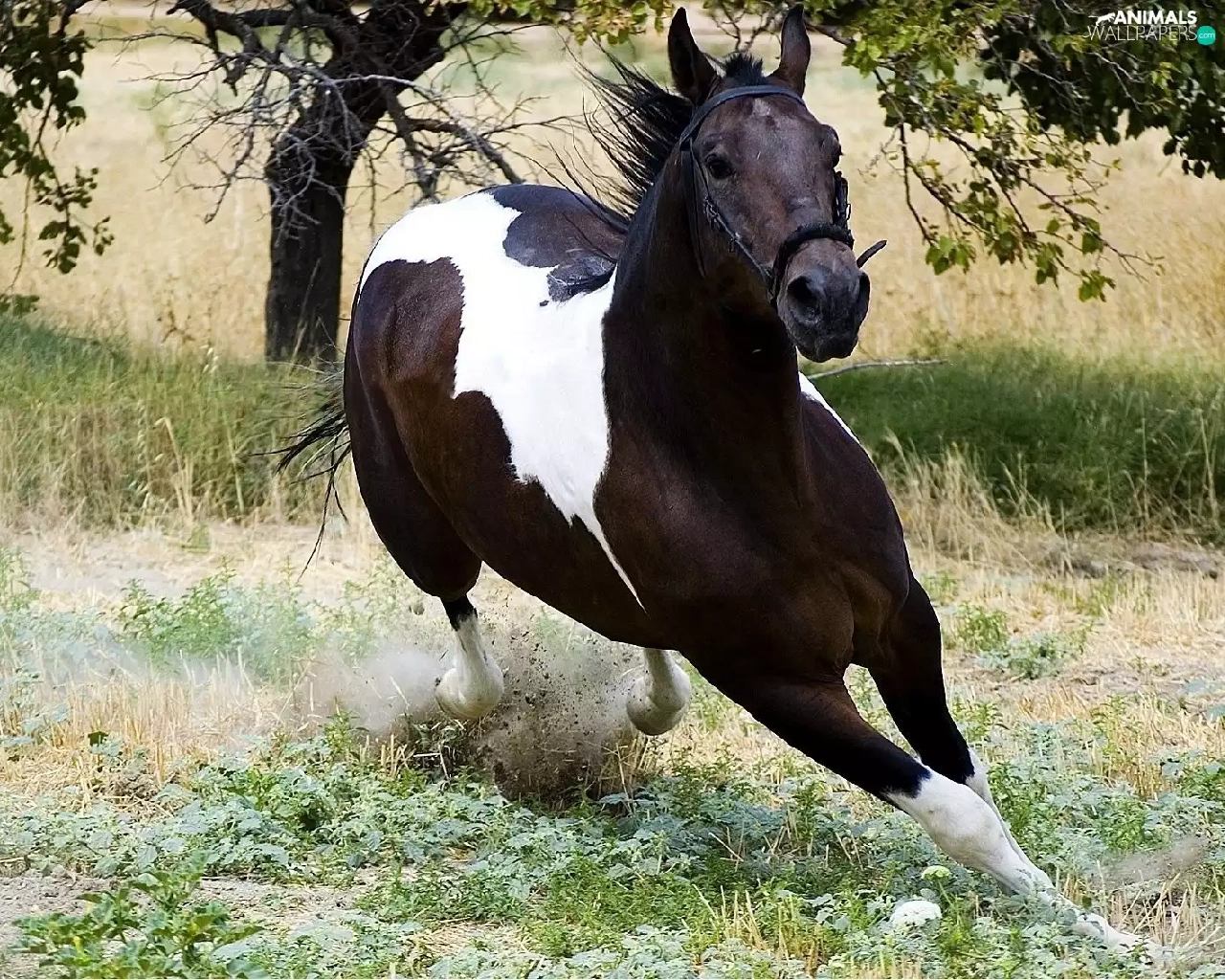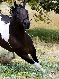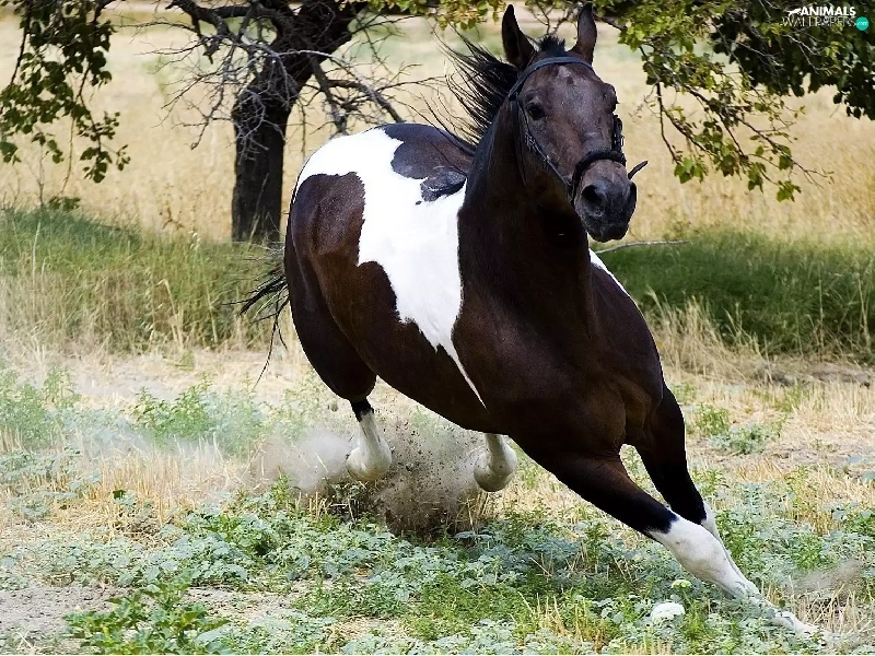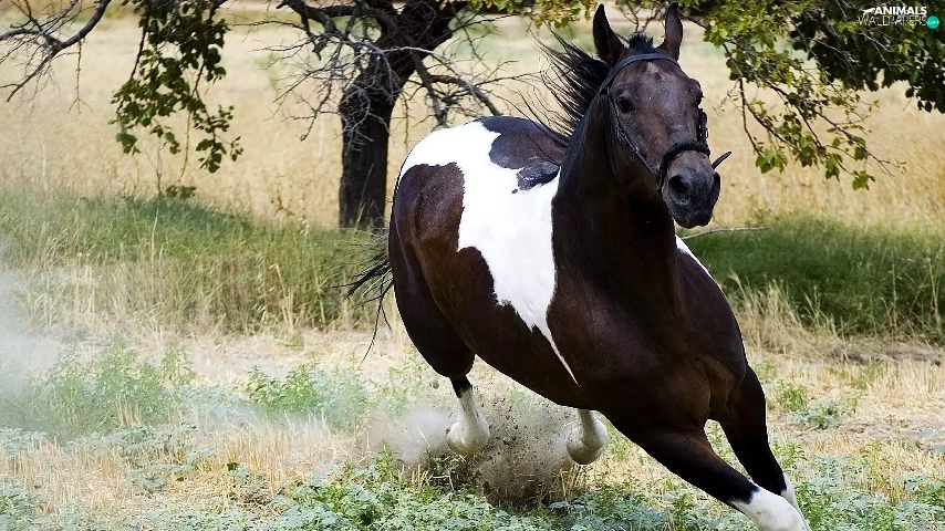 galloping, grass, trees, Horse