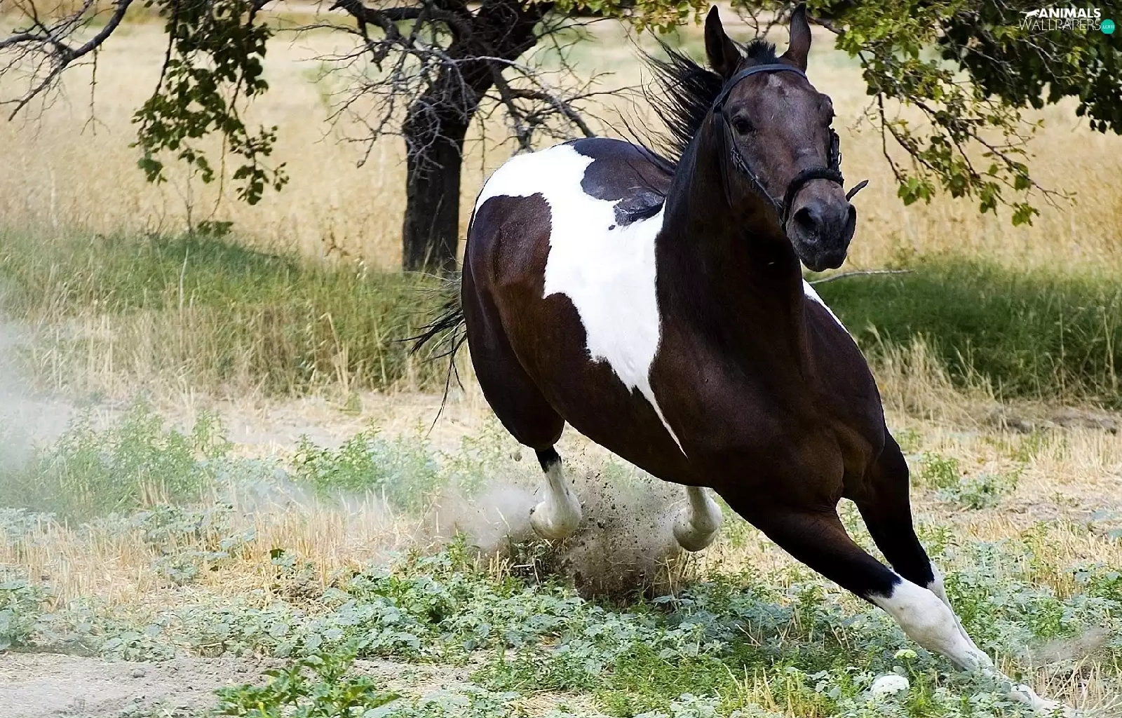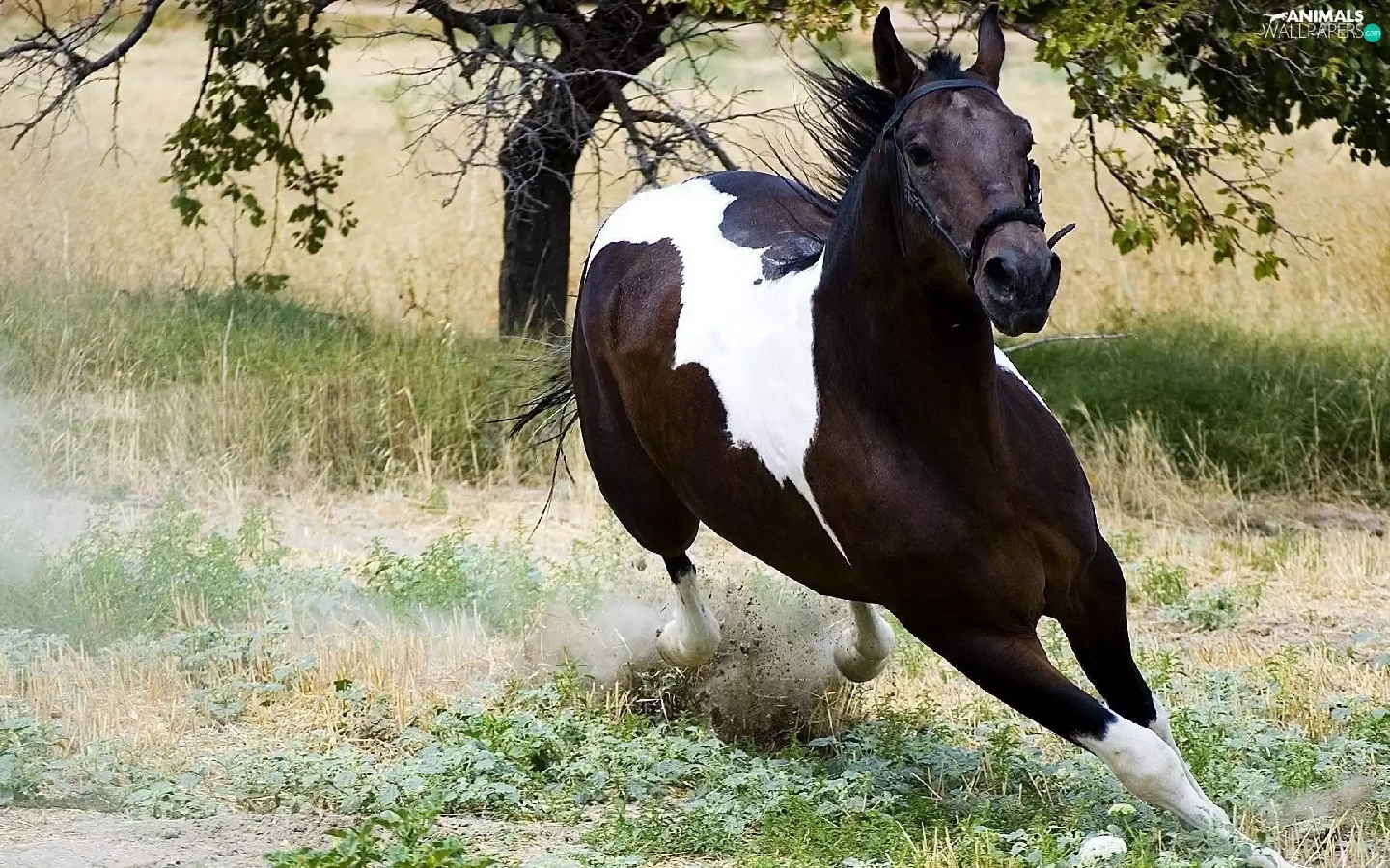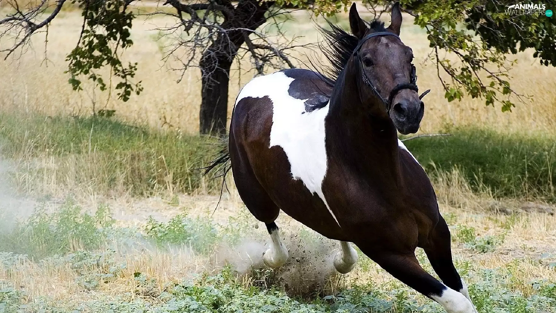 galloping, grass, trees, Horse