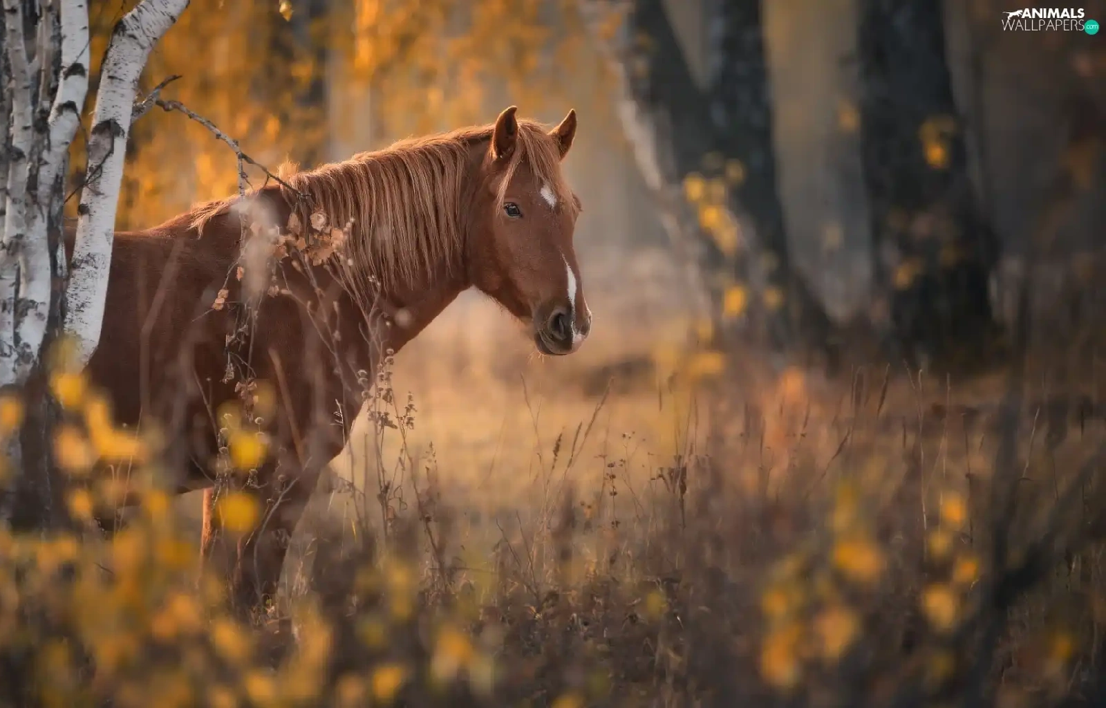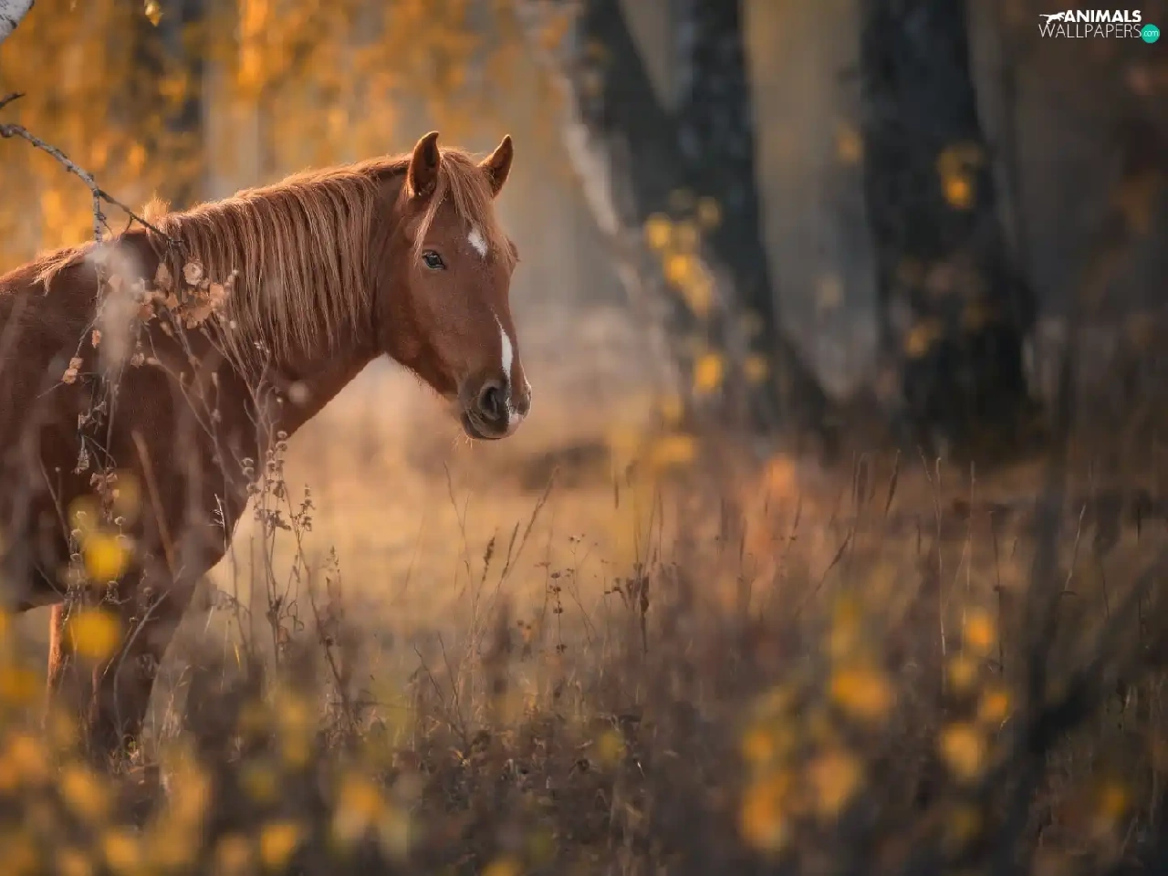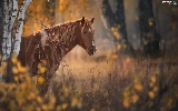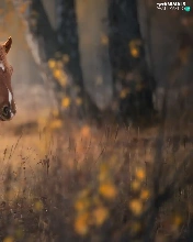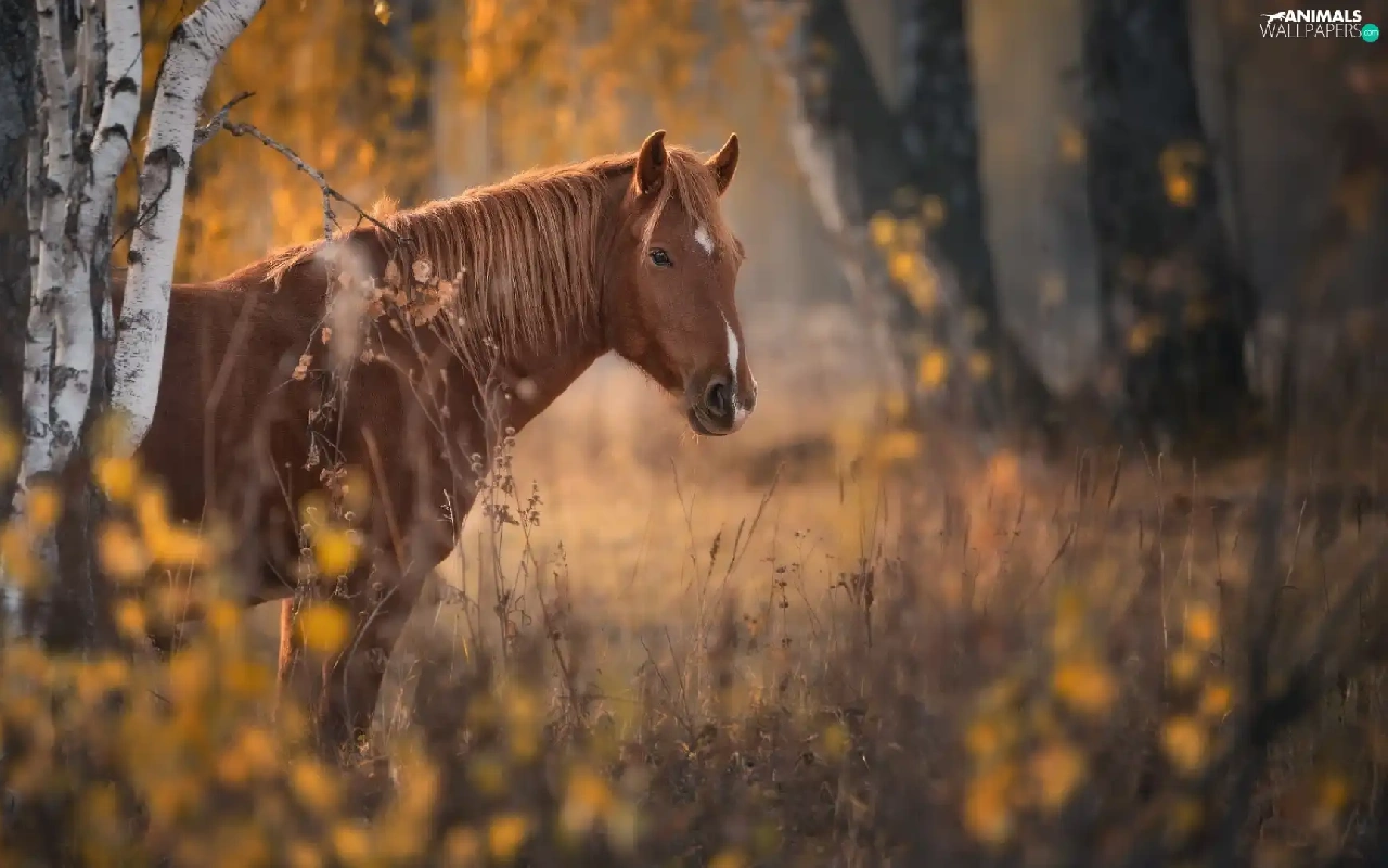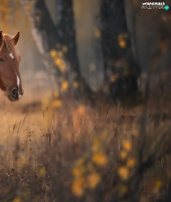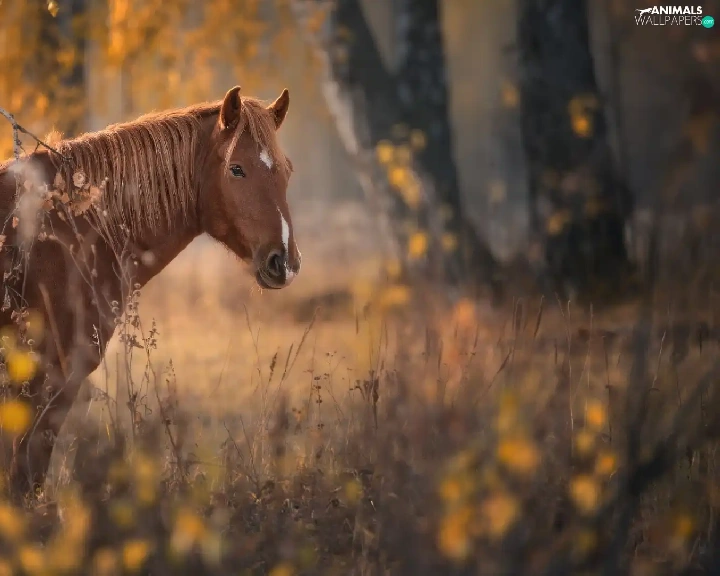Brown, Horse, viewes, forest, trees