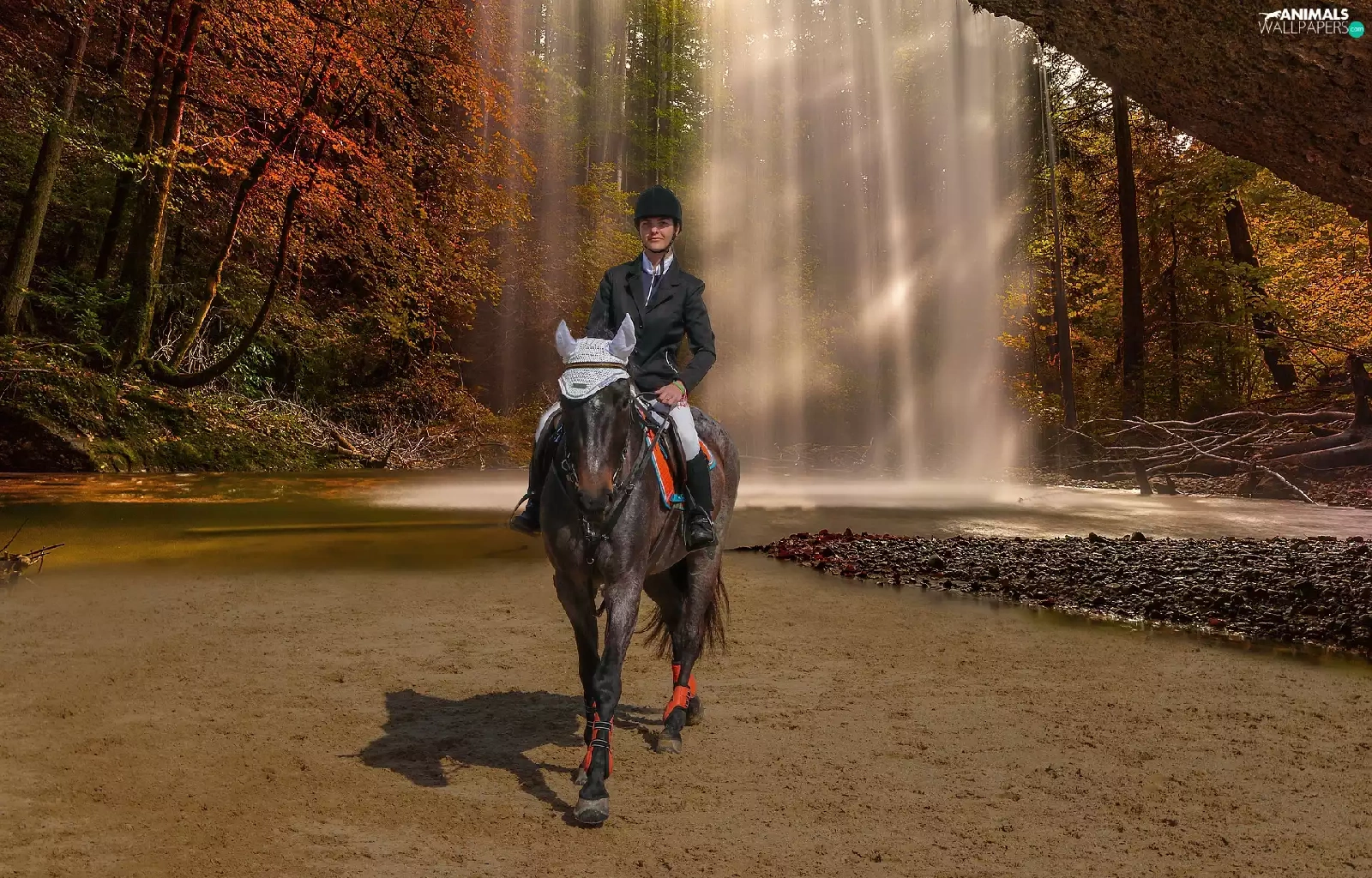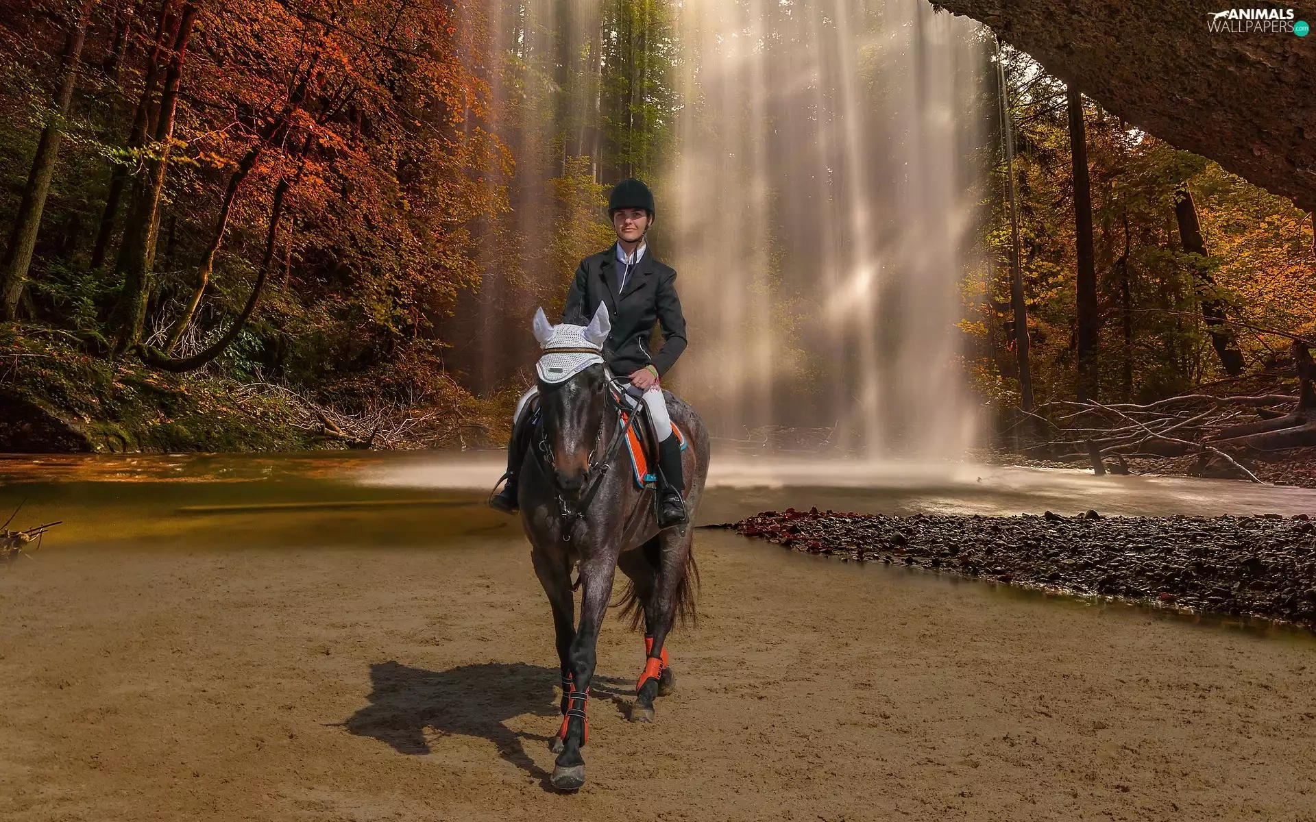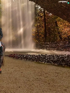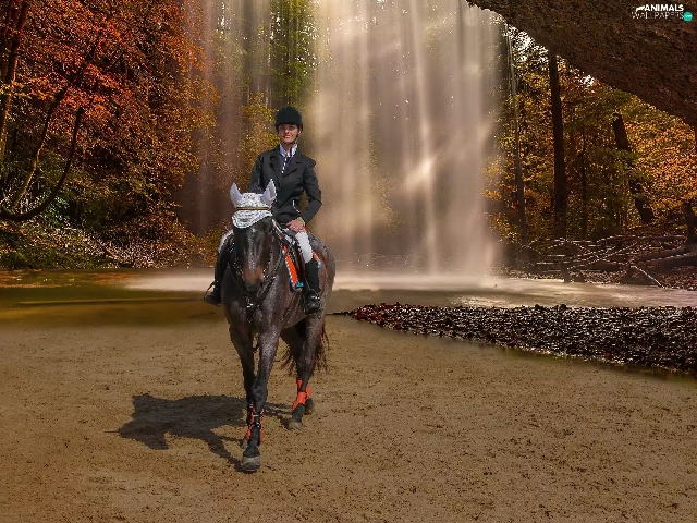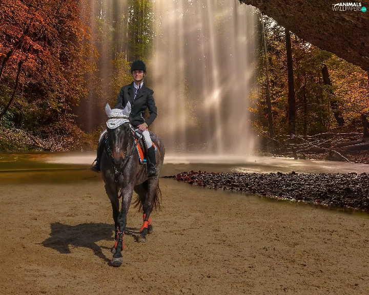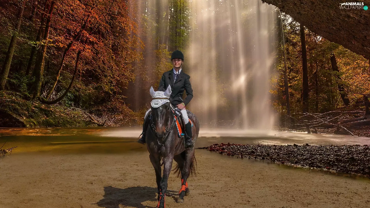 Women, waterfall, autumn, Horse