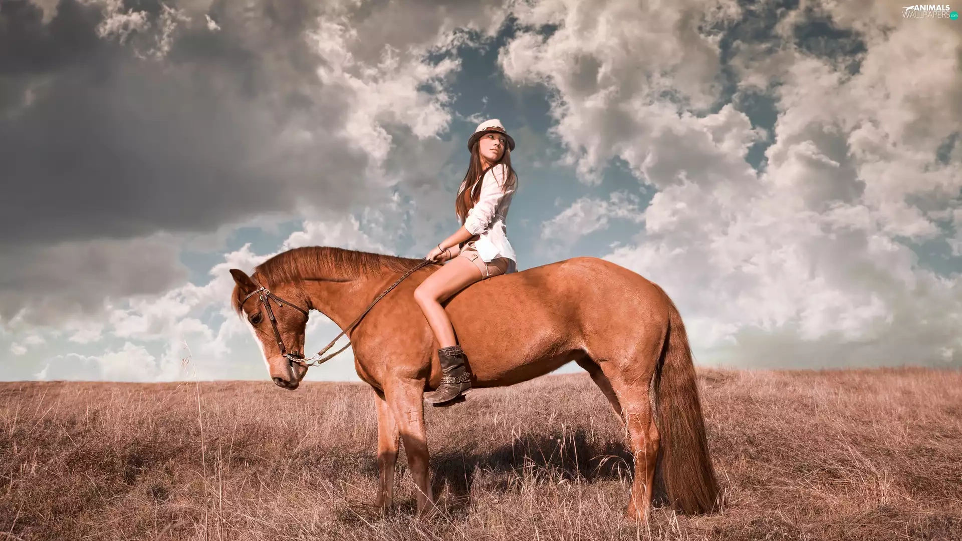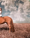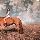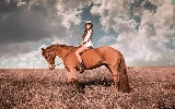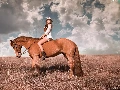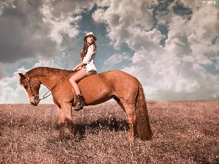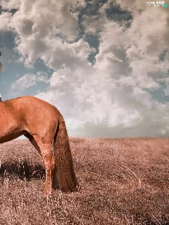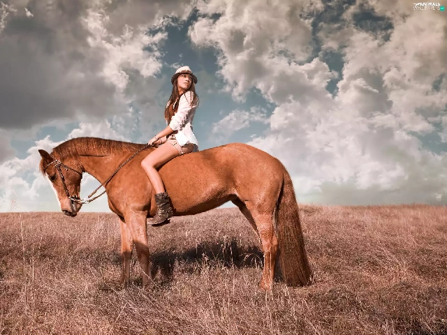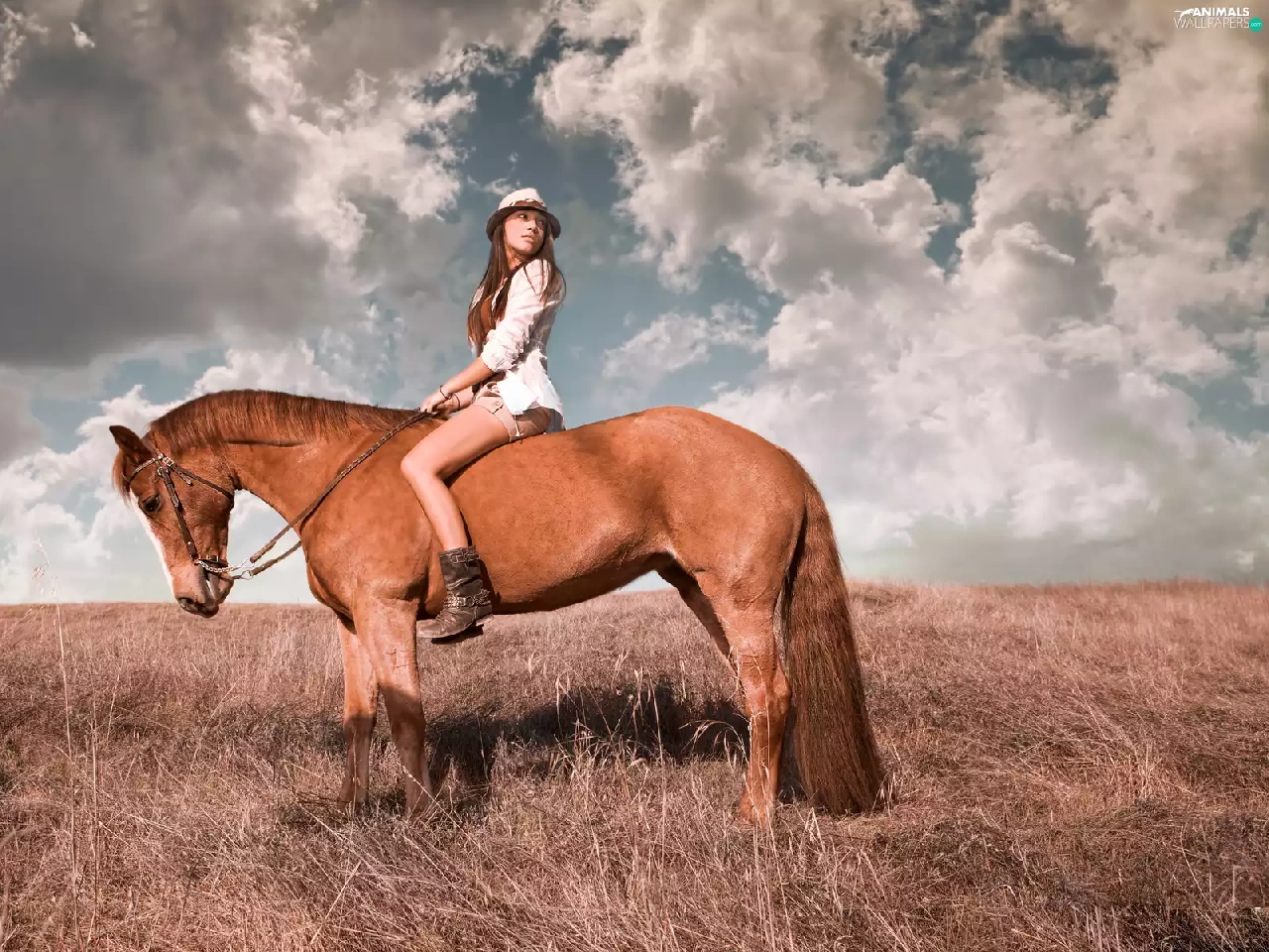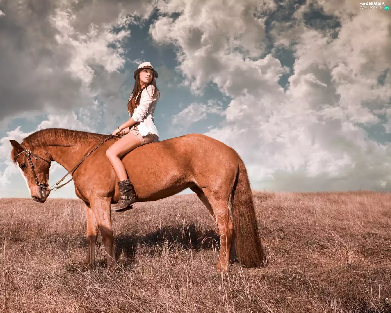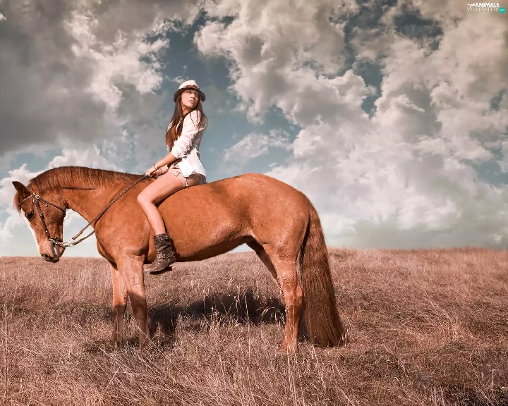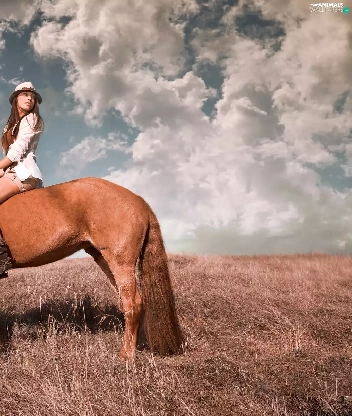 Women, Meadow, clouds, Horse