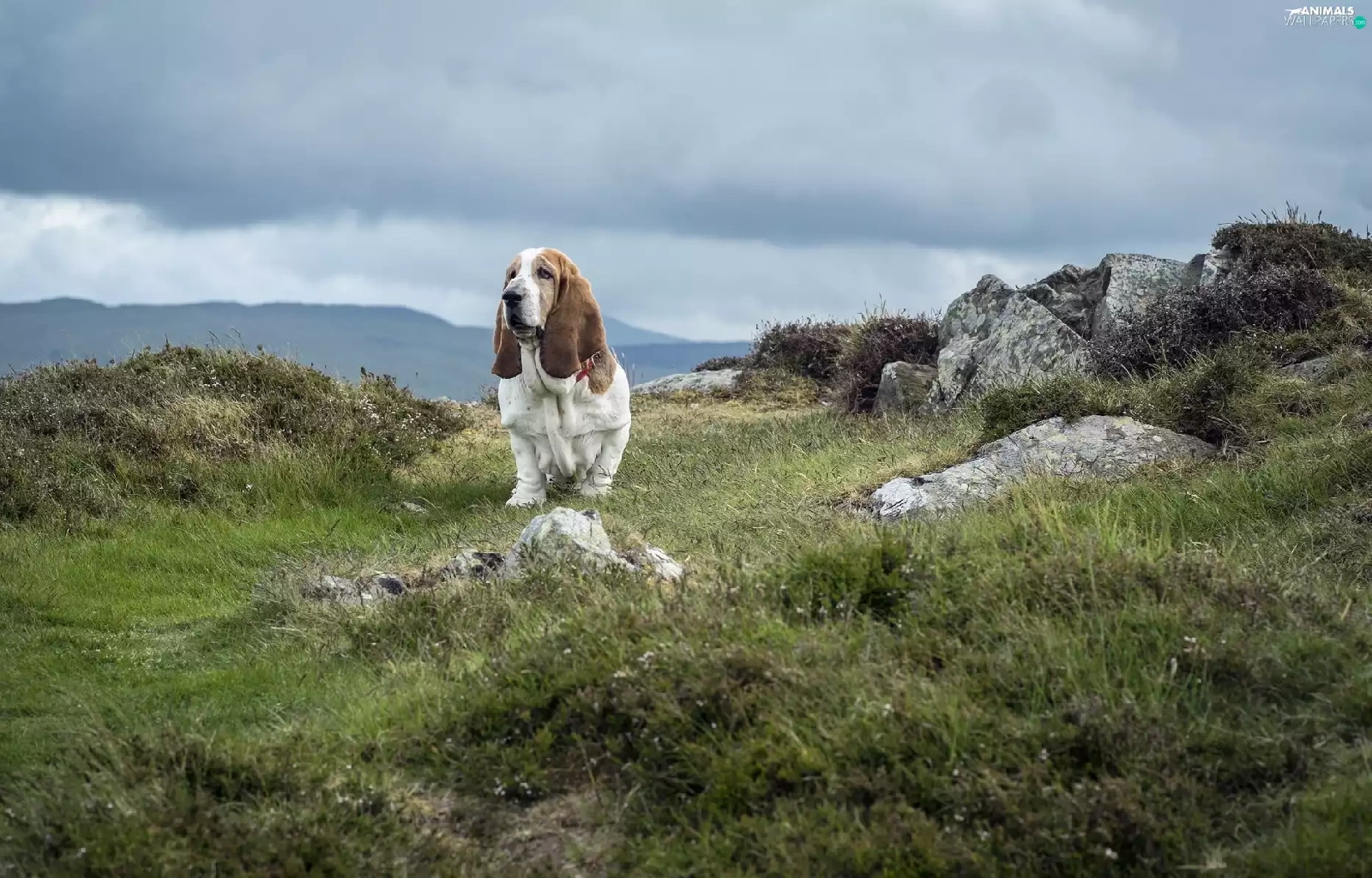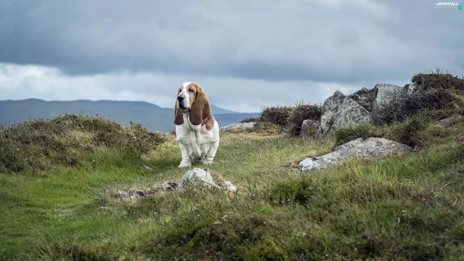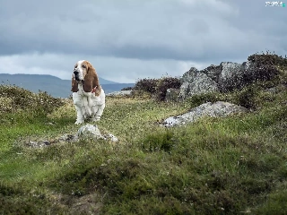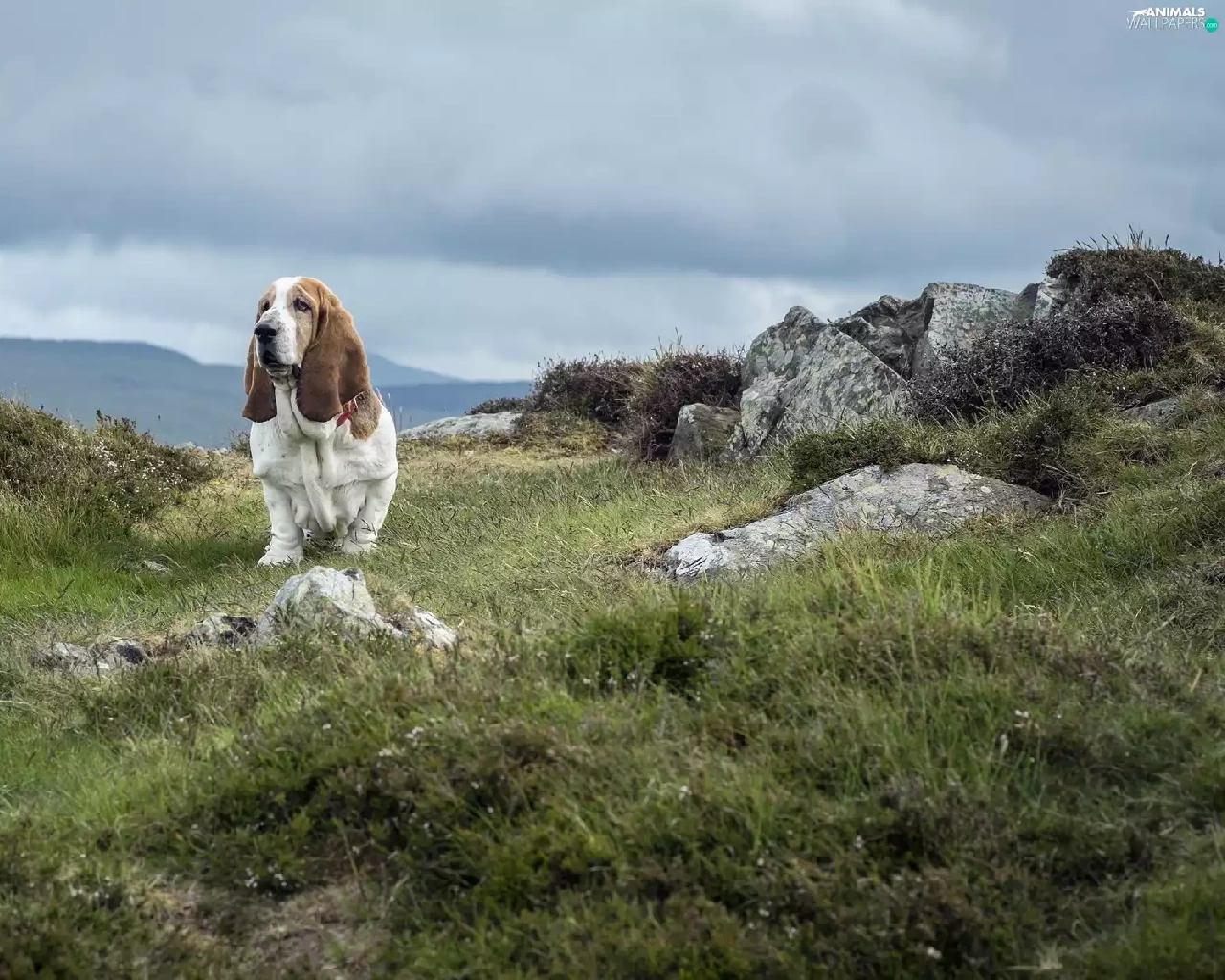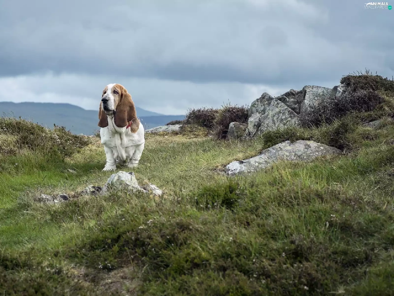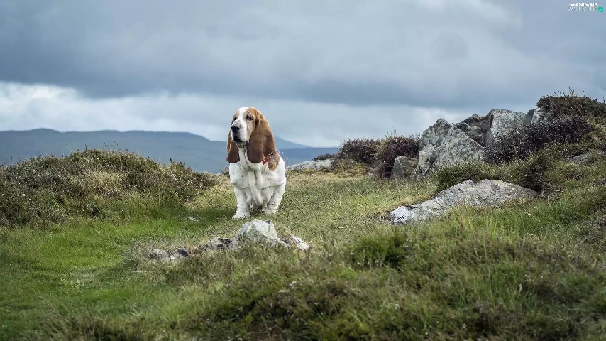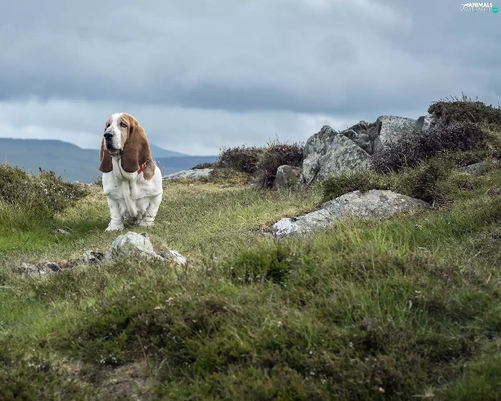 basset, Stones, grass, Hound