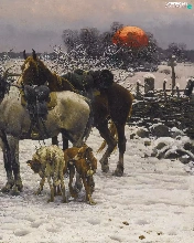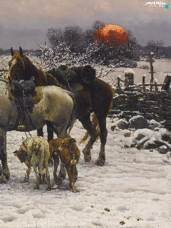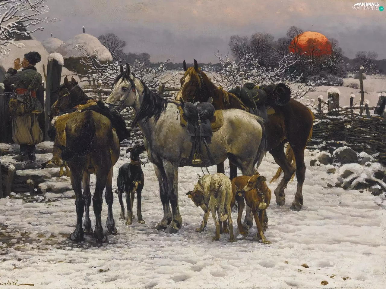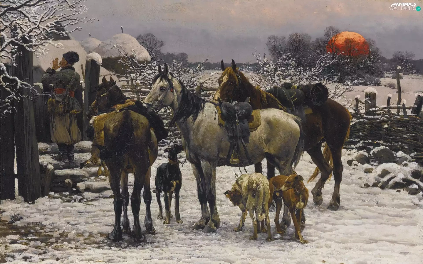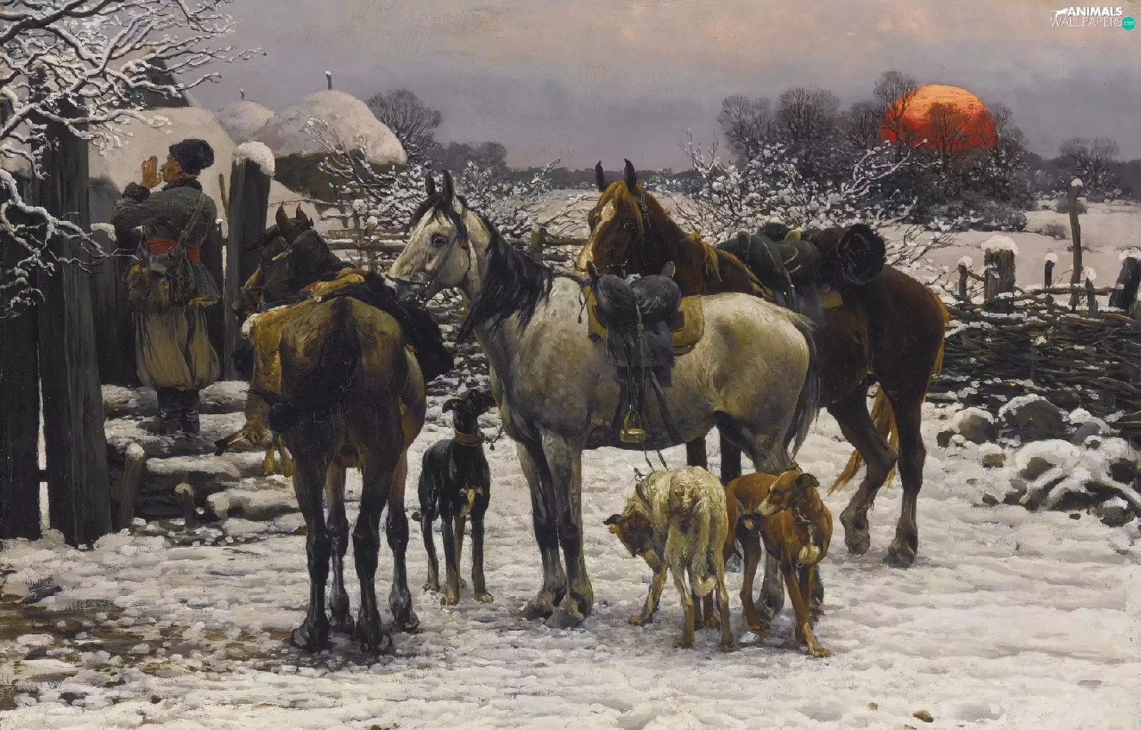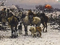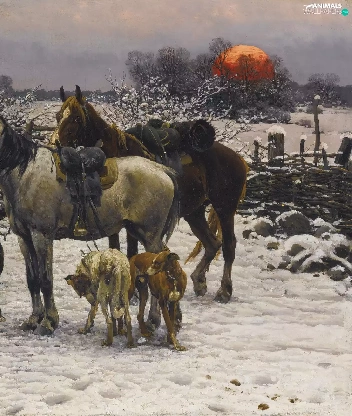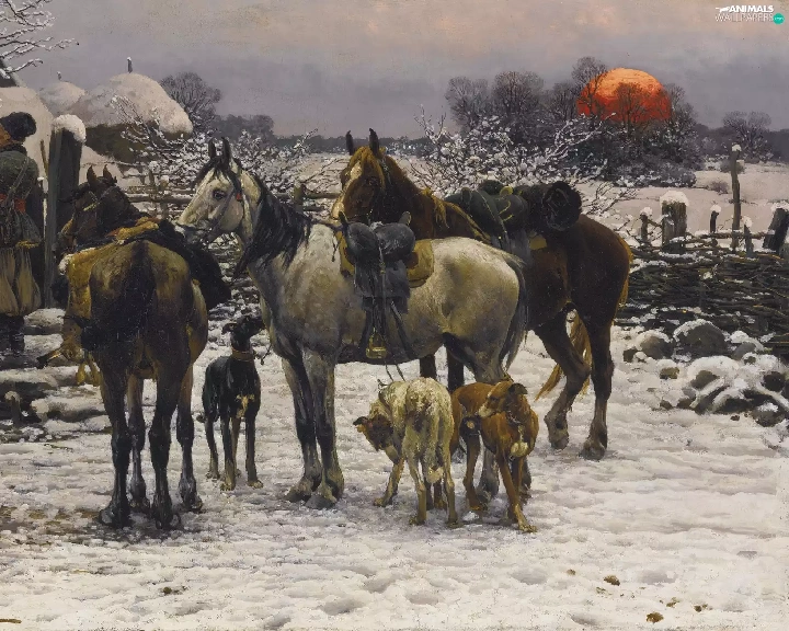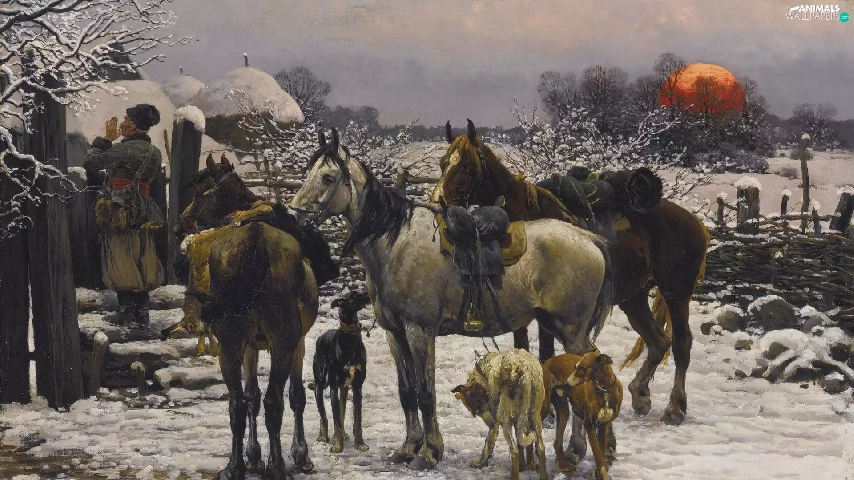 house, Dogs, Paintings Reproduction, winter, bloodstock, Characters, Alfred Wierusz-Kowalski