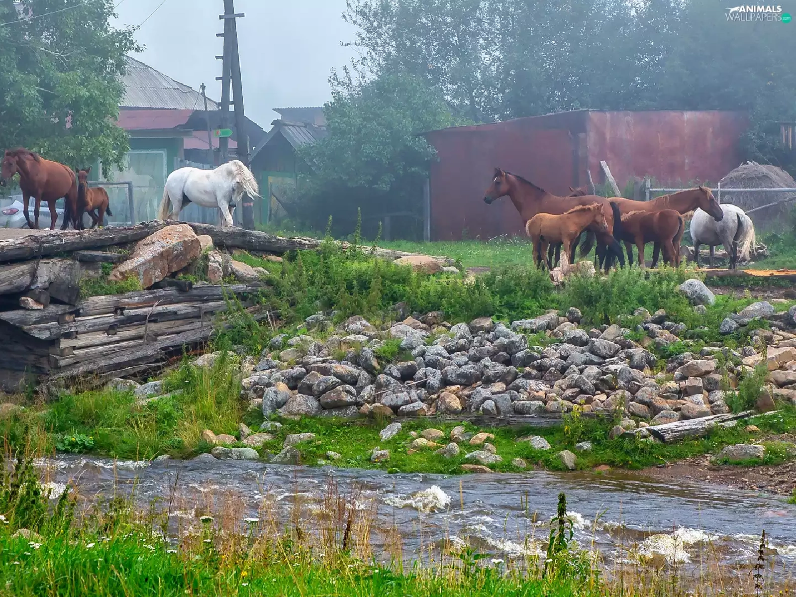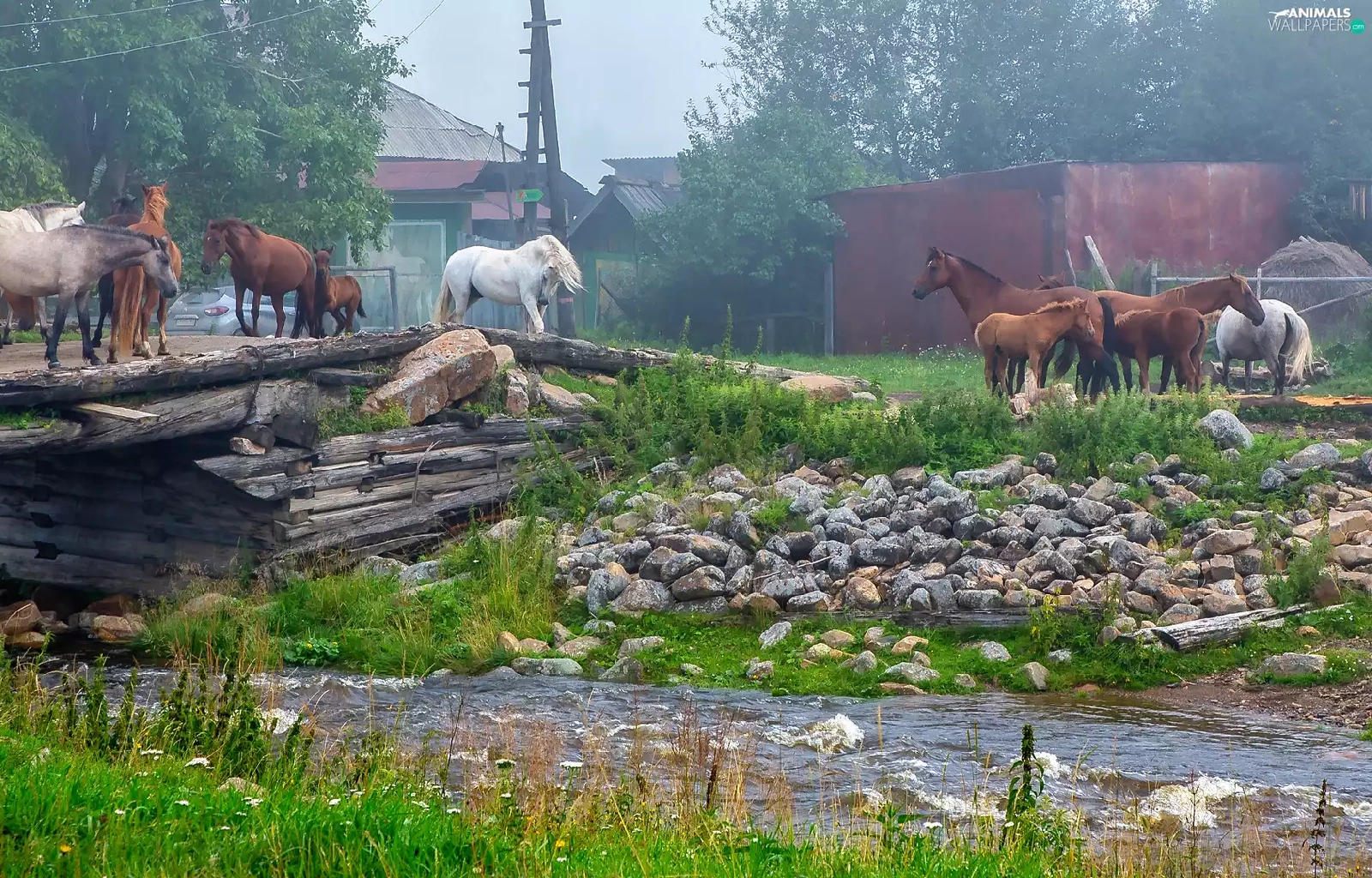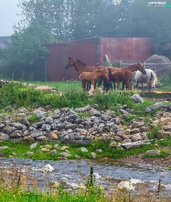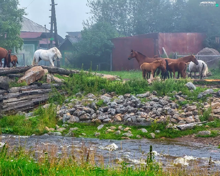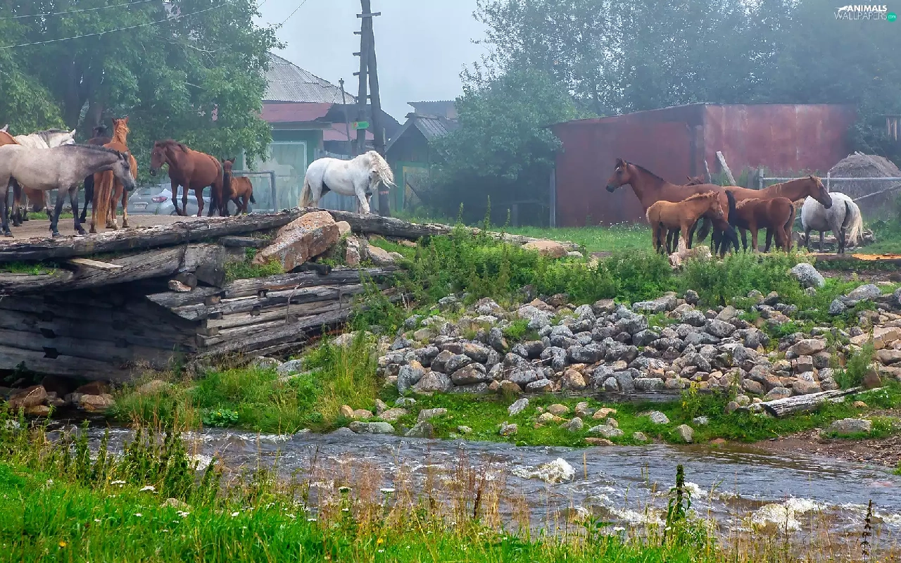 bridges, bloodstock, grass, Houses, River, Stones