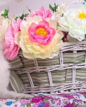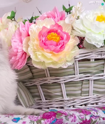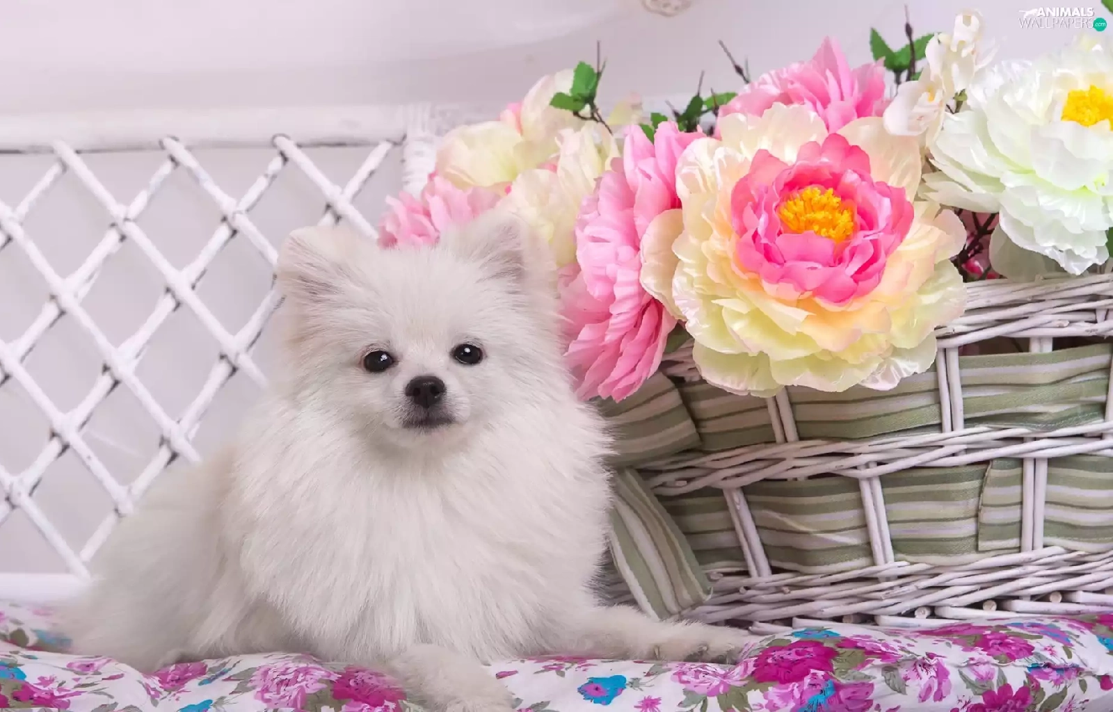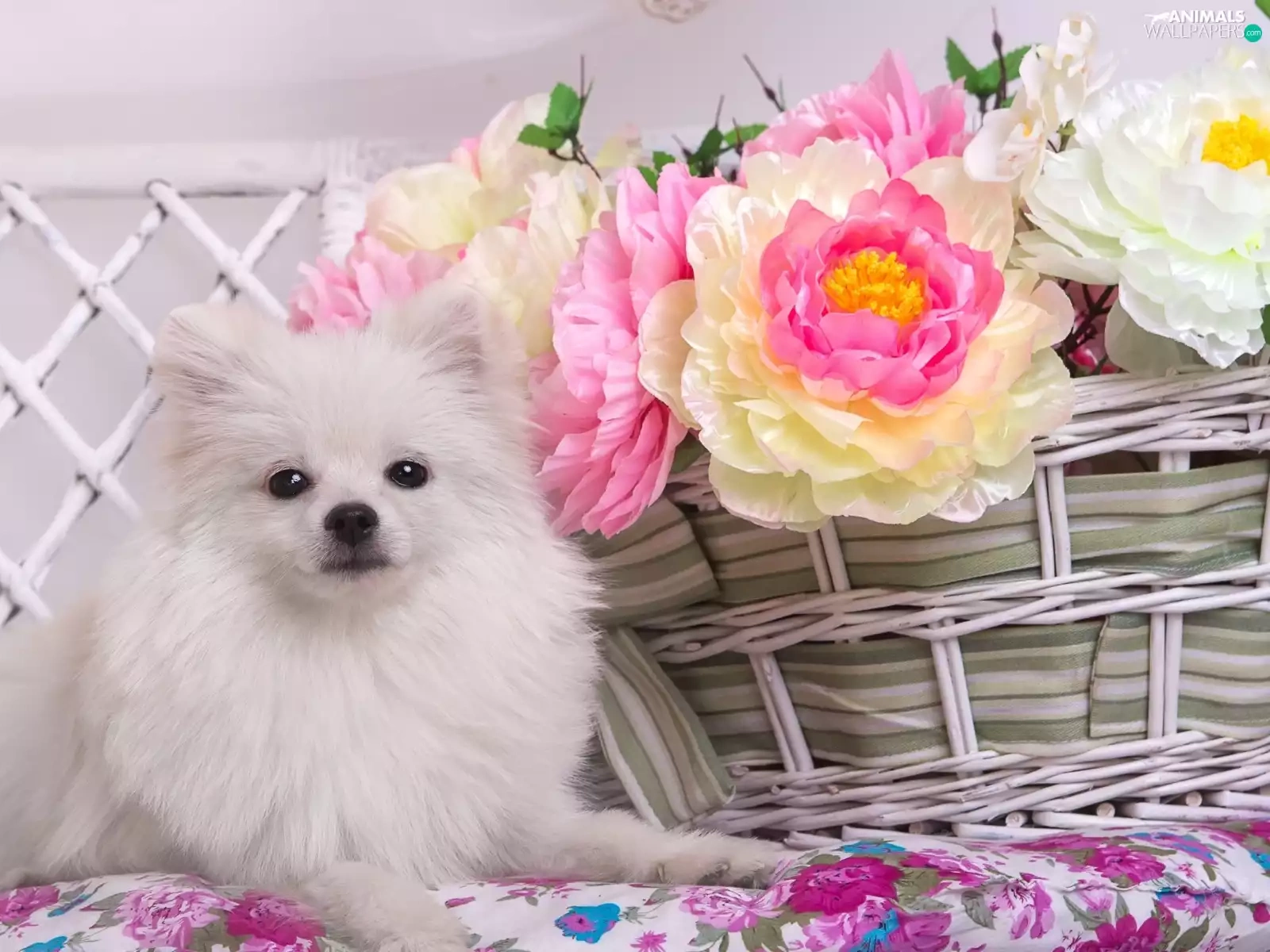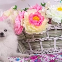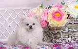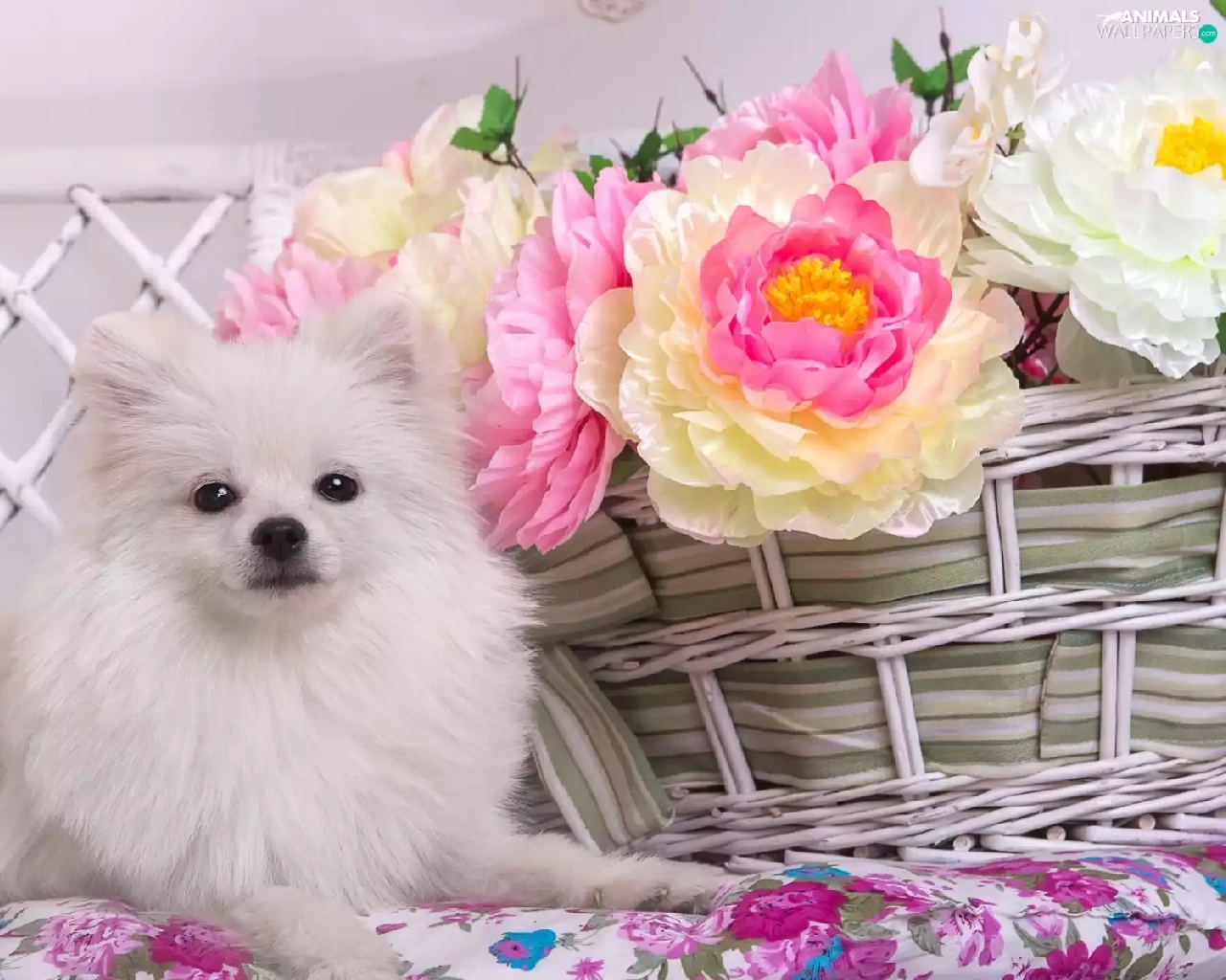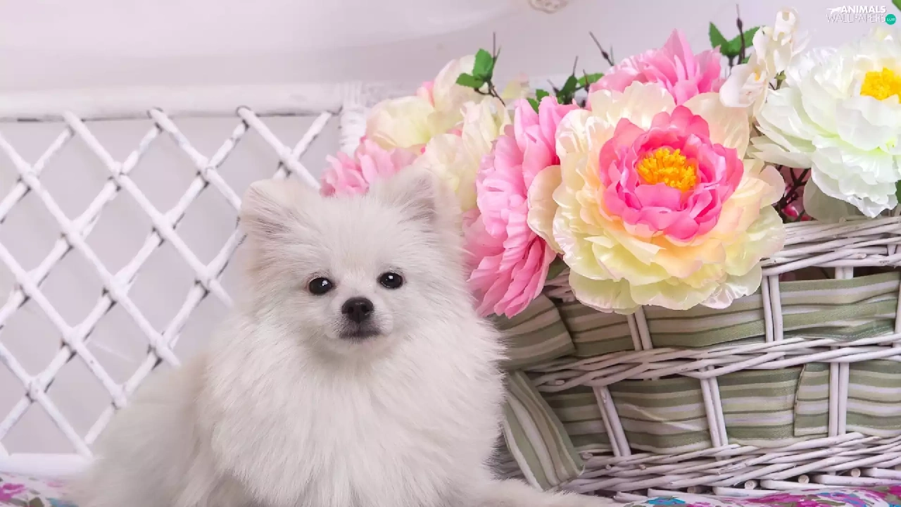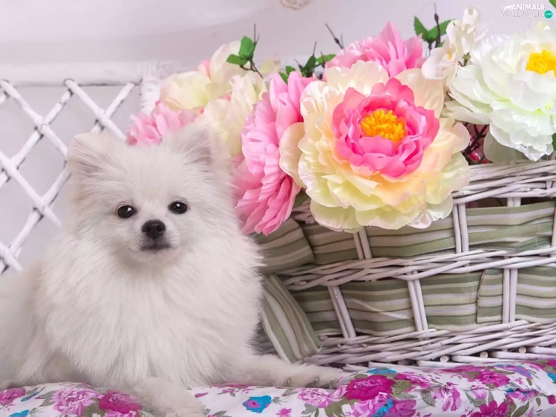 basket, Toy Spitz, Peonies, White, dog, Flowers, Hurdle