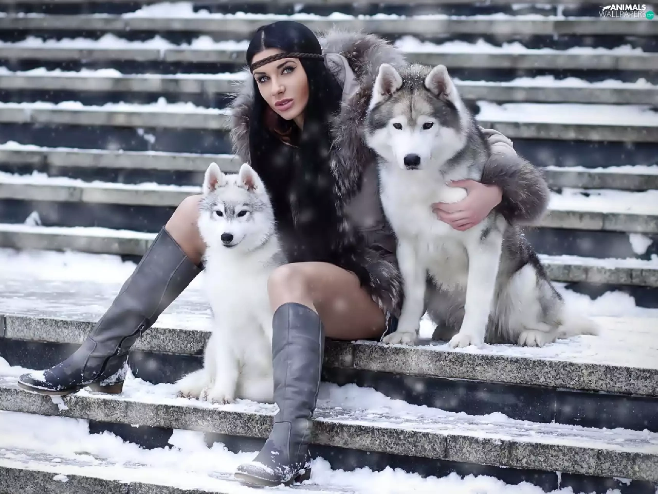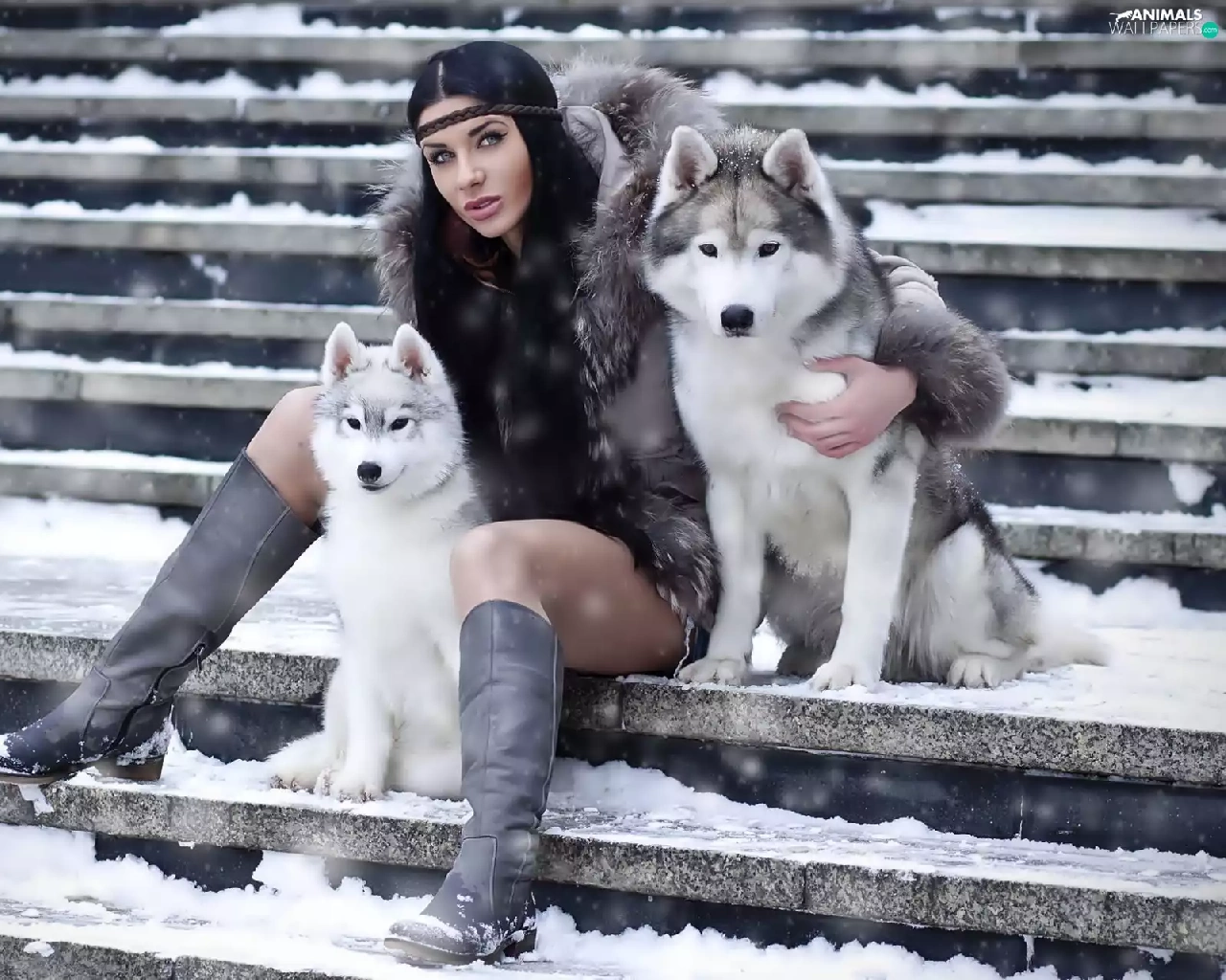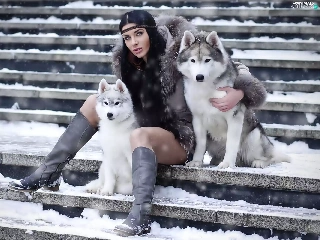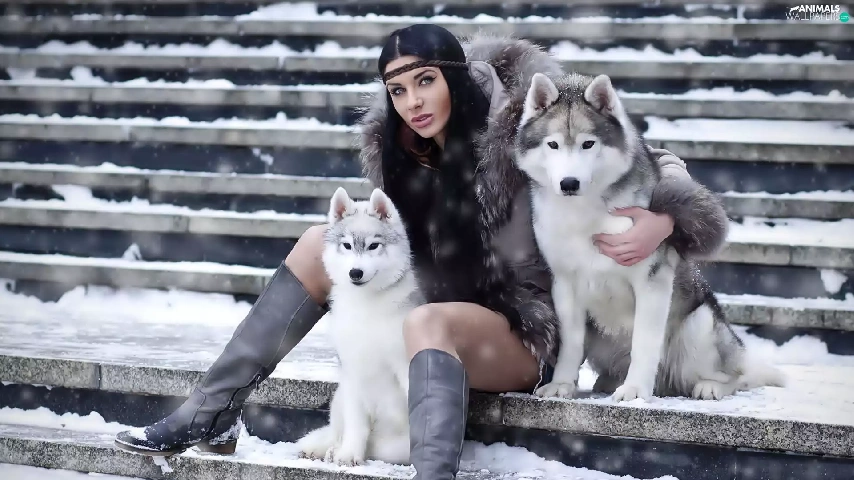 Women, puppies, Siberian Husky, Two cars