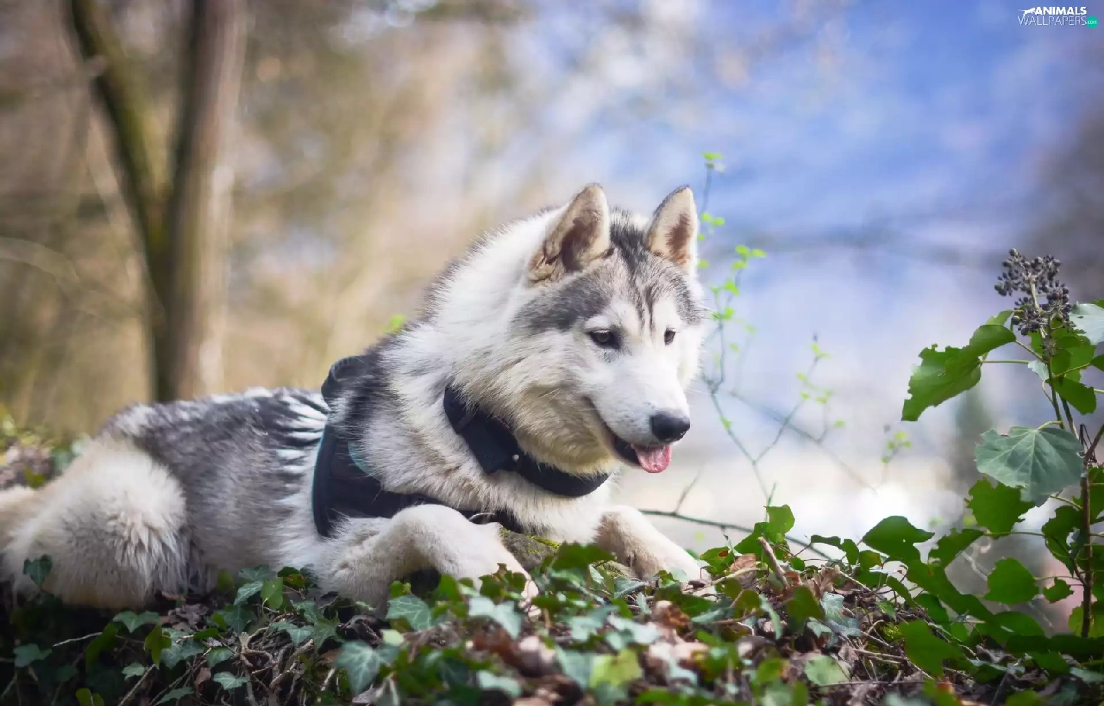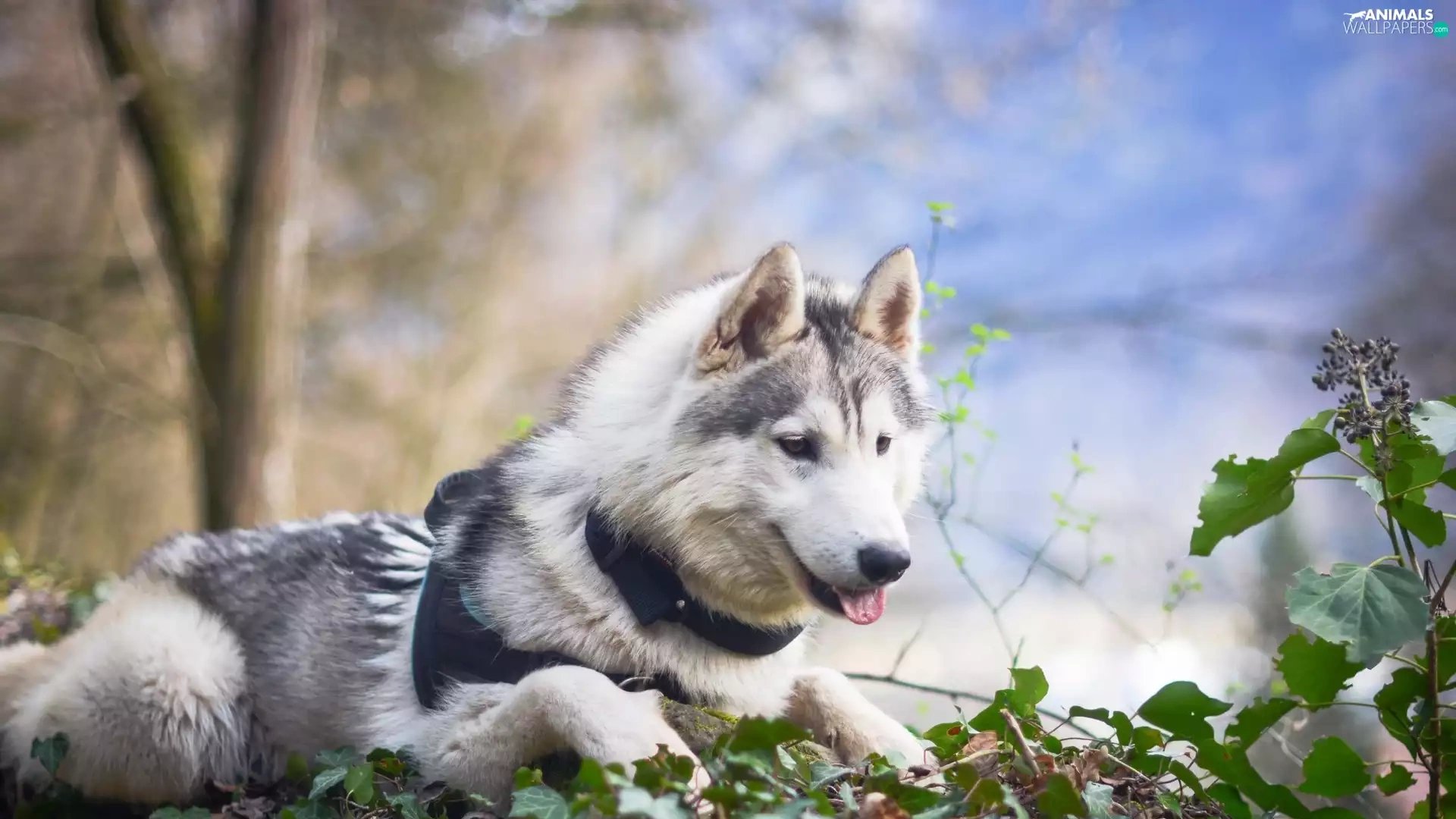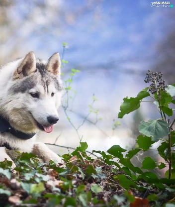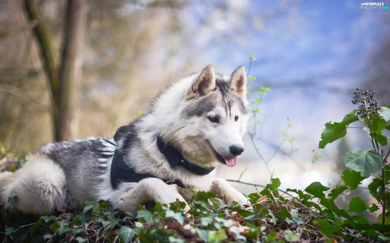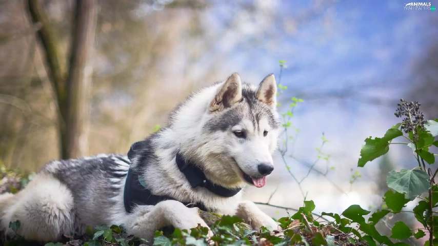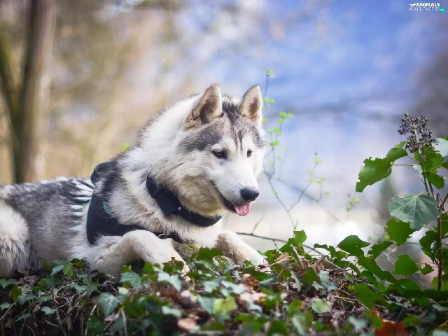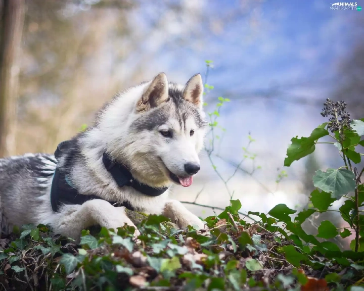 viewes, Leaf, Siberian Husky, trees, dog