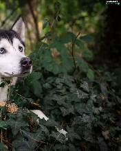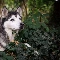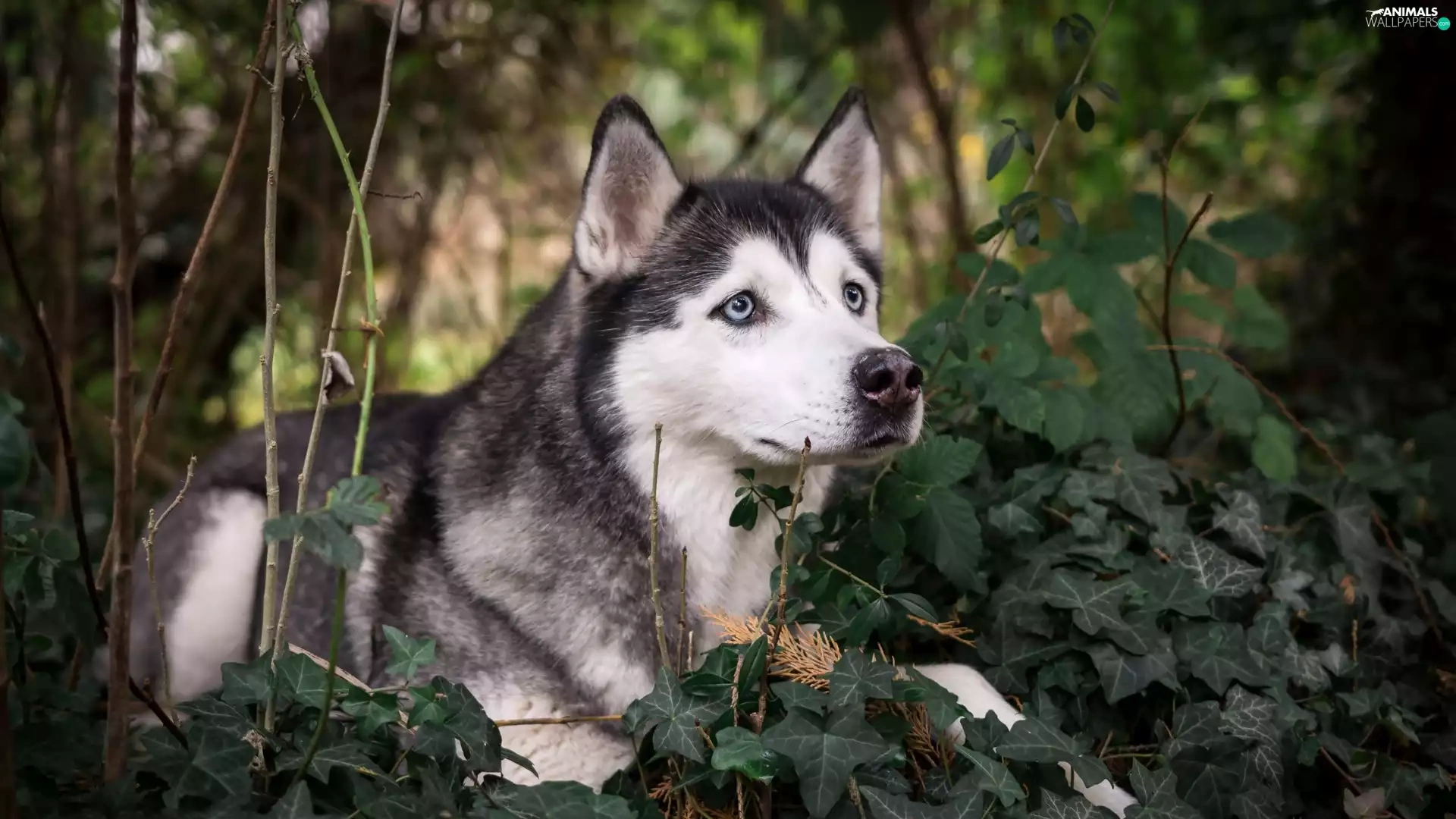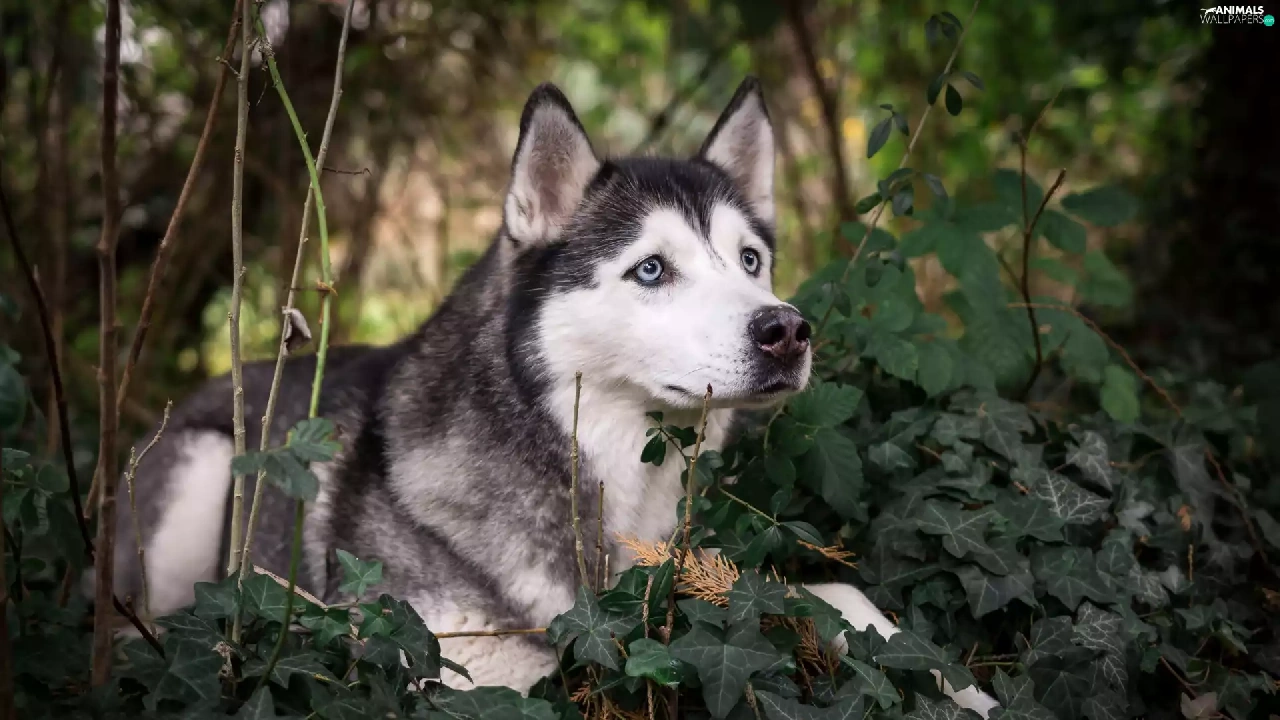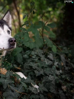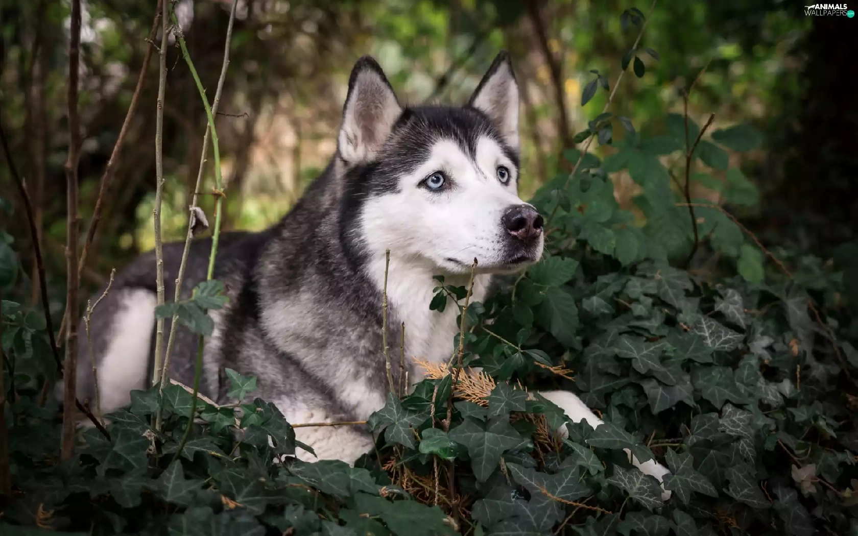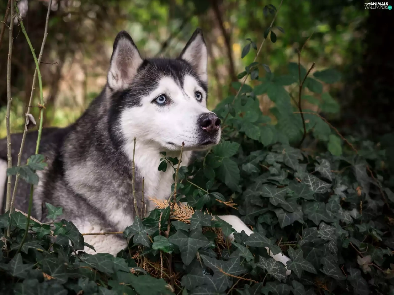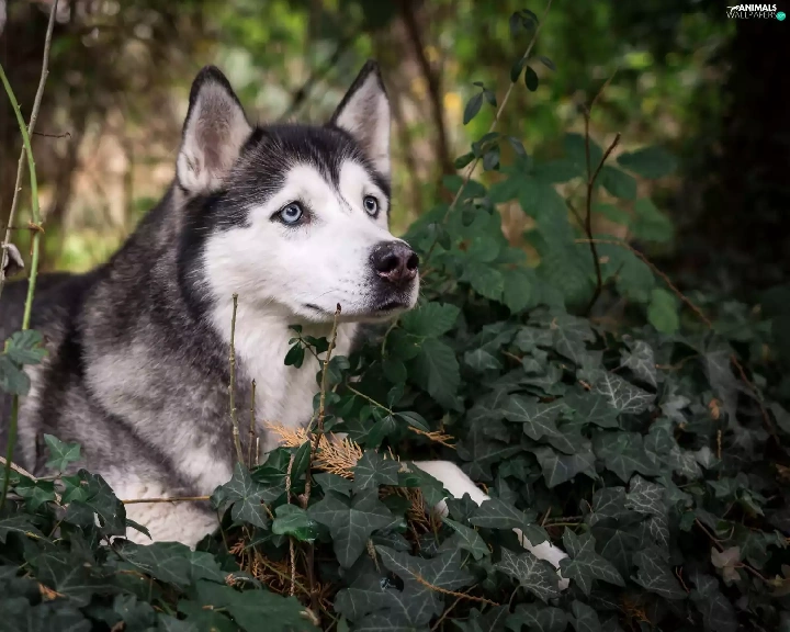 Siberian Husky, Twigs, ivy, Plants