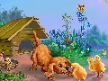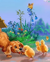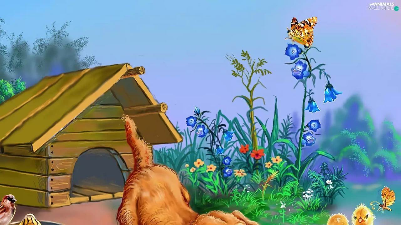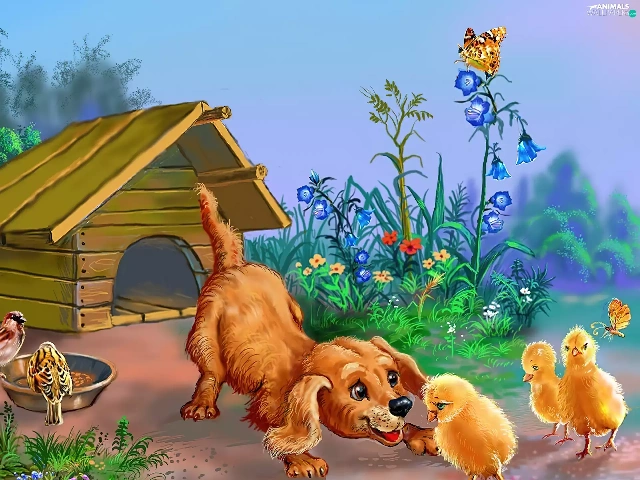 hut, dog, chickens