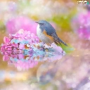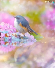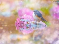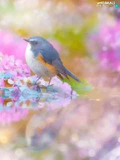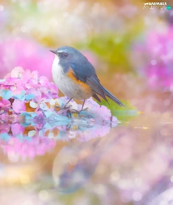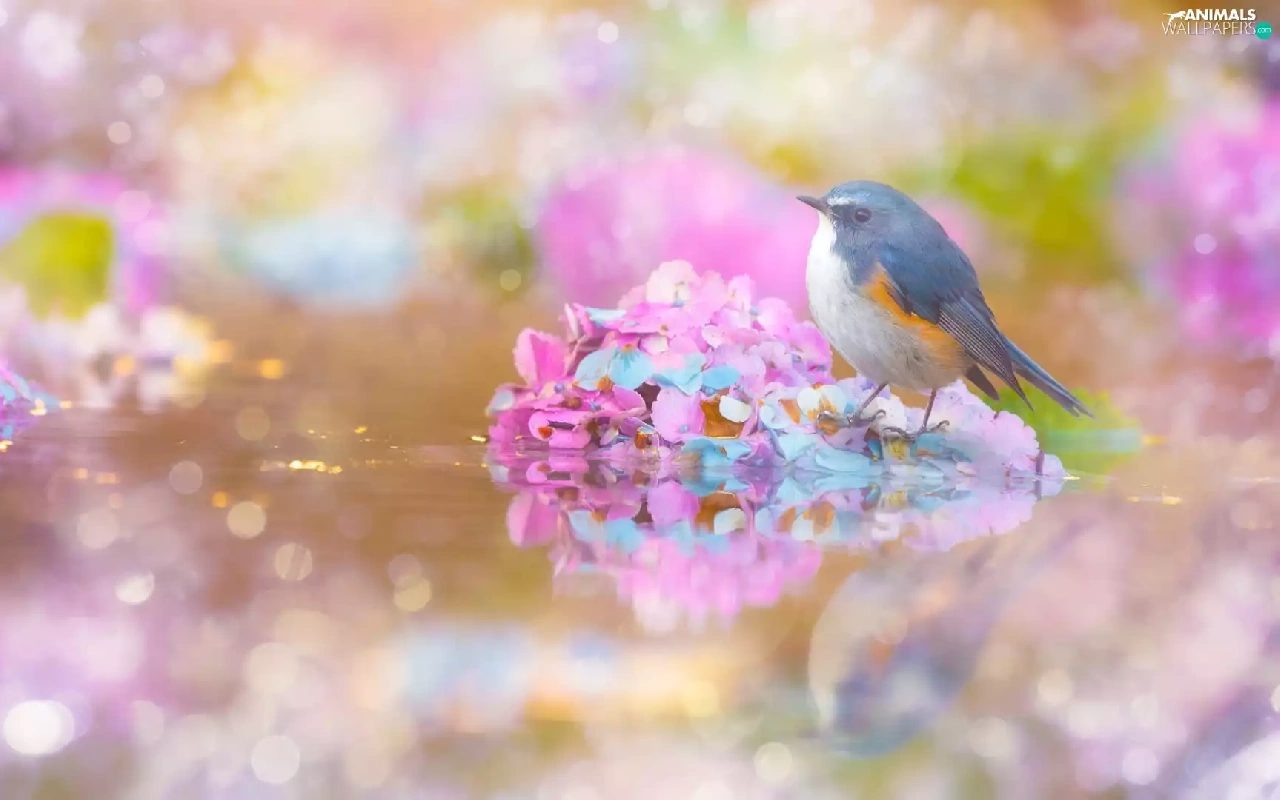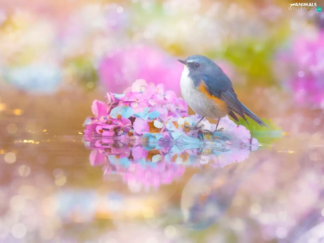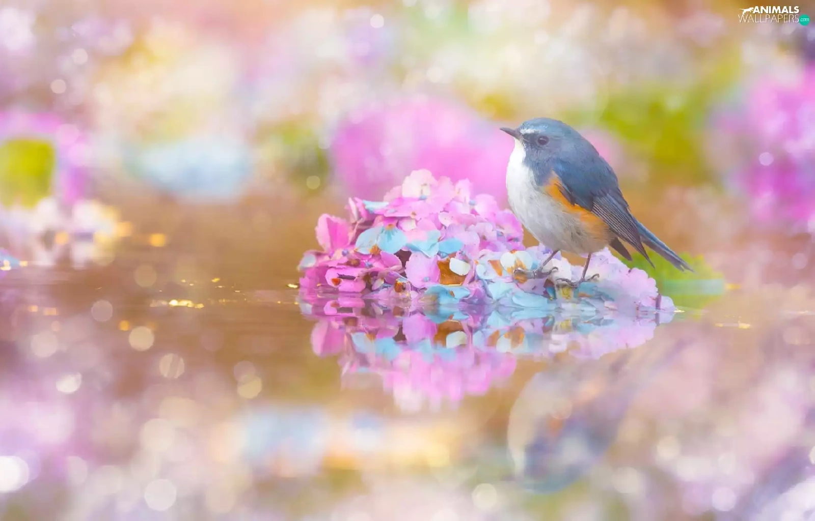 Bird, Colourfull Flowers, hydrangea, Red-flanked Bluetail