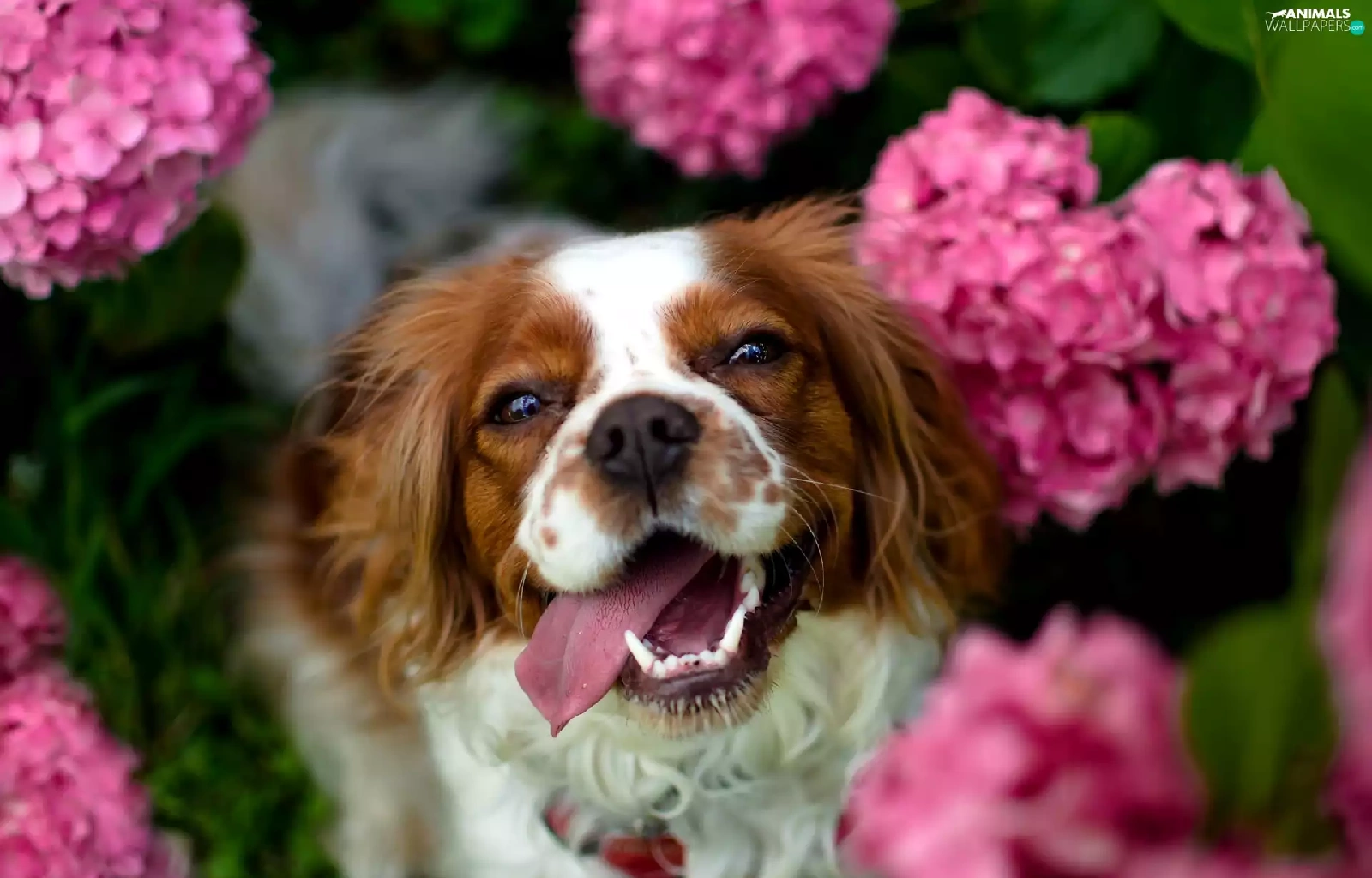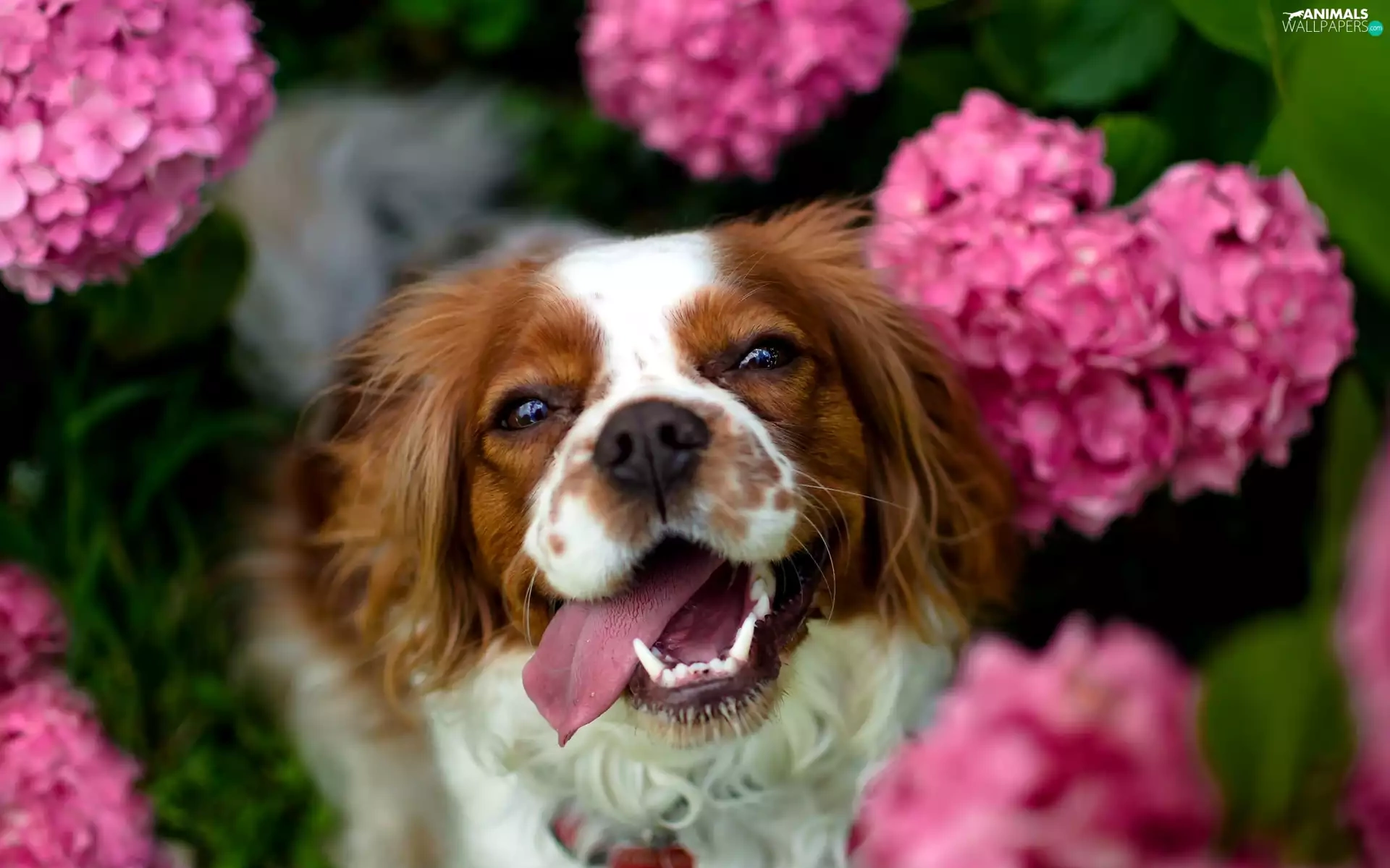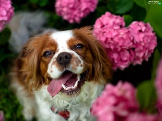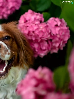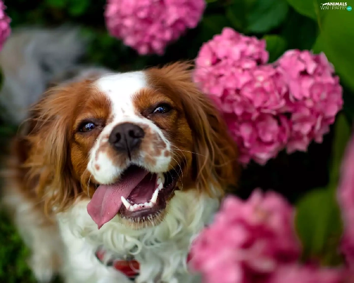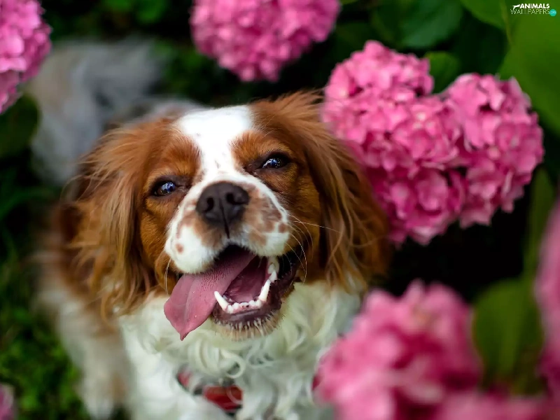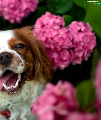 fuzzy, background, Pink, hydrangeas, Welsh Springer Spaniel