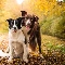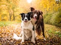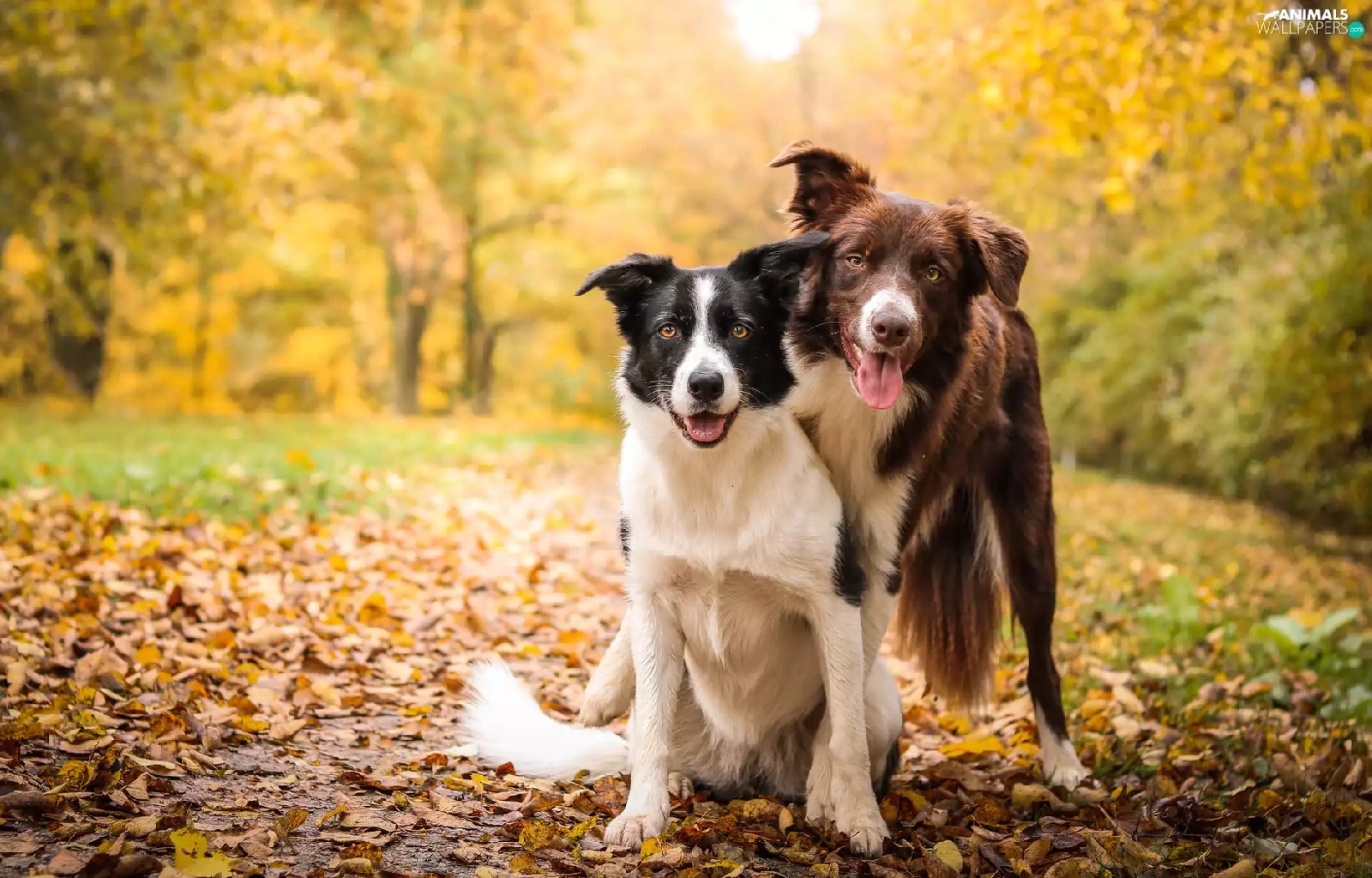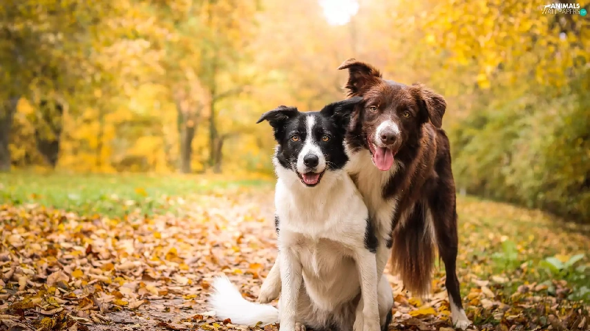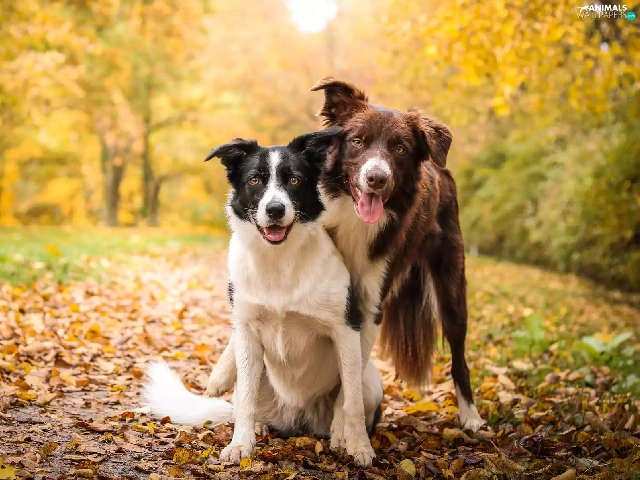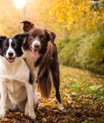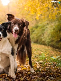 Border Collie, car in the meadow, Bush, Leaf, viewes, Dogs, Two cars, trees