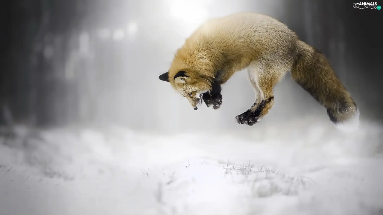 Fox, hunting, jump, snow