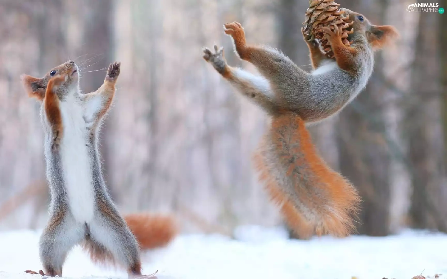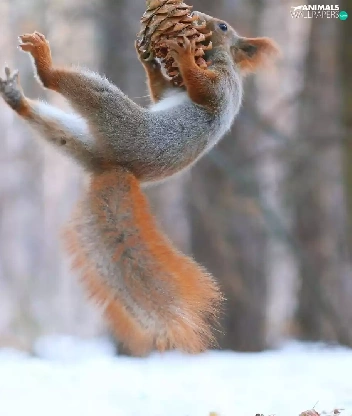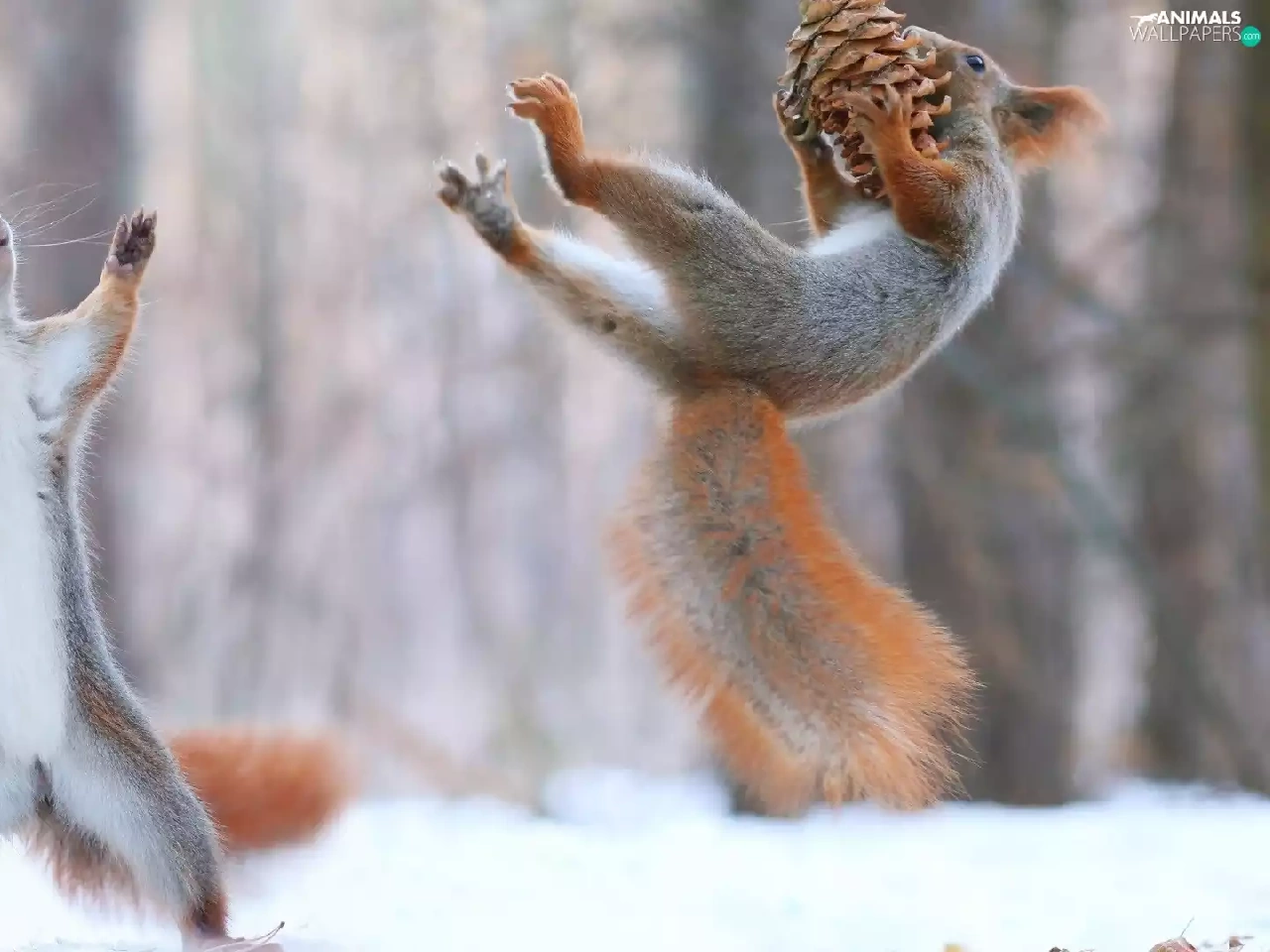 cone, jump, squirrels, winter, Two