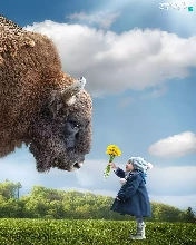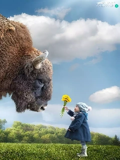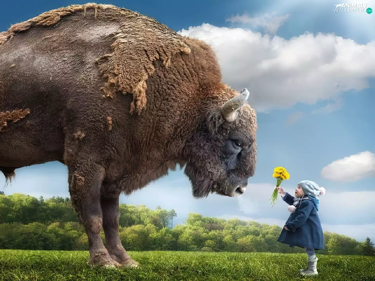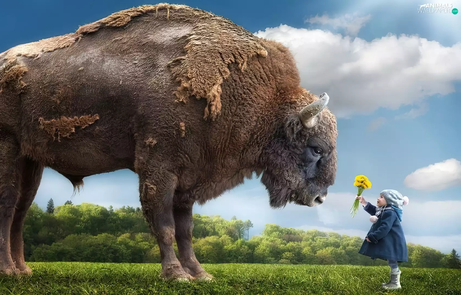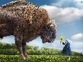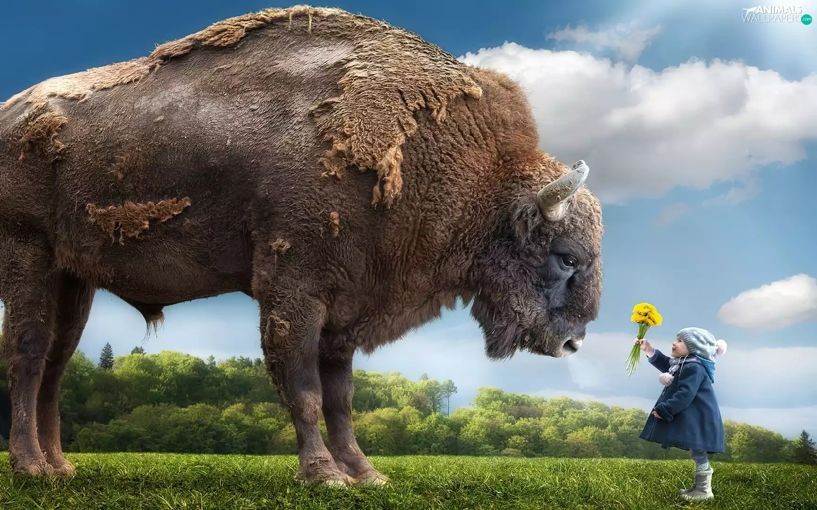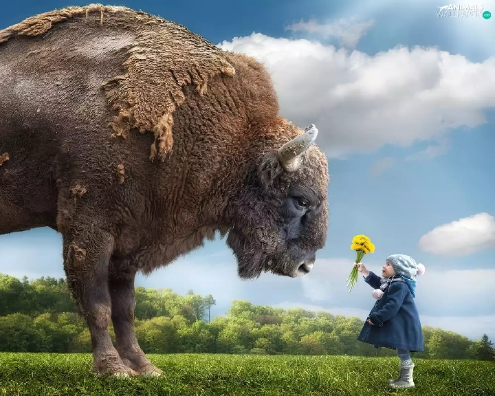 Bison, Flowers, grass, Kid