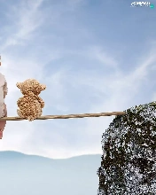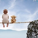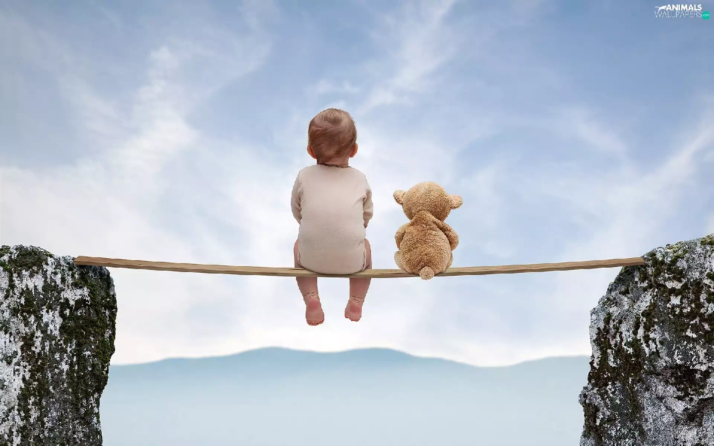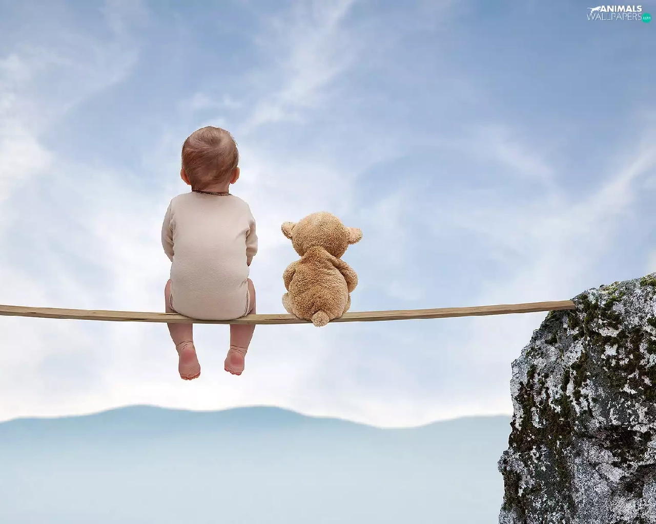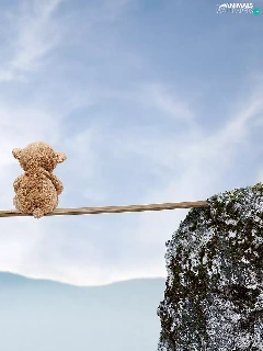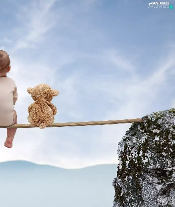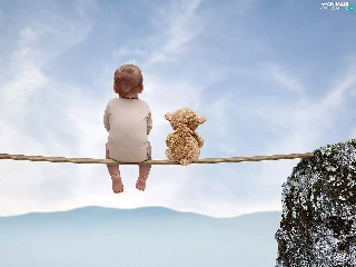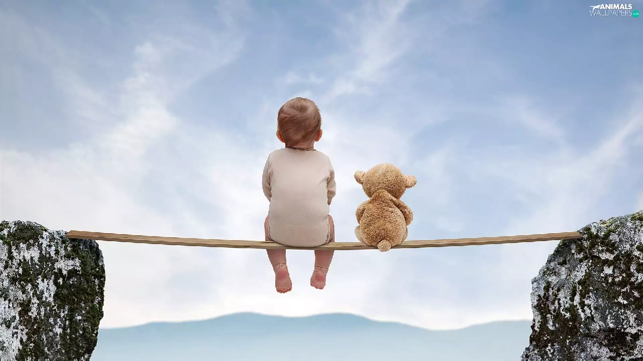 Mountains, Kid, teddy bear, rocks
