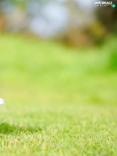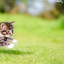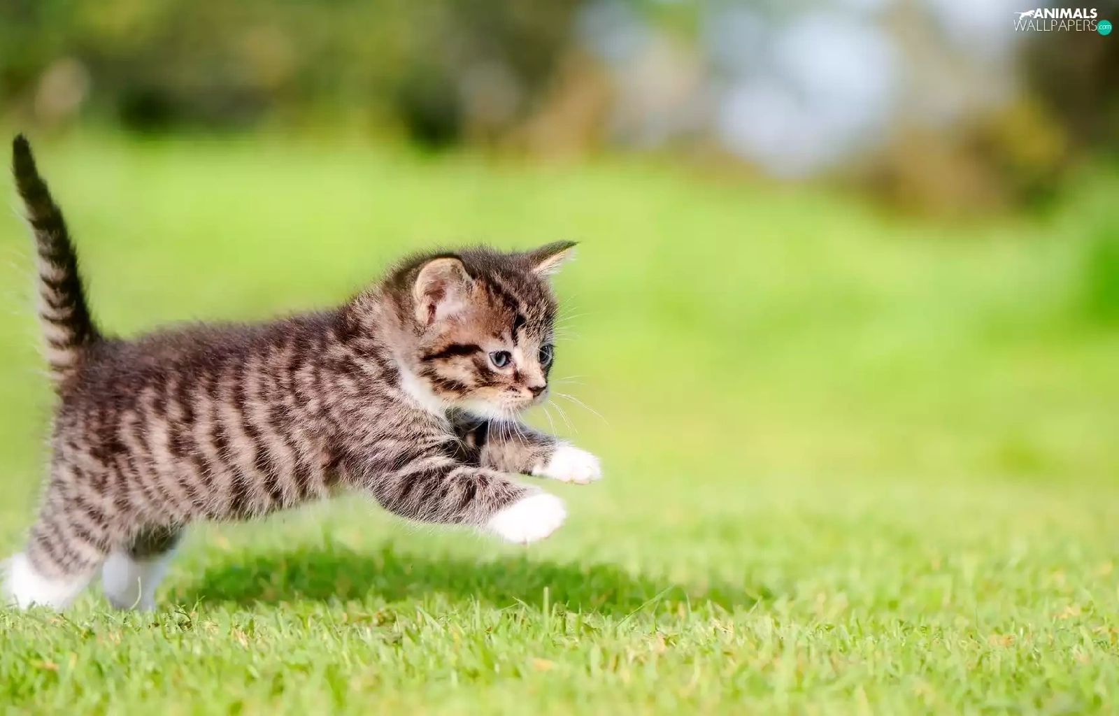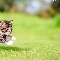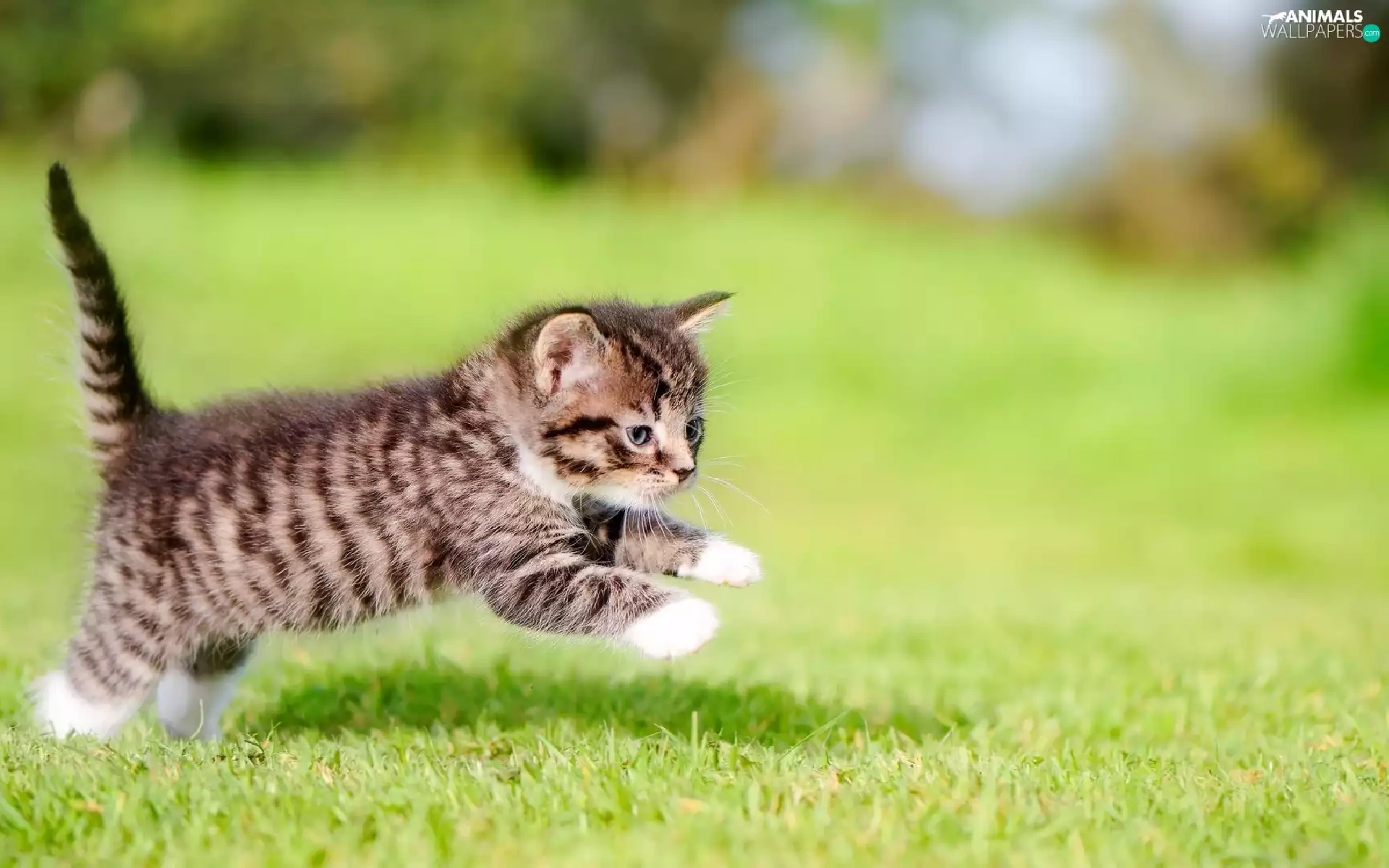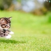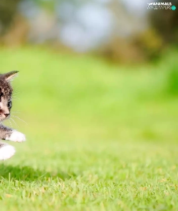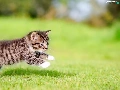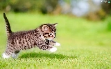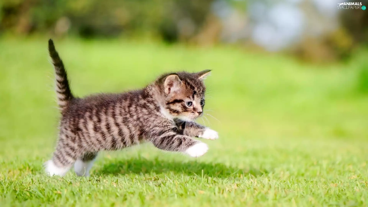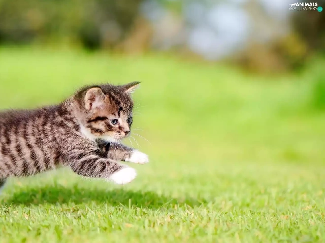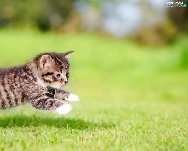 jump, striped, fuzzy, kitten, small, grass, background