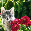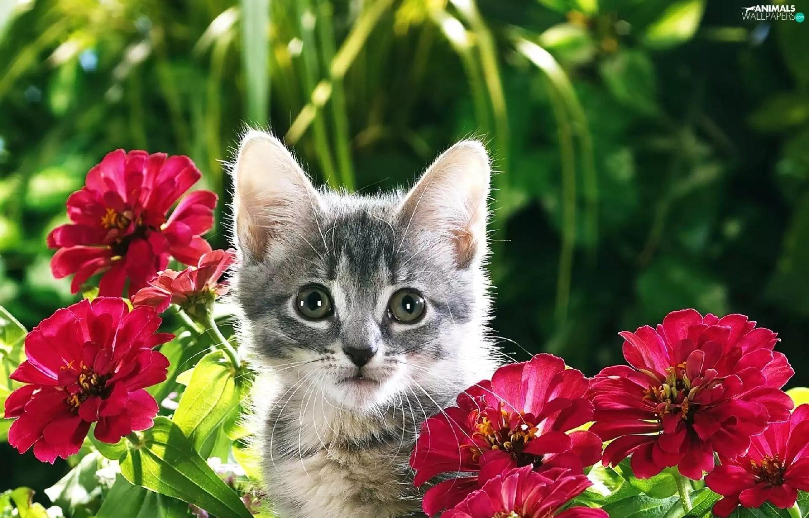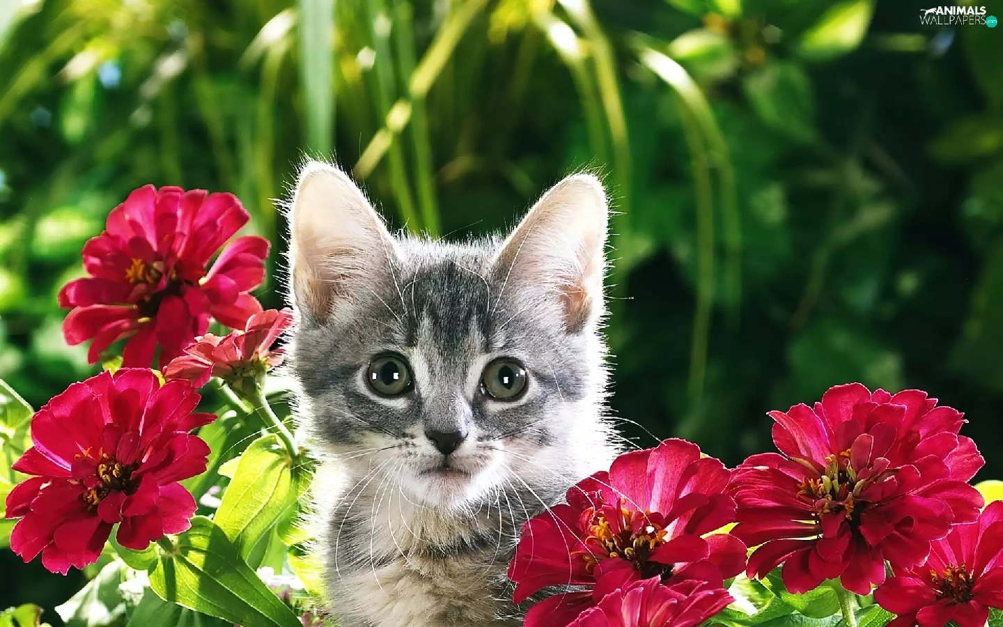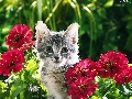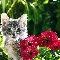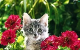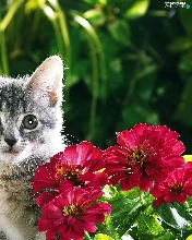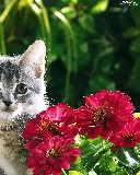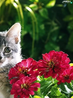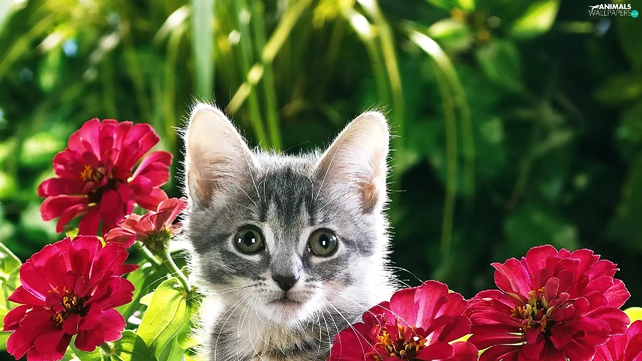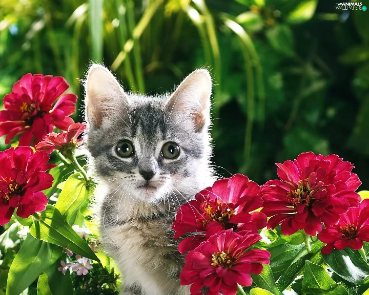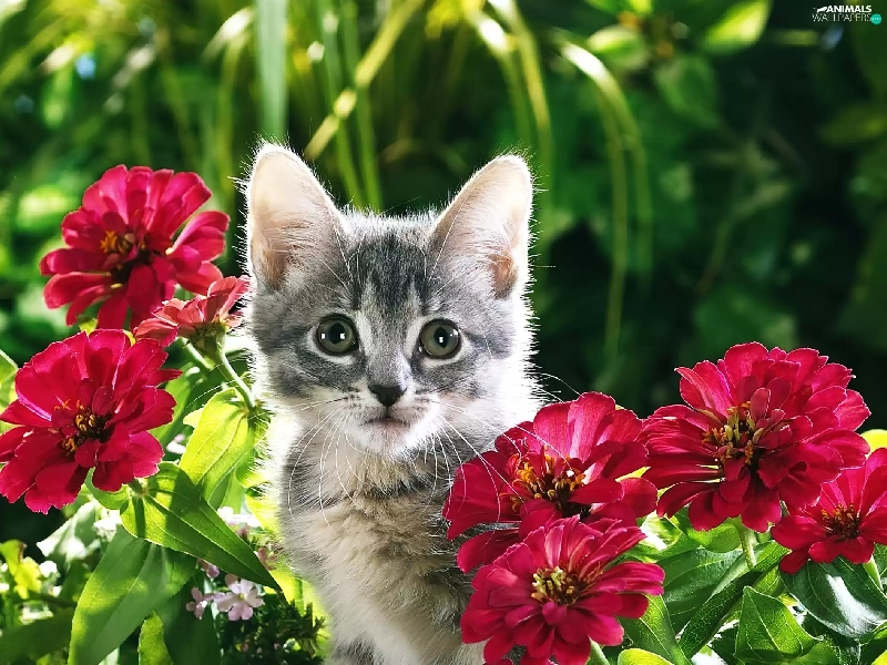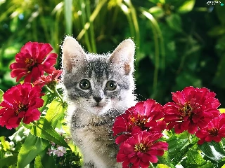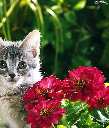 Gray, Flowers, Zinnias, kitten