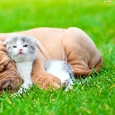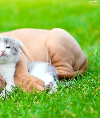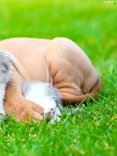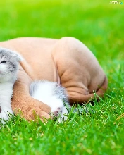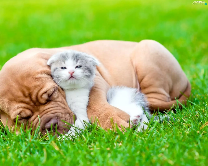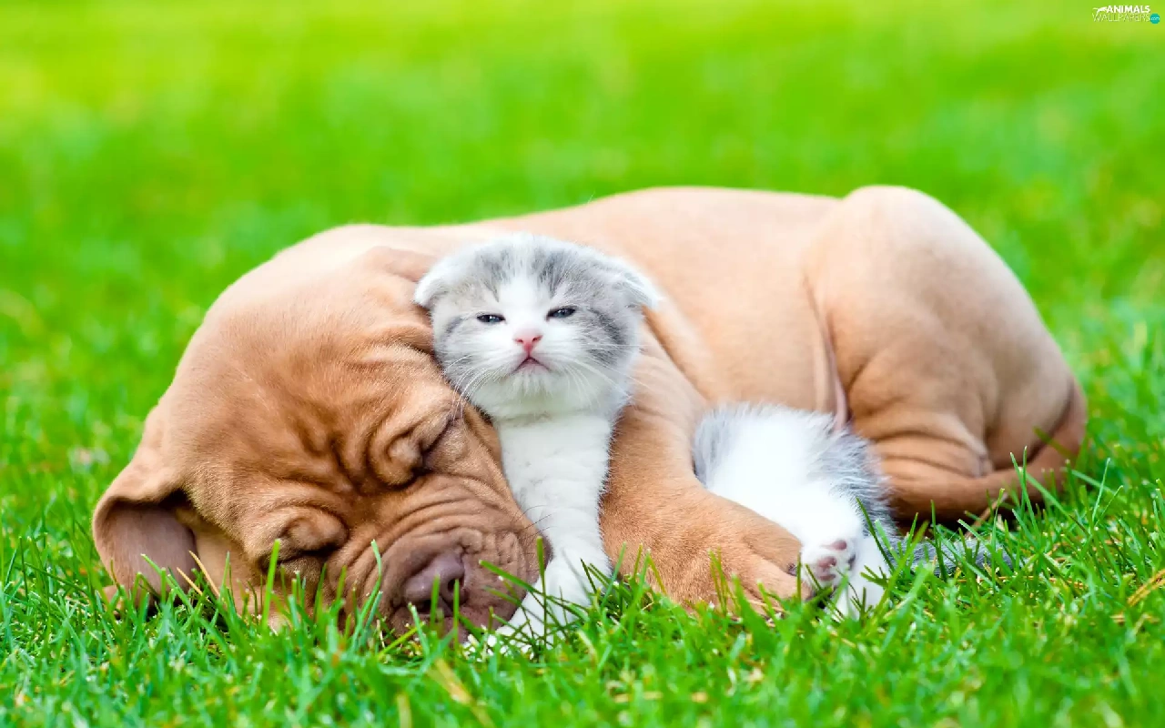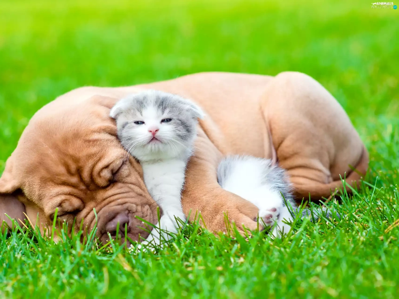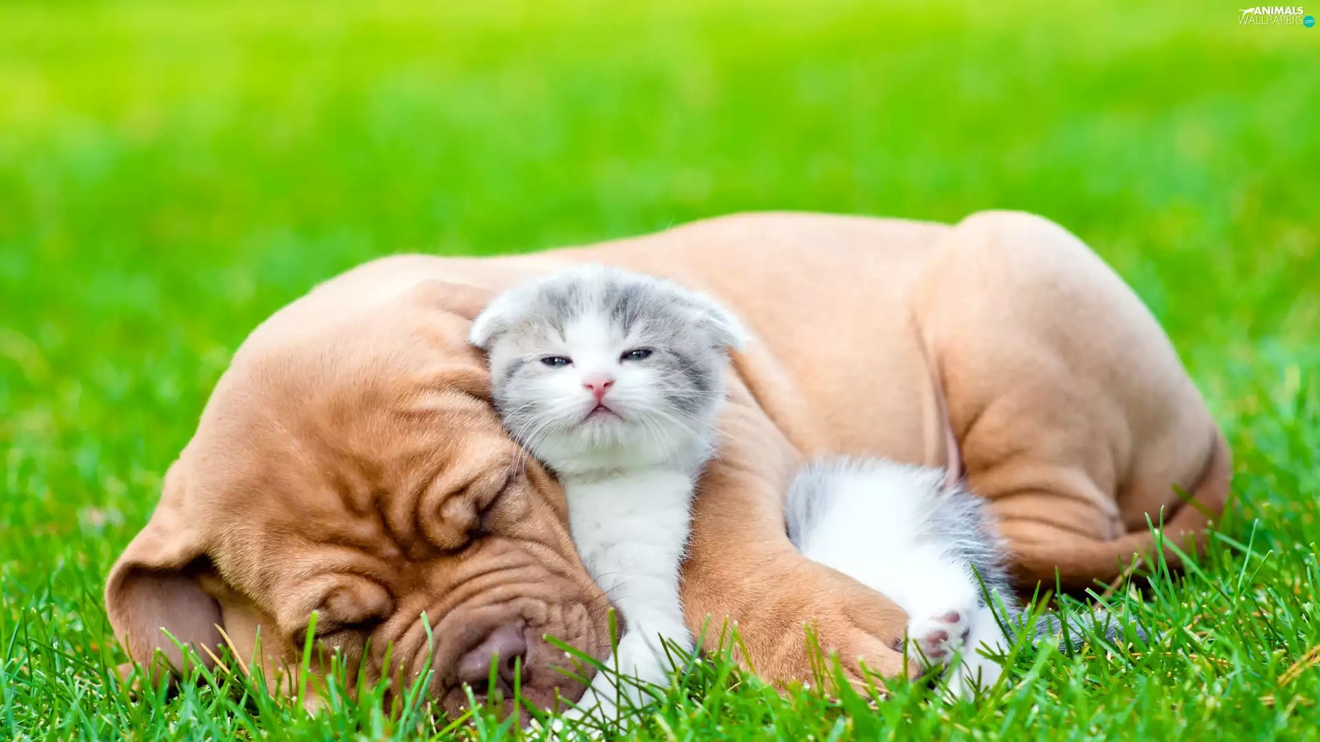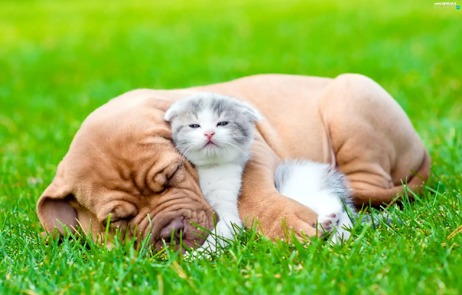 kitten, Dog de Bordeaux, grass, dream, Scottish Fold, small