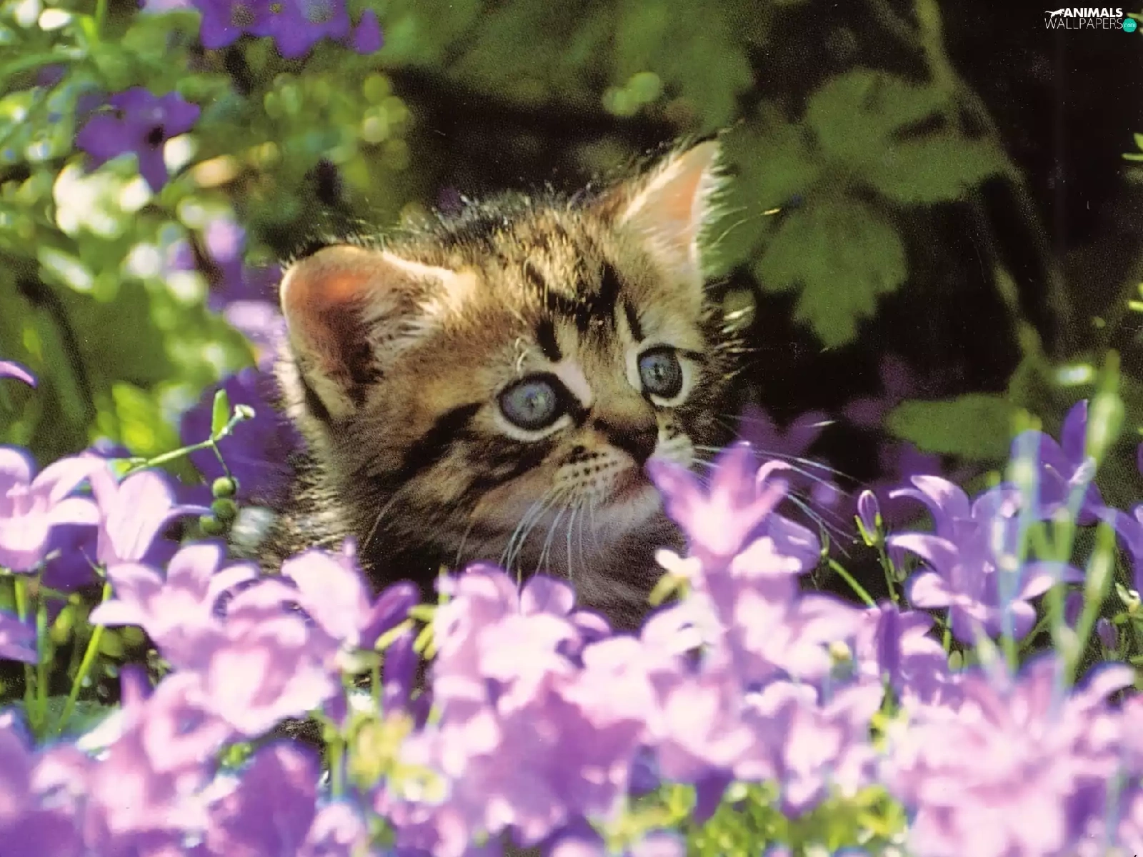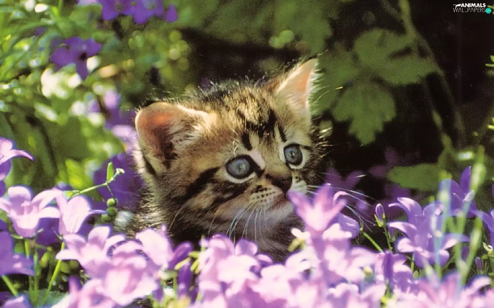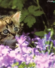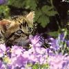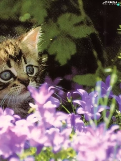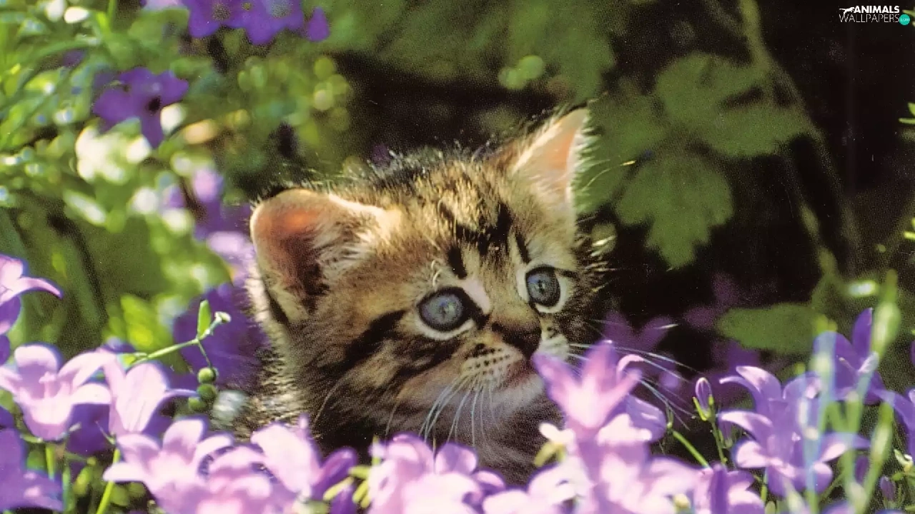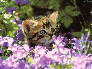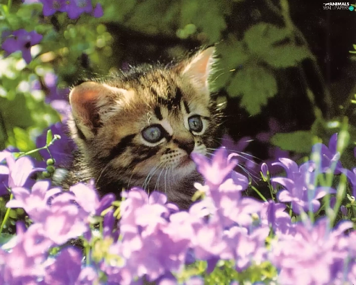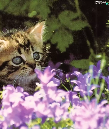small, purple, Flowers, kitten