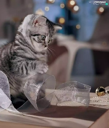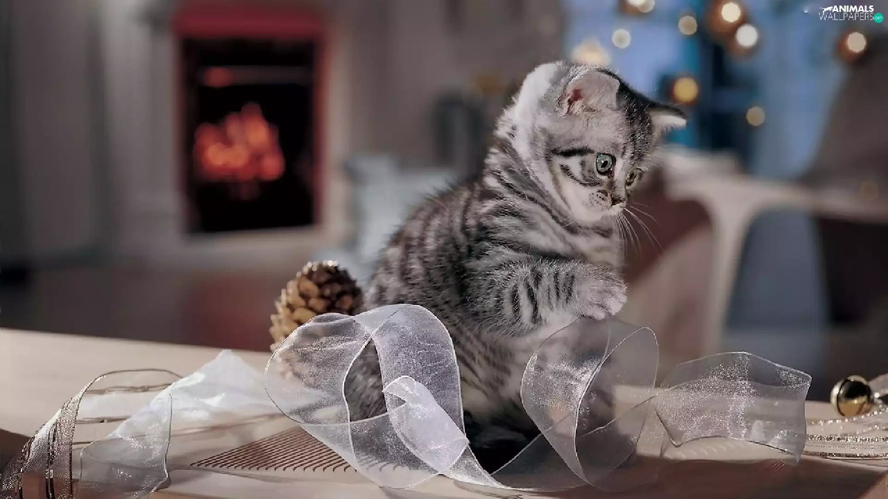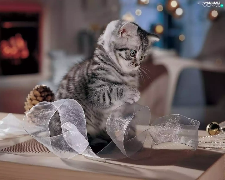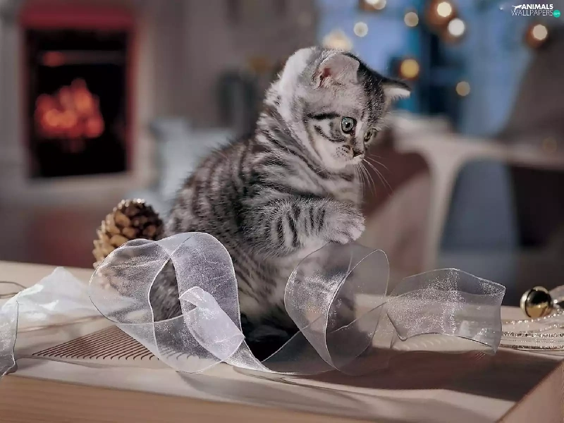 small, ribbon, play, kitten