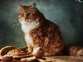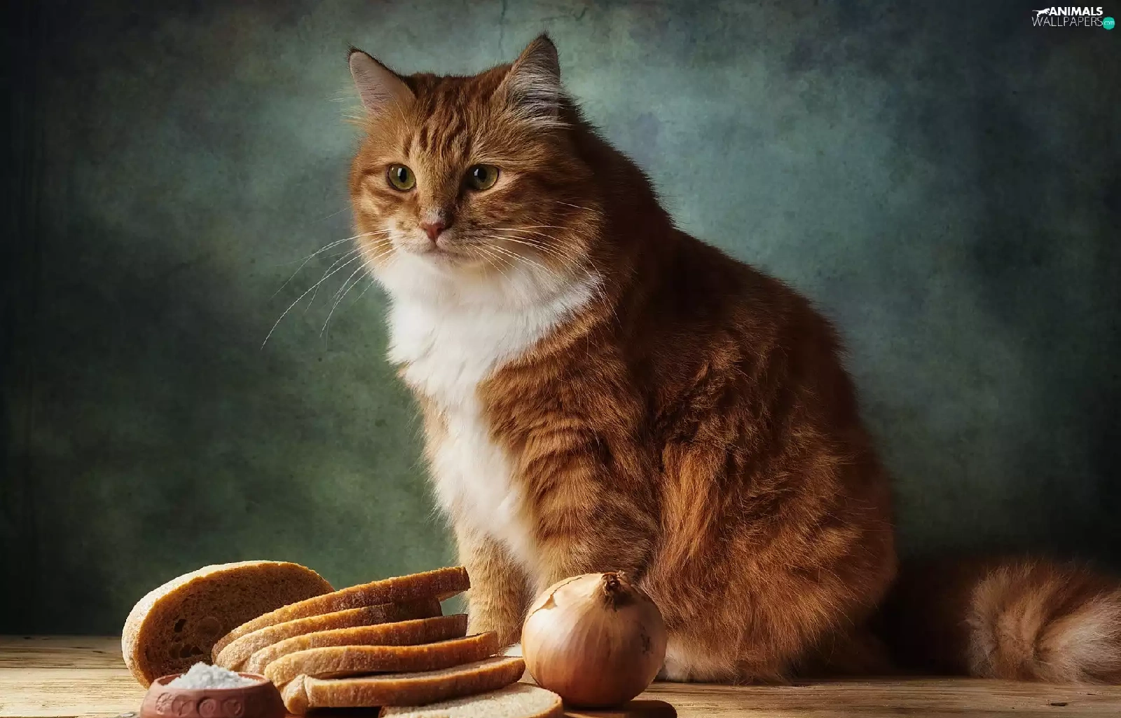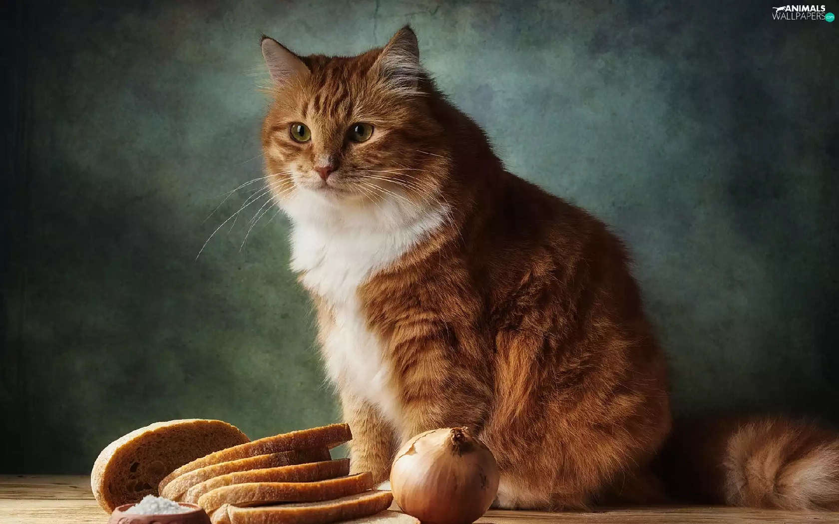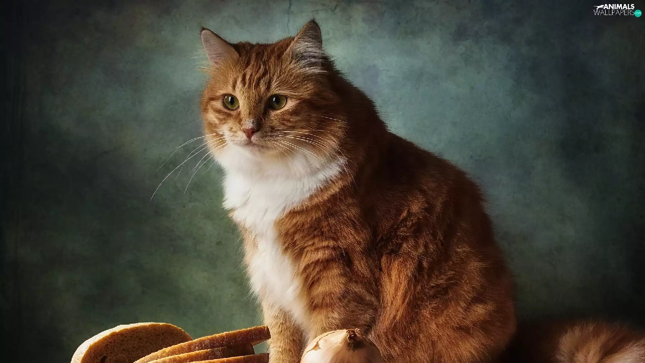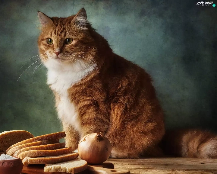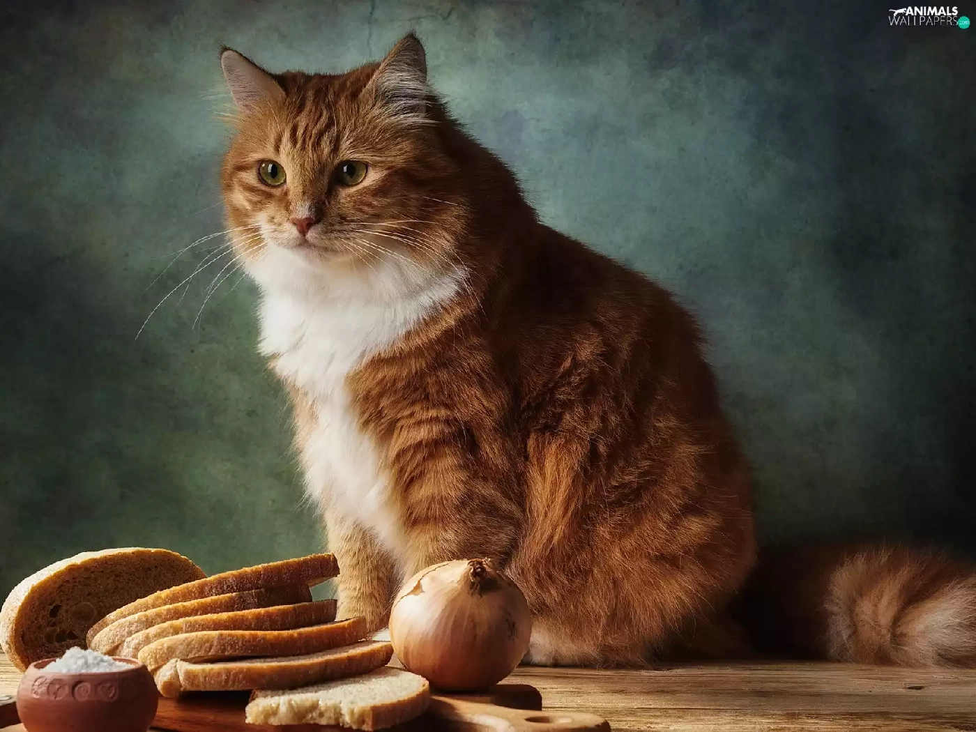 bread, cat, salt, Table, Red-white, onion, knife