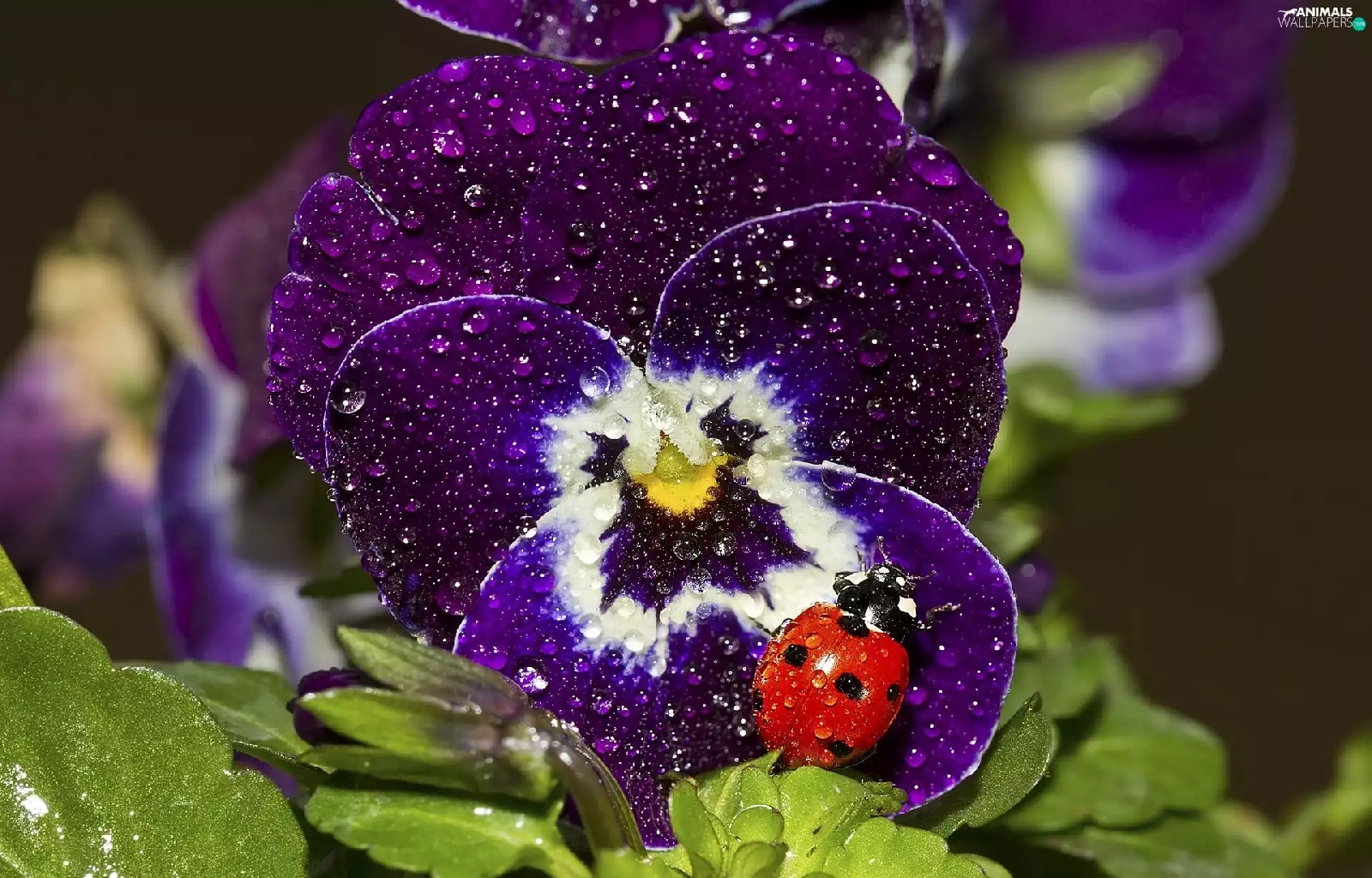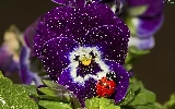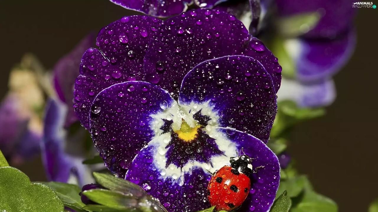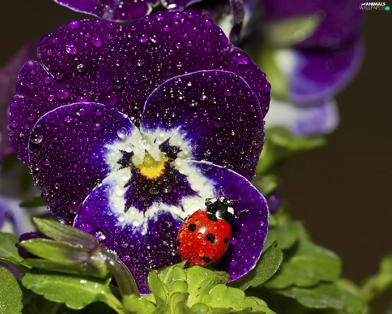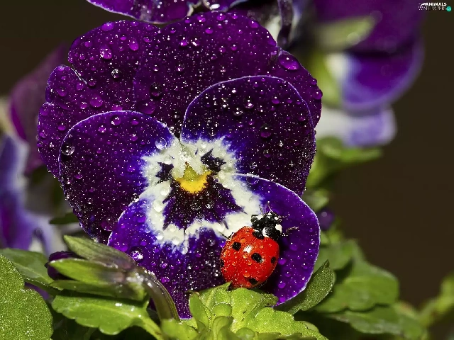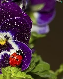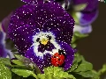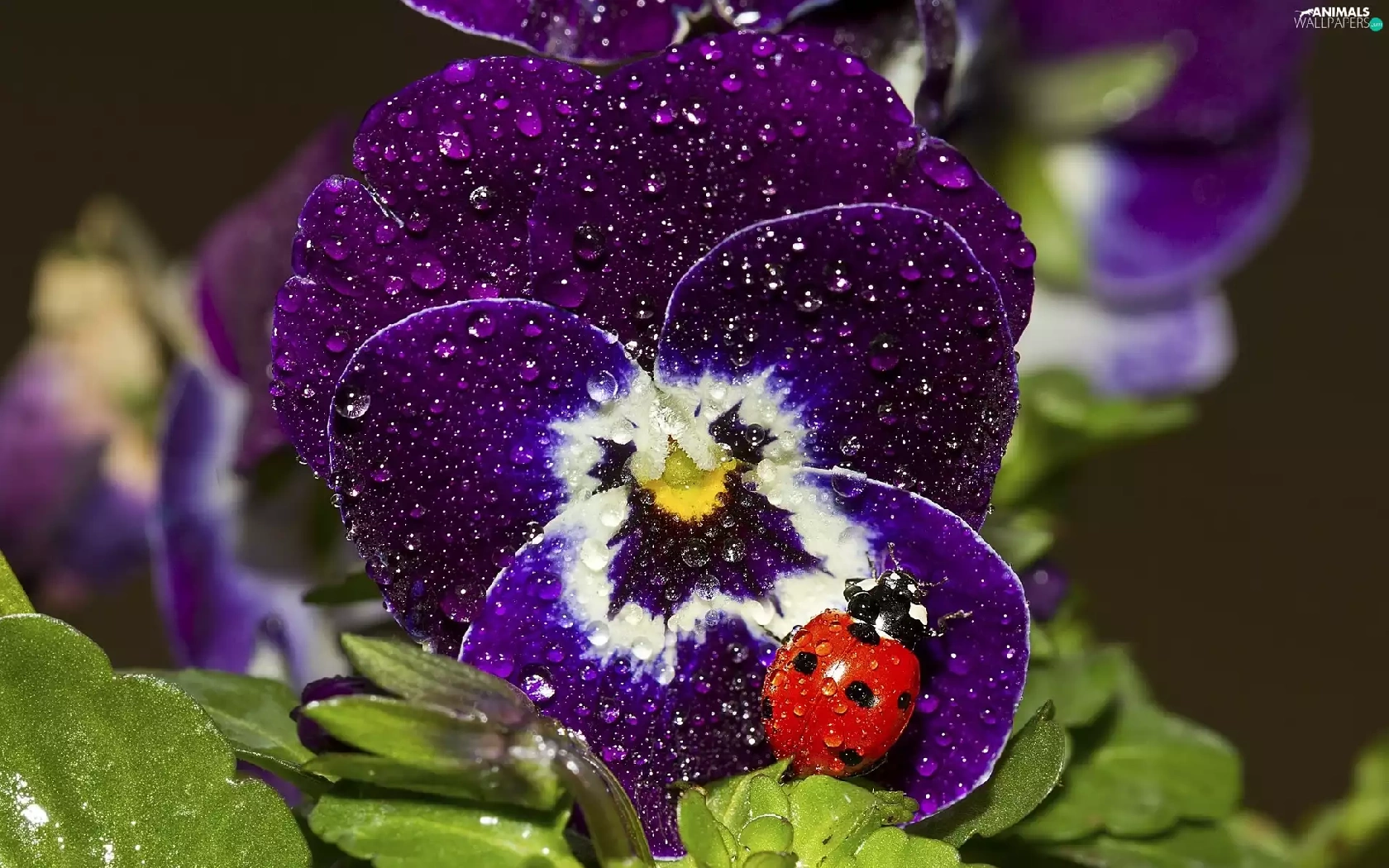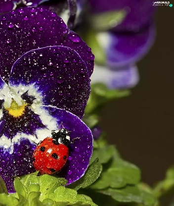 rain, ladybird, pansy, drops, claret